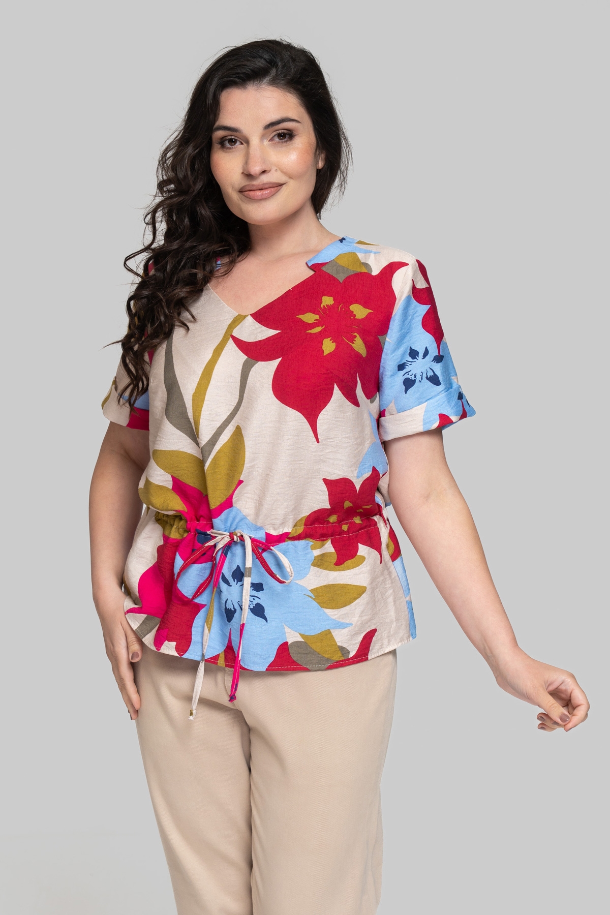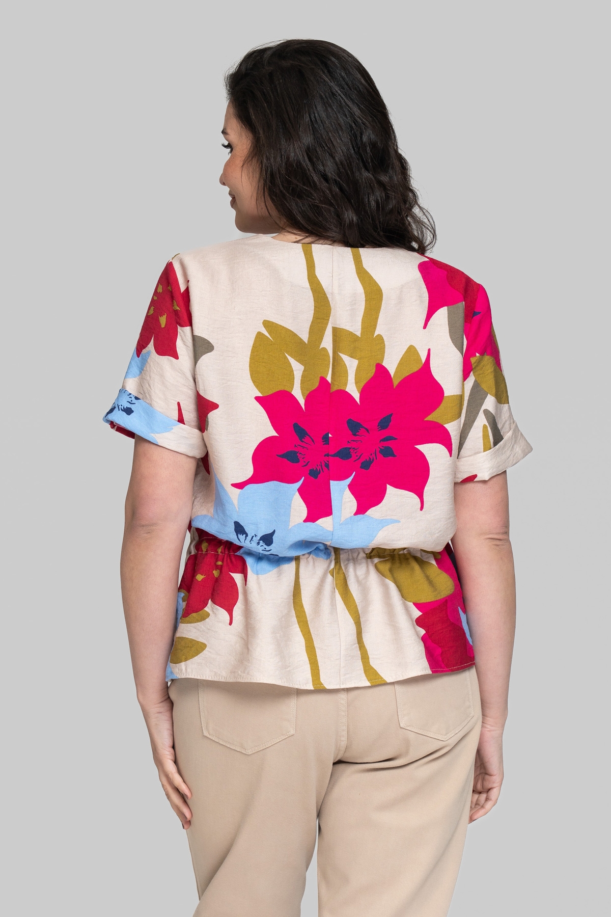 Блуза прямого силуэта без подкладки с V-образным вырезом. Выполнена из штапеля. Ткань легкая и тактильно приятная, но также обладает повышенной прочностью и практичностью, что отлично подходит летним моделям для повседневного использования. Рукав втачной, одношовный. По линии талии выполнена кулиса с шнуром.
