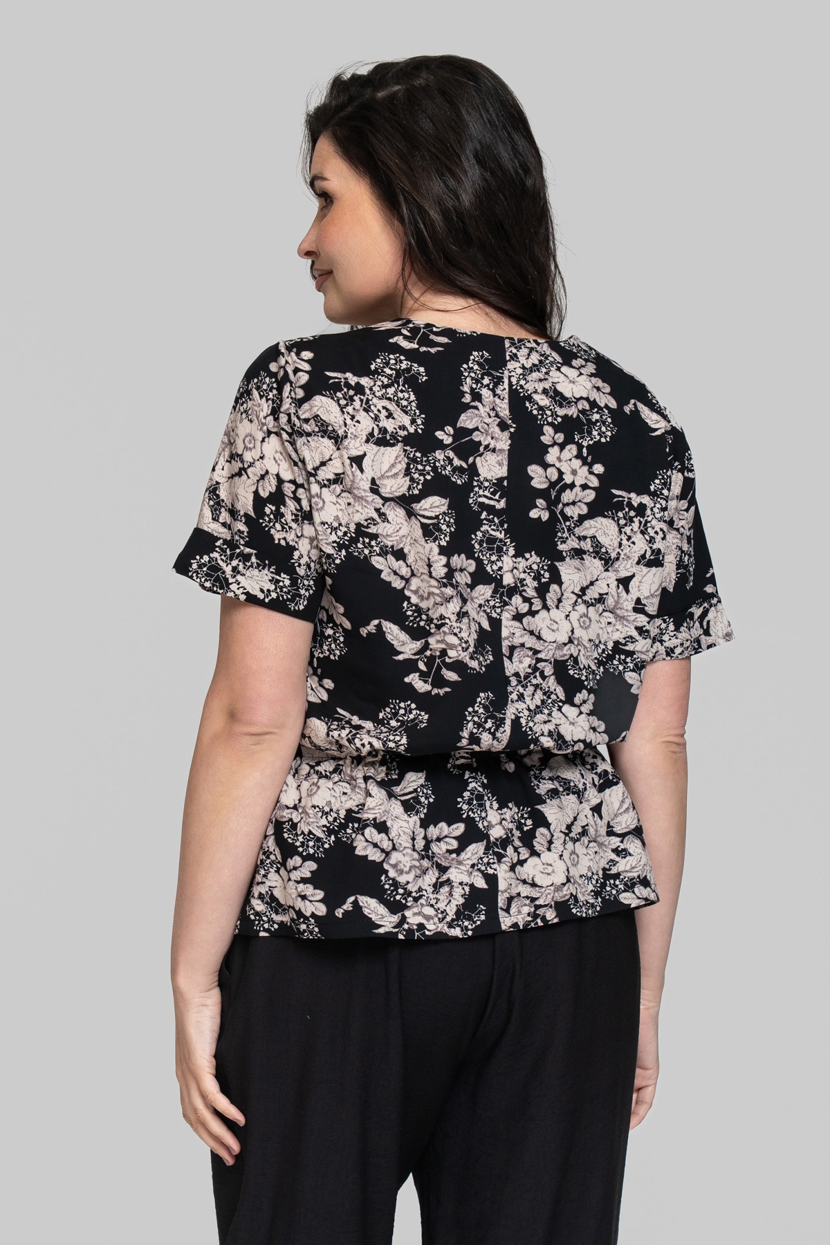 Блуза прямого силуэта без подкладки с V-образным вырезом. Выполнена из штапеля. Ткань легкая и тактильно приятная, но также обладает повышенной прочностью и практичностью, что отлично подходит летним моделям для повседневного использования. Рукав втачной, одношовный. По линии талии выполнена кулиса с шнуром.