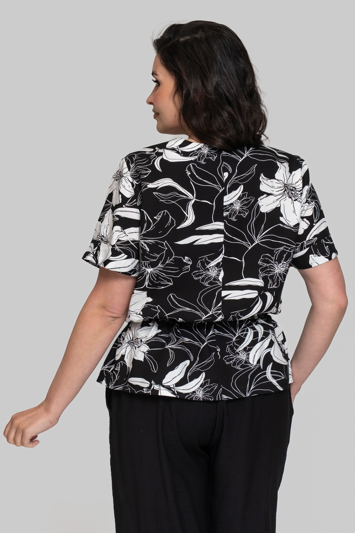Блуза прямого силуэта без подкладки с V-образным вырезом. Выполнена из штапеля. Ткань легкая и тактильно приятная, но также обладает повышенной прочностью и практичностью, что отлично подходит летним моделям для повседневного использования. Рукав втачной, одношовный. По линии талии выполнена кулиса с шнуром.