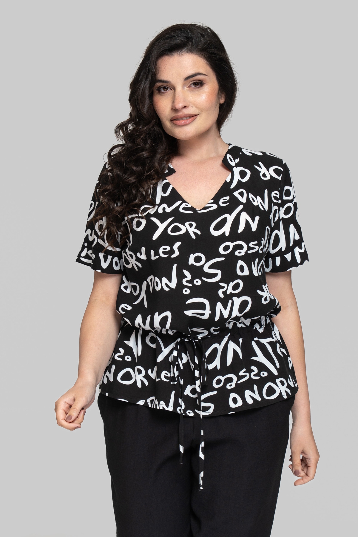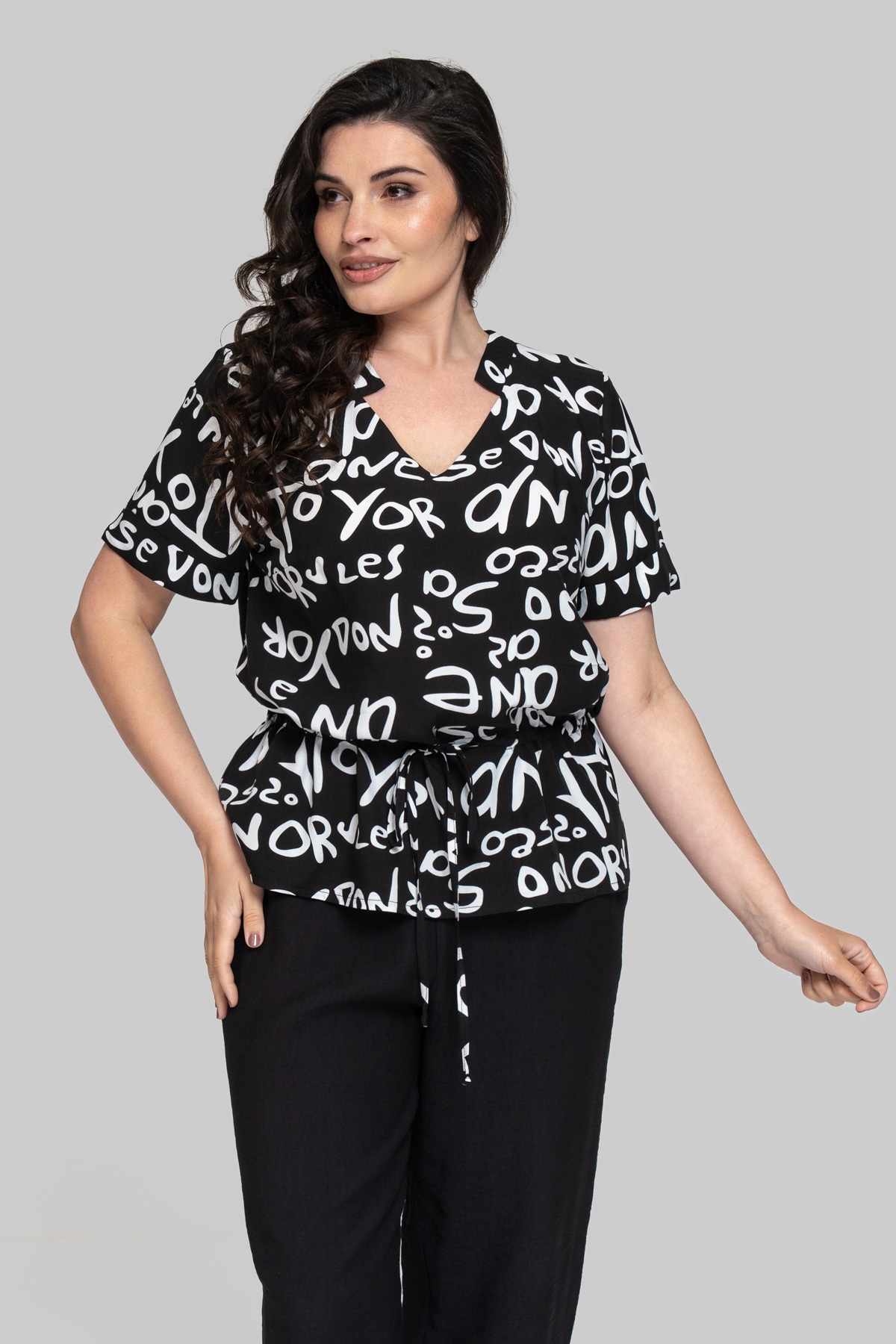 Блуза прямого силуэта без подкладки с V-образным вырезом. Выполнена из штапеля. Ткань легкая и тактильно приятная, но также обладает повышенной прочностью и практичностью, что отлично подходит летним моделям для повседневного использования. Рукав втачной, одношовный. По линии талии выполнена кулиса с шнуром.
