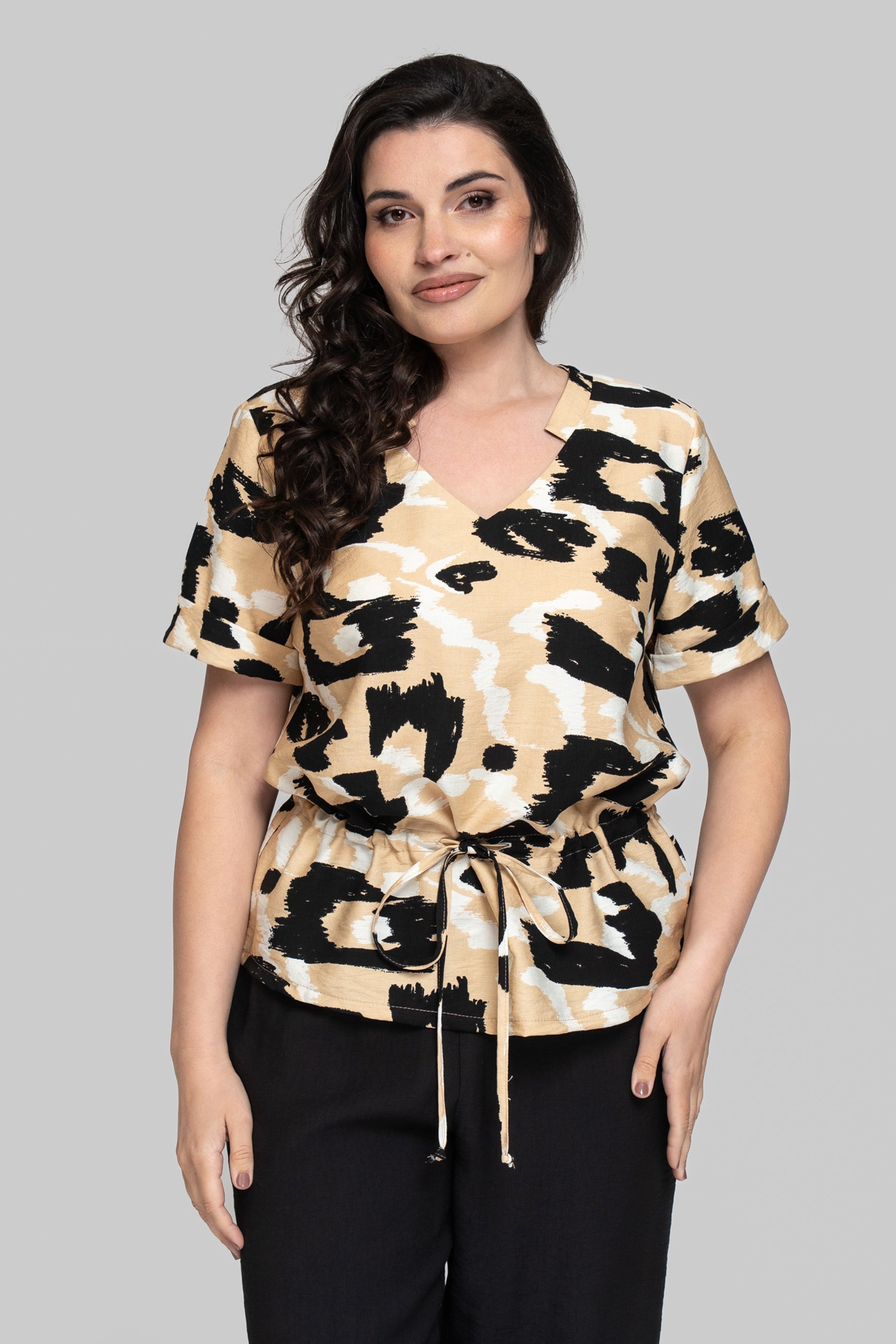 Блуза прямого силуэта без подкладки с V-образным вырезом. Выполнена из штапеля. Ткань легкая и тактильно приятная, но также обладает повышенной прочностью и практичностью, что отлично подходит летним моделям для повседневного использования. Рукав втачной, одношовный. По линии талии выполнена кулиса с шнуром.