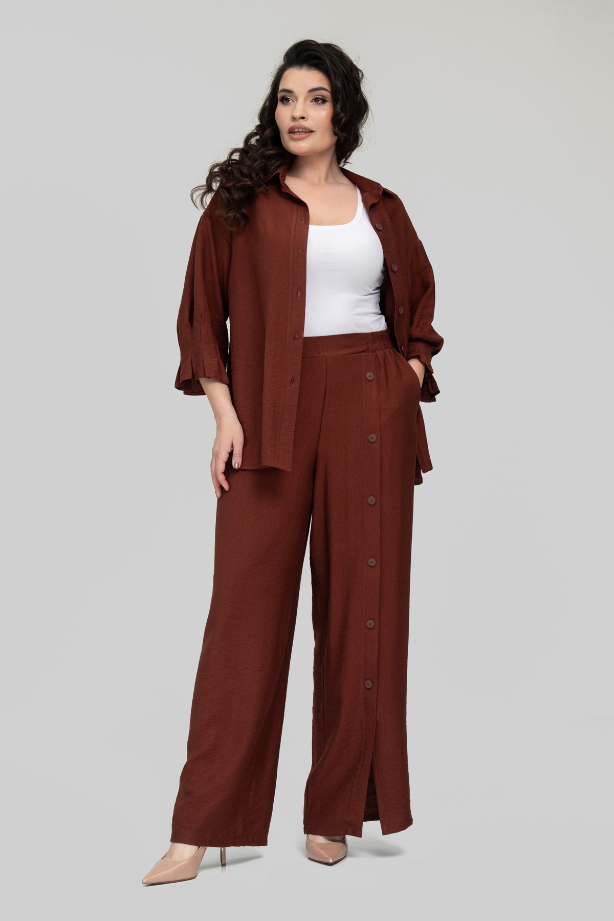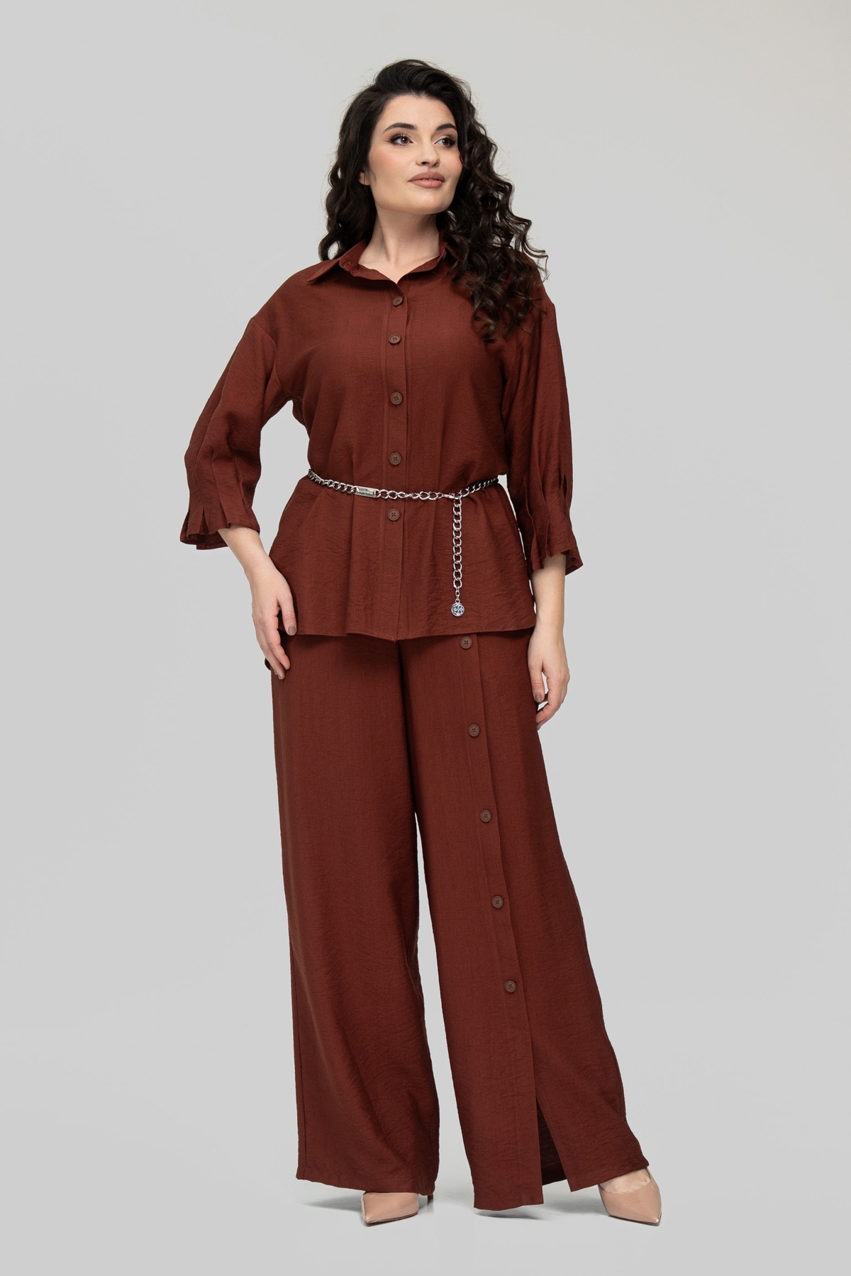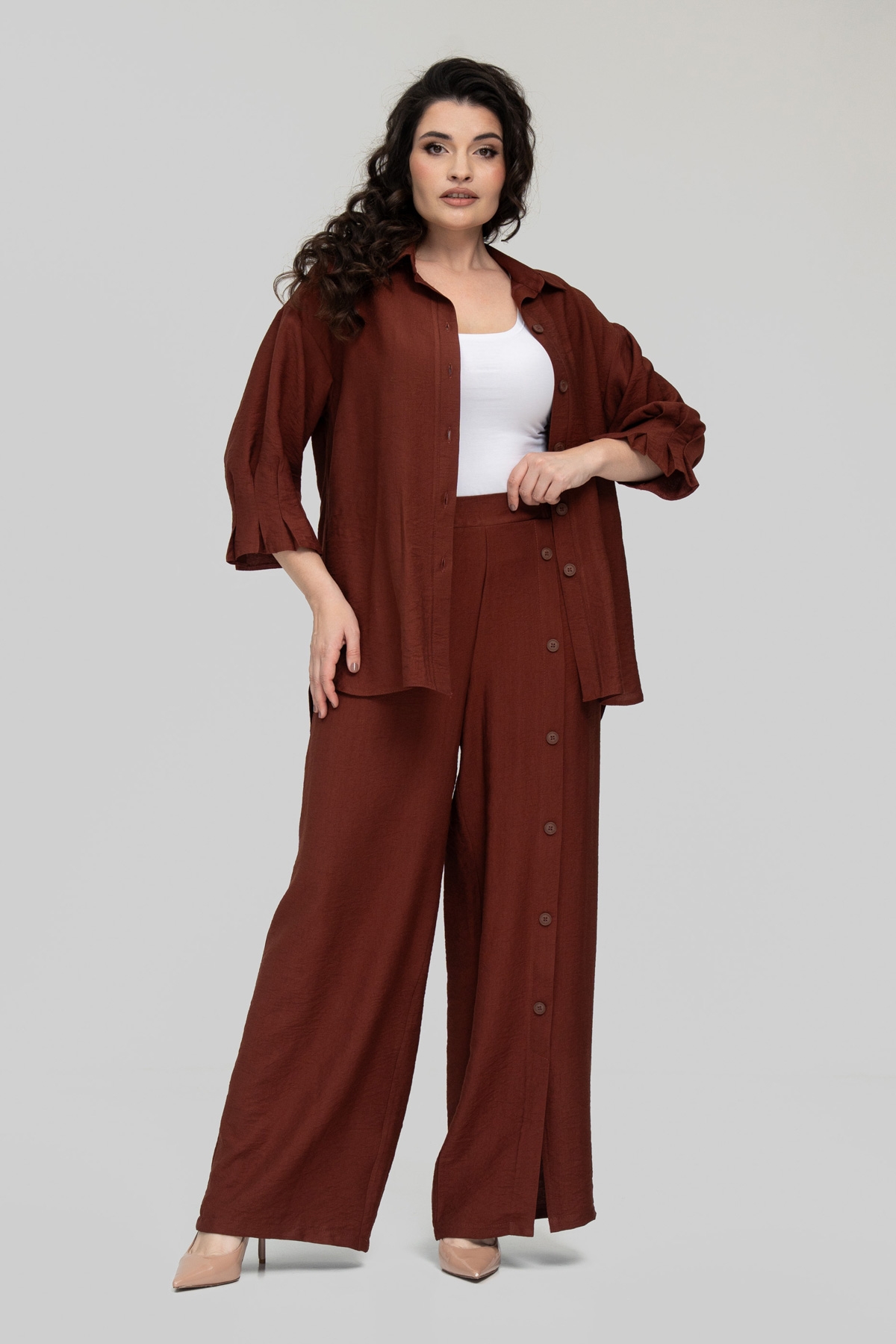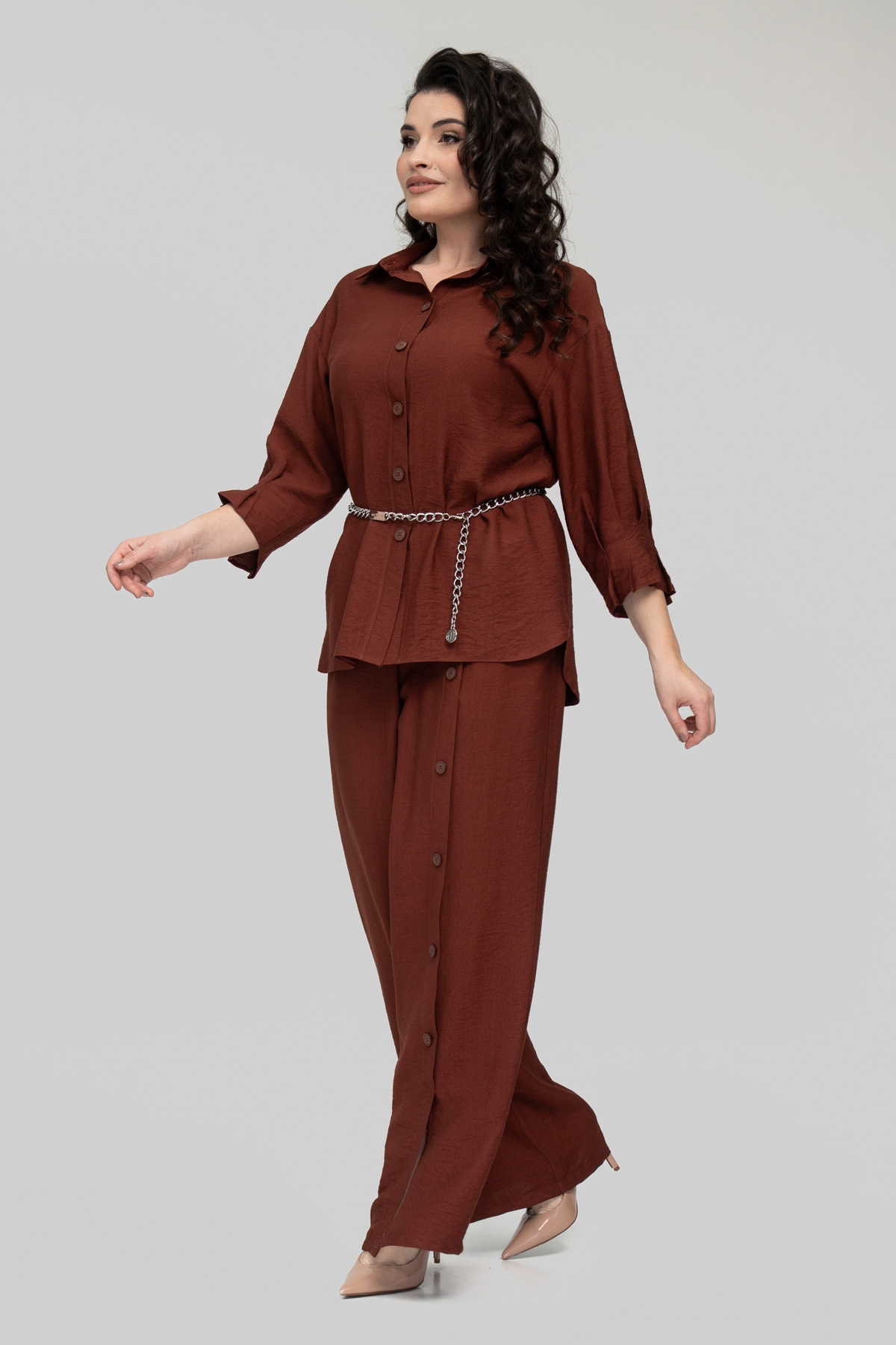 Костюм прямого силуэта, состоит из брюк и рубашки. Выполнен из ткани - лён бохо. Ткань имеет смешанный состав, что даёт ей ряд преимуществ: мягкость, гладкость, высокая прочность благодаря нейлону в составе, износостойкость, воздухопроницаемость, непрозрачность, низкая сминаемость, низкая растяжимость.