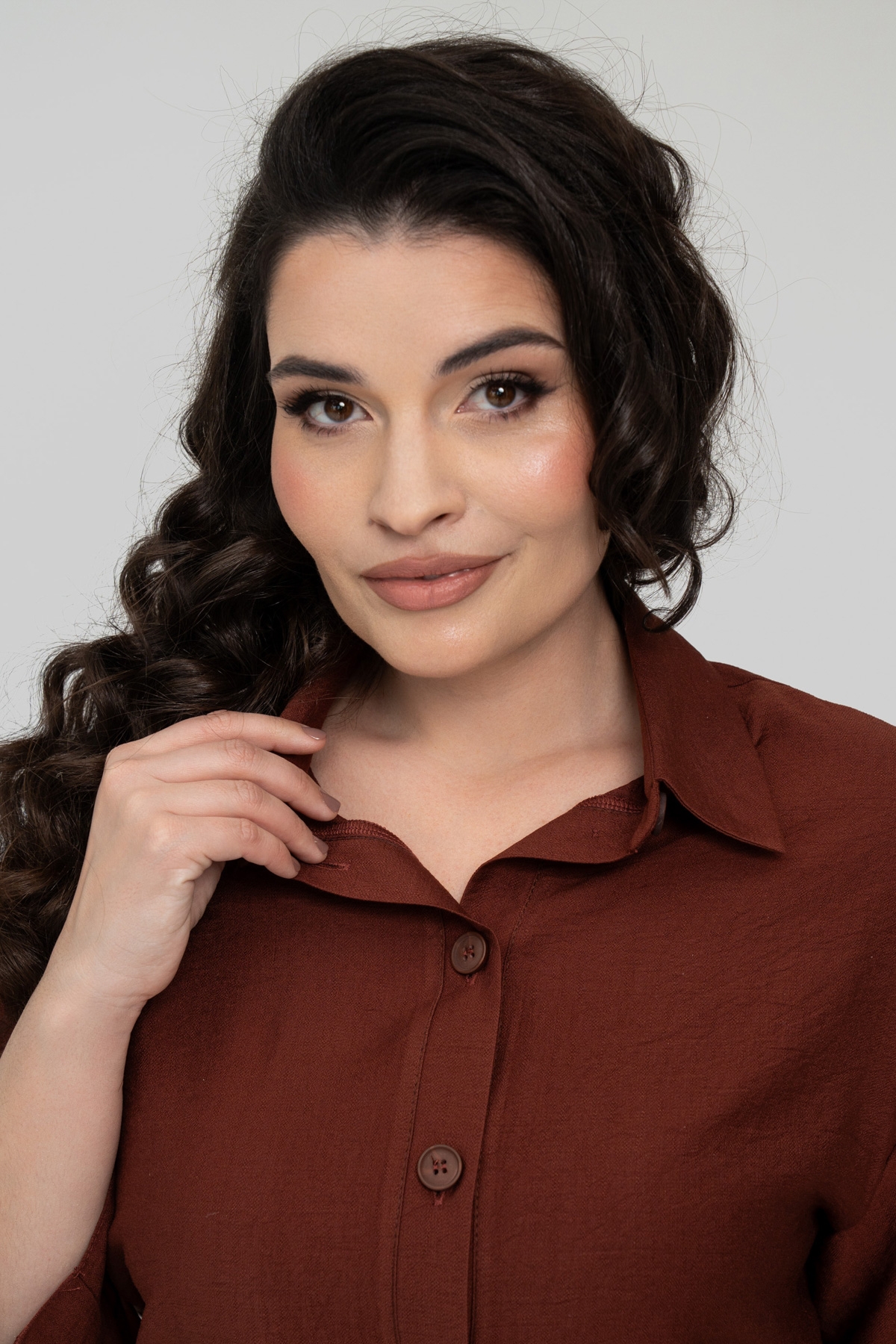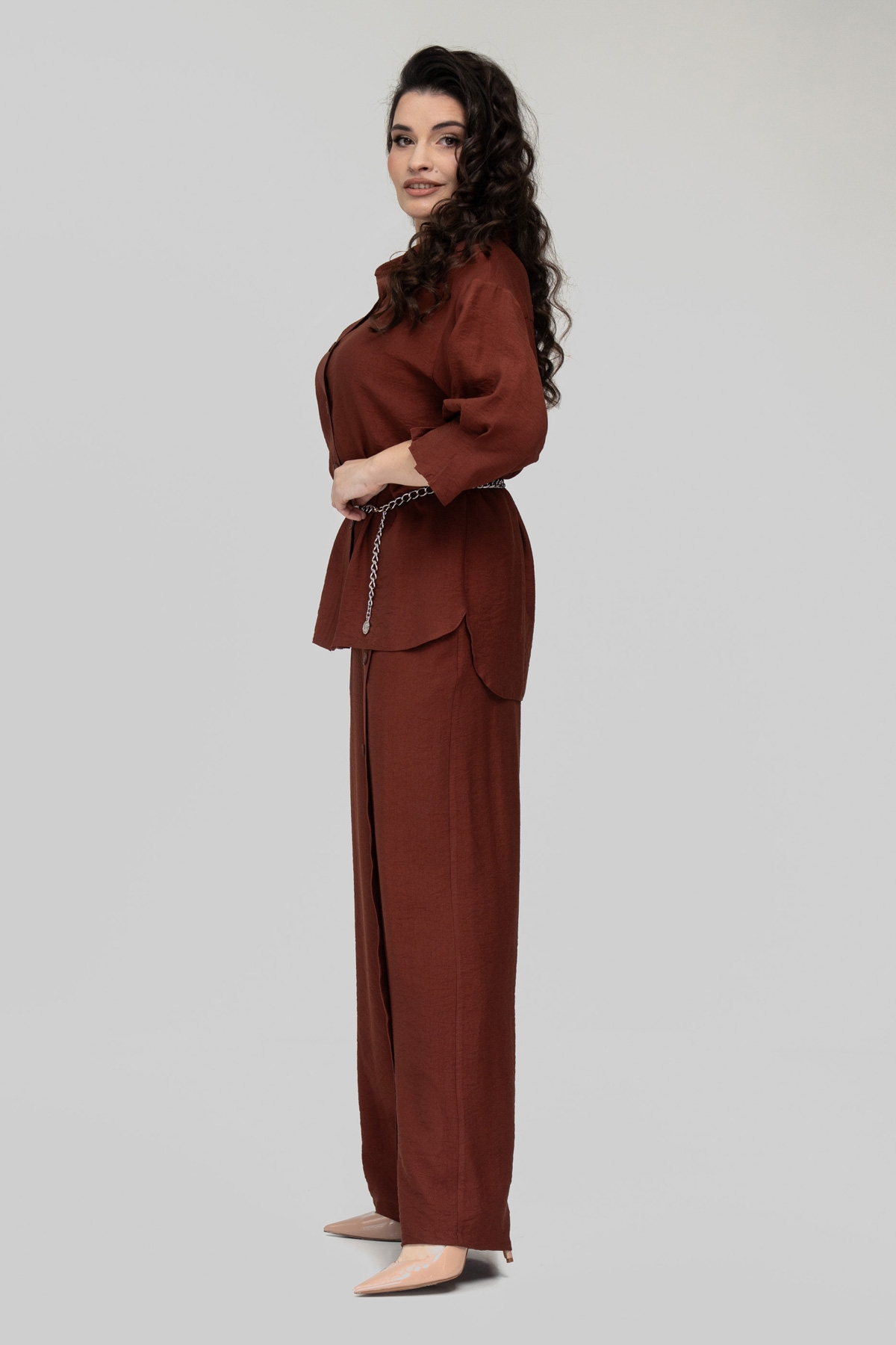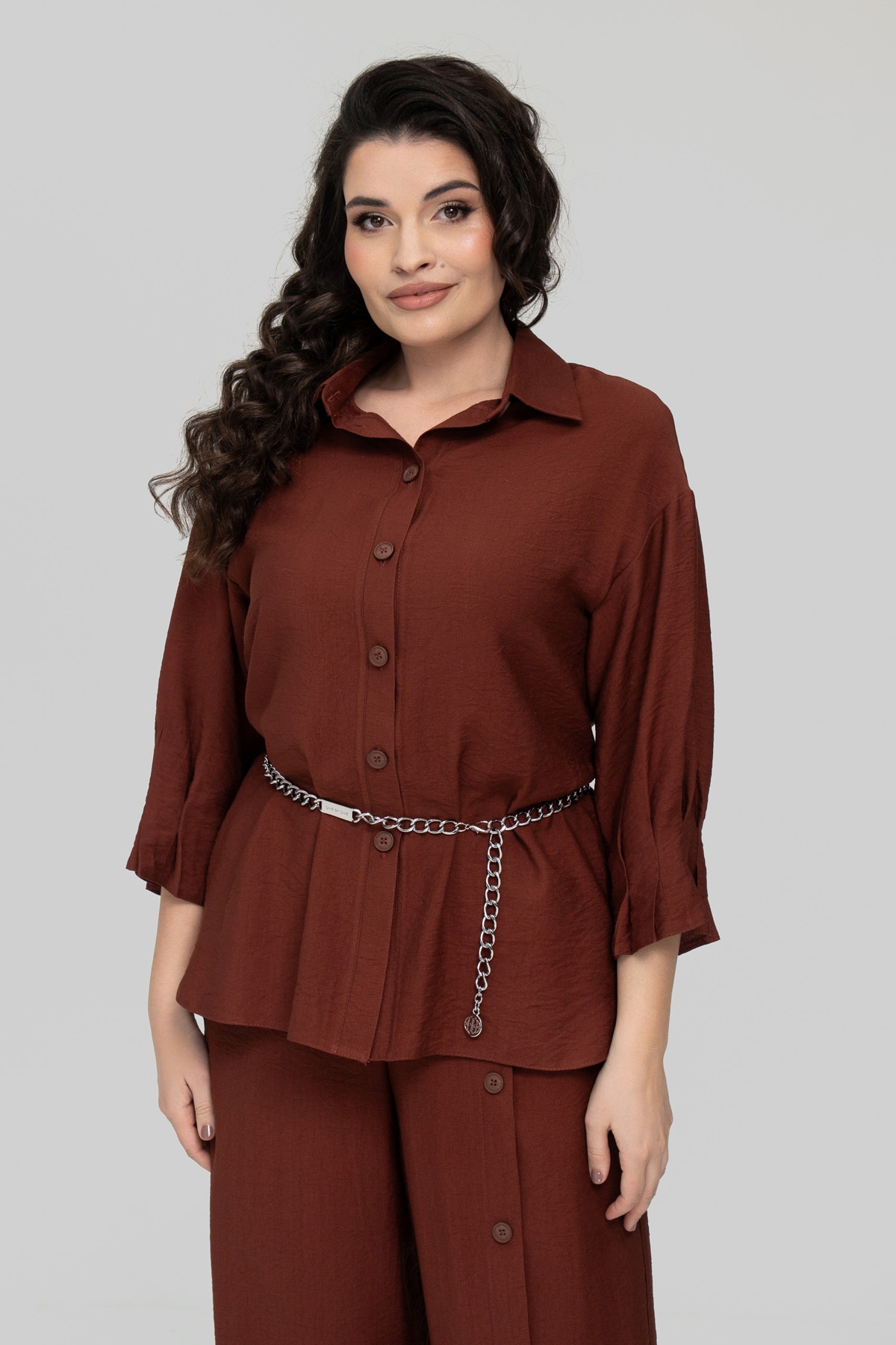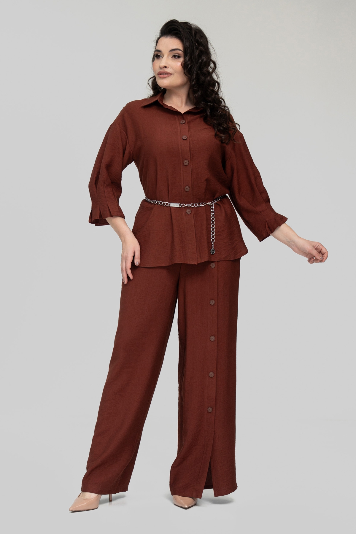 Костюм прямого силуэта, состоит из брюк и рубашки. Выполнен из ткани - лён бохо. Ткань имеет смешанный состав, что даёт ей ряд преимуществ: мягкость, гладкость, высокая прочность благодаря нейлону в составе, износостойкость, воздухопроницаемость, непрозрачность, низкая сминаемость, низкая растяжимость.