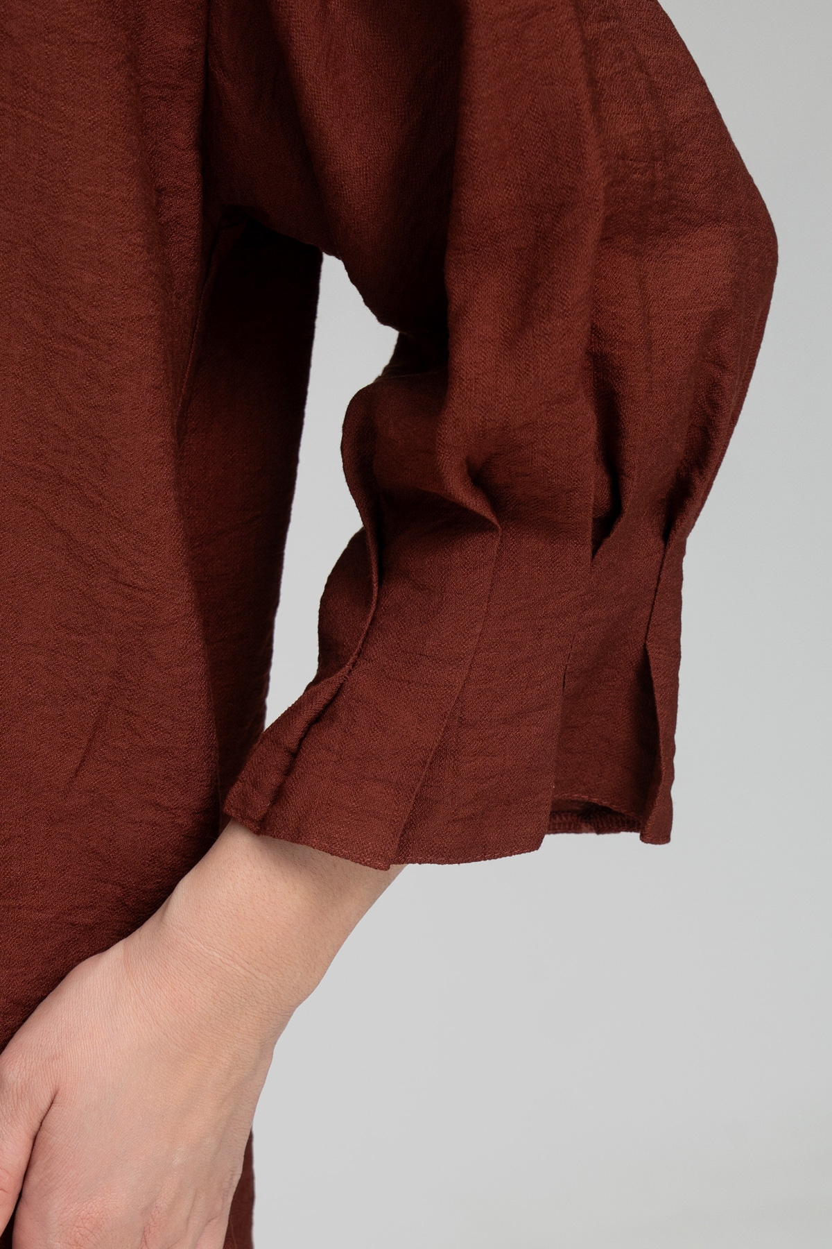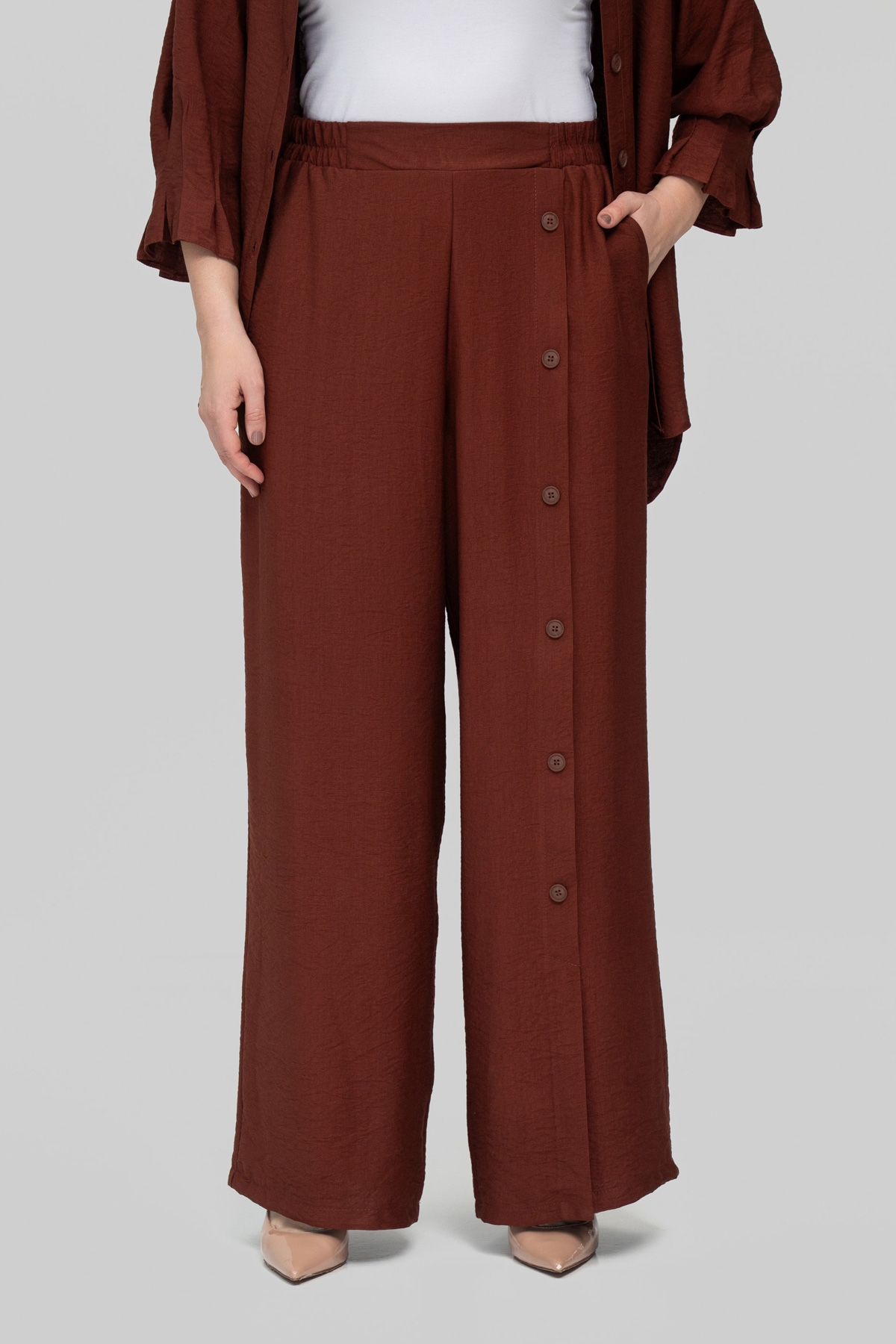 Брюки прямые на резинке. Рубашка прямого силуэта. Плечо спущено, рукав втачной, одношовный, декорирован складами. Воротник отложной на стойке. Застежка на пуговицы.