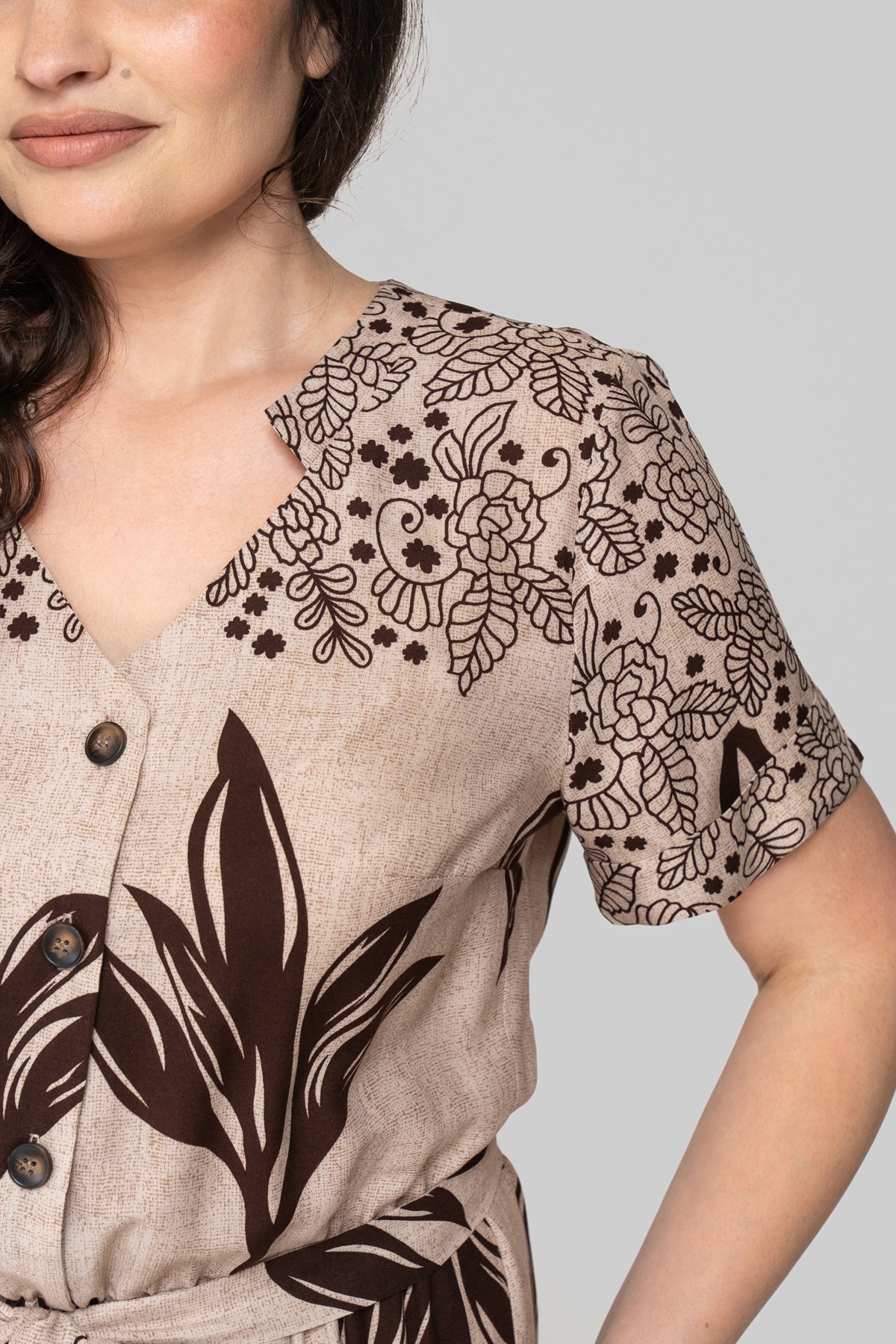 Платье приталенного силуэта с V-образным вырезом. Выполнено из штапеля, ткань легкая и тактильно приятная, но также обладает повышенной прочностью и практичностью, эластичность низкая. По линии талии выполнена эластичная лента (растяжимость 8-10 см). Рукав втачной, одношовный на манжете. На груди выполнена застёжка на пуговицы, также по переду выполнены 2 декоративные планки на пуговицах.