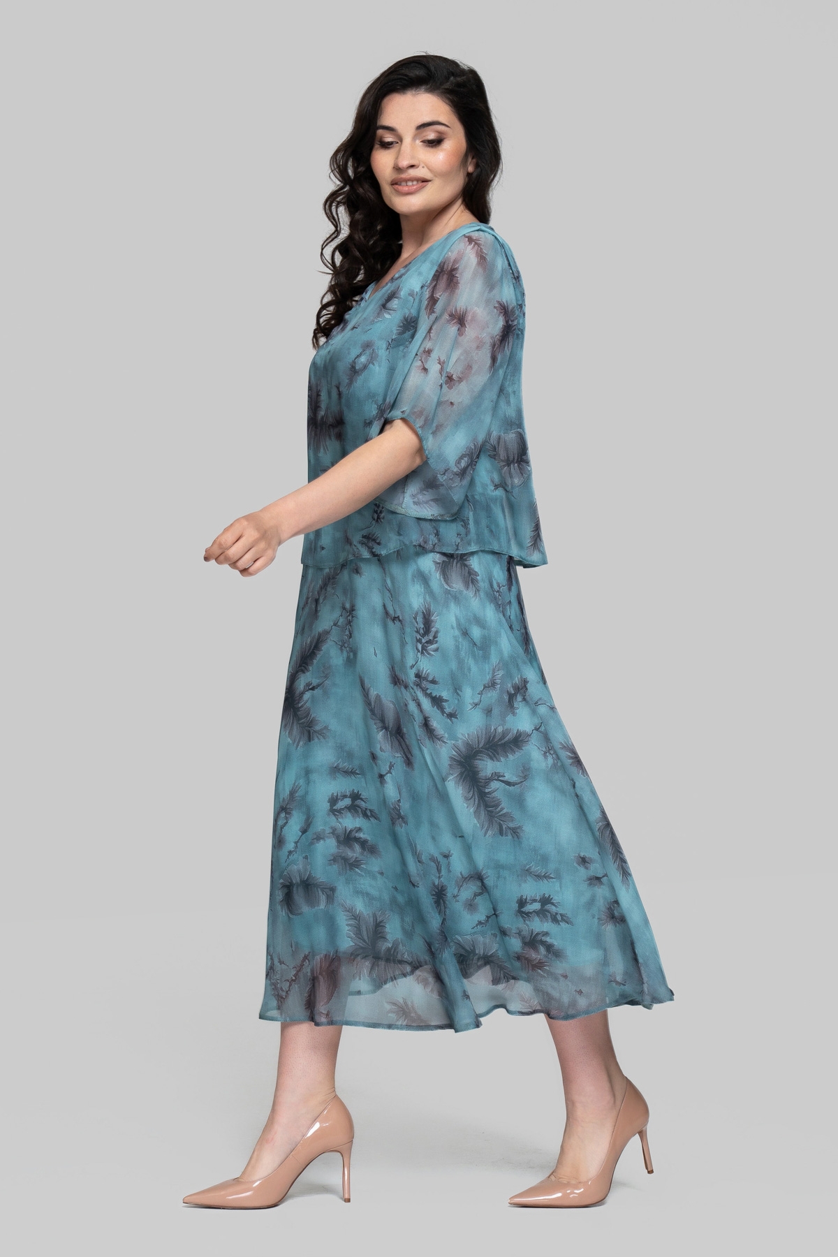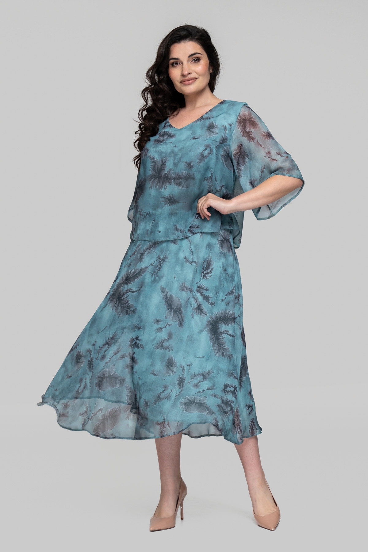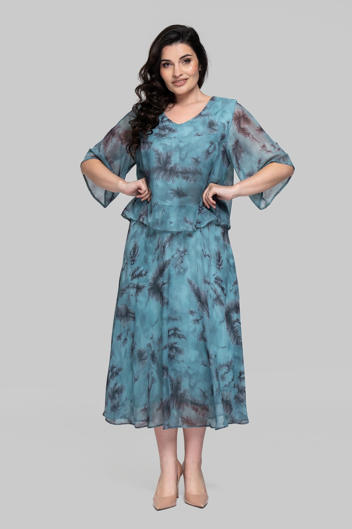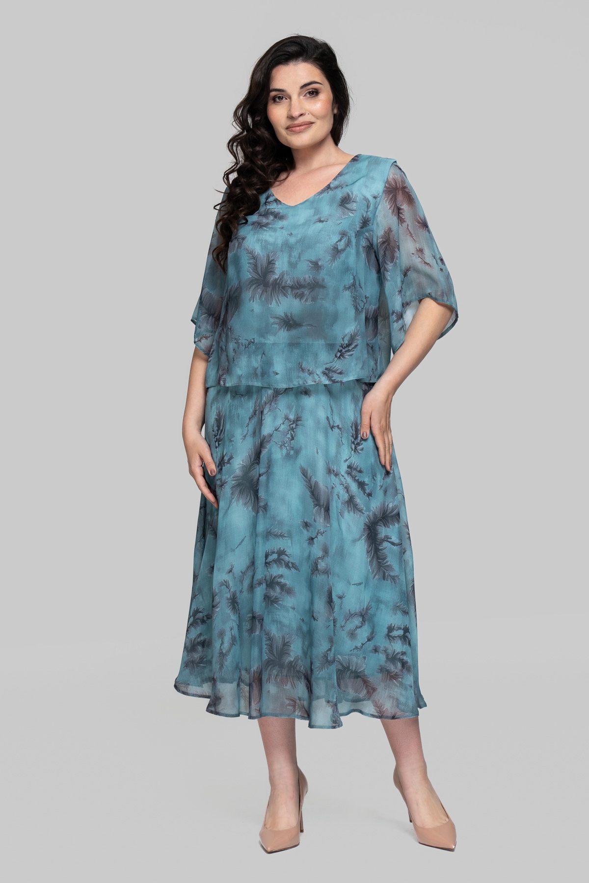 Легкое летнее платье свободного силуэта. Выполнено из шифона(Турция) с эластичной трикотажной подкладкой, расклешенное к низу. Рукав втачной, одношовный. Верх отлетной, юбка отрезная.