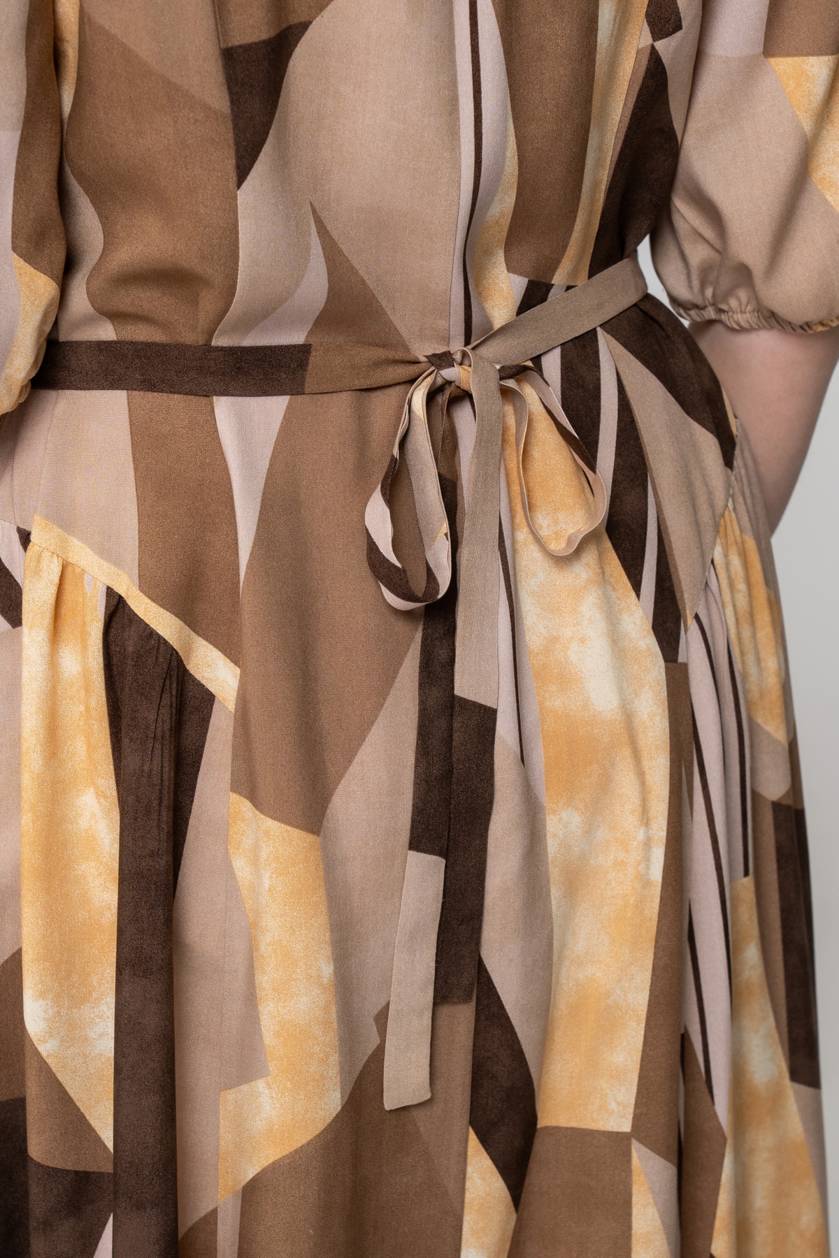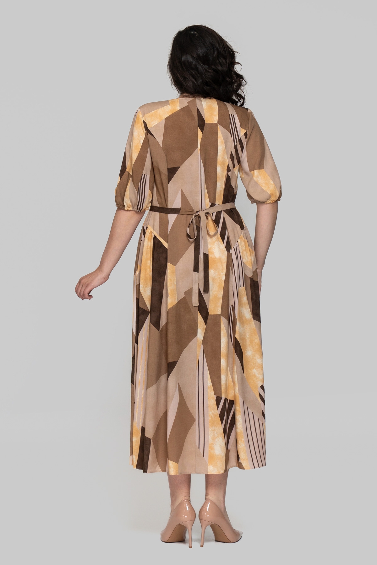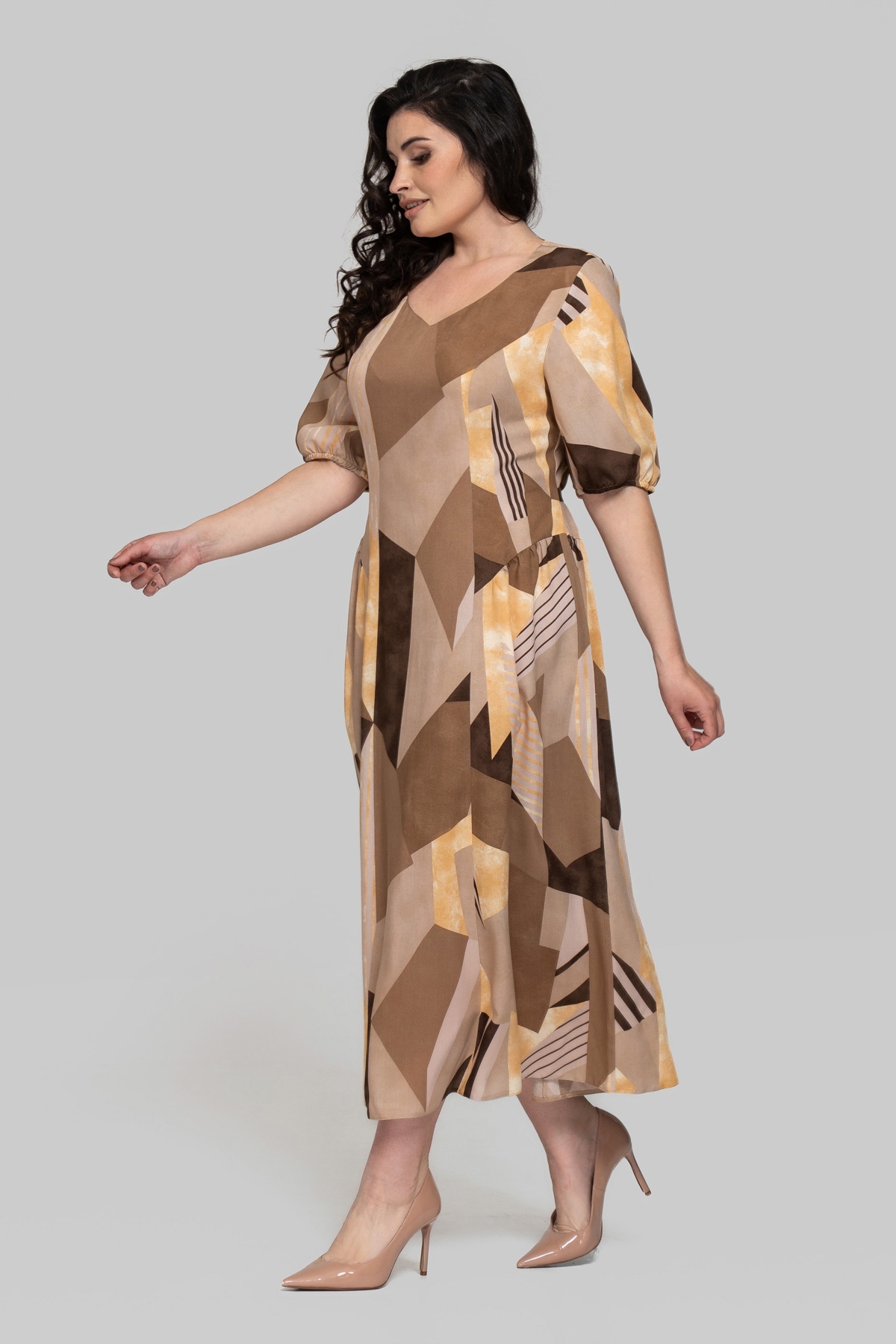Платье прямого силуэта с фигурным вырезом, клешеное к низу. Рукав втачной, одношовный, на эластичной ленте. По бокам выполнены фигурные подрезы со сборкой. На уровне линии талии вшит пояс.