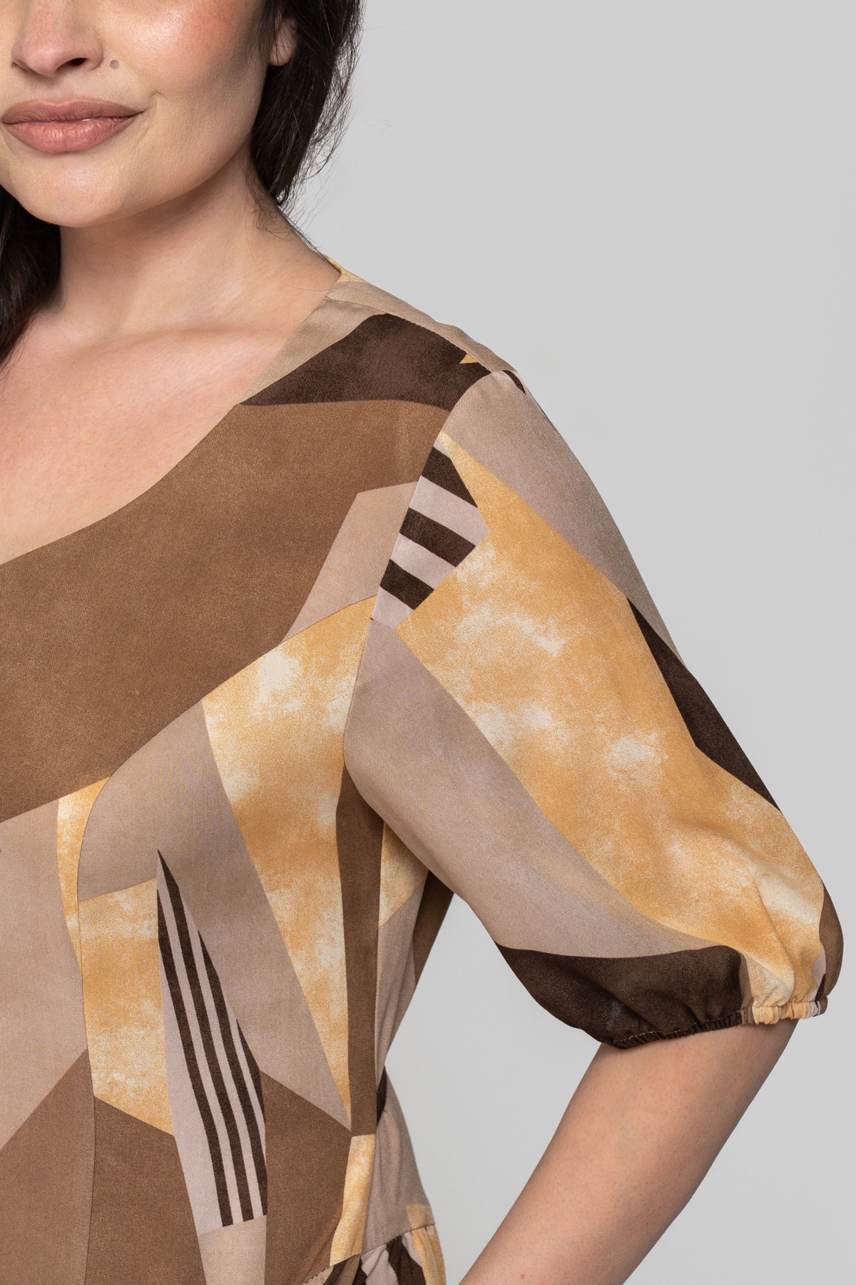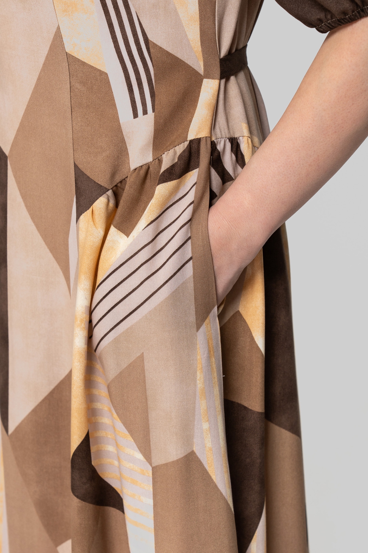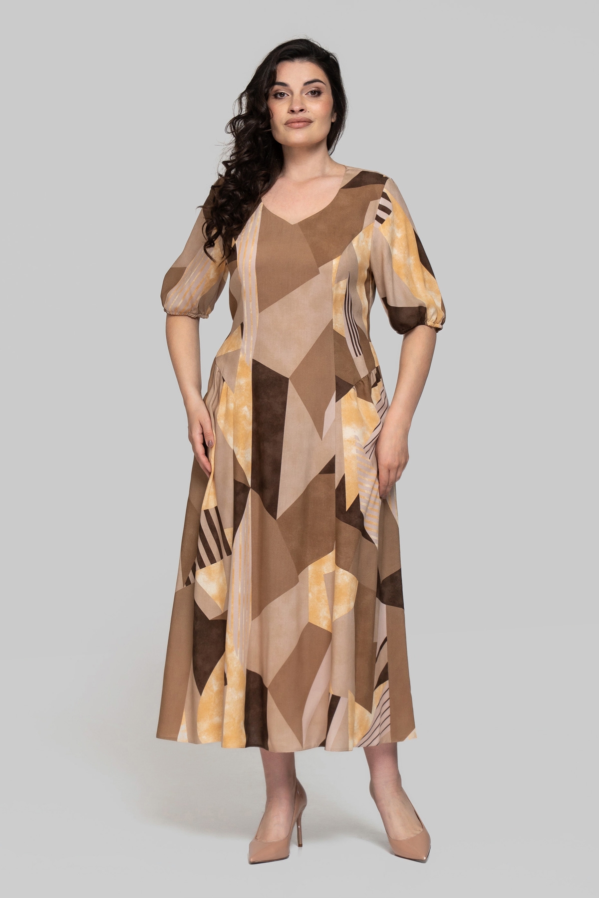 Платье прямого силуэта с фигурным вырезом, клешеное к низу. Рукав втачной, одношовный, на эластичной ленте. По бокам выполнены фигурные подрезы со сборкой. На уровне линии талии вшит пояс.