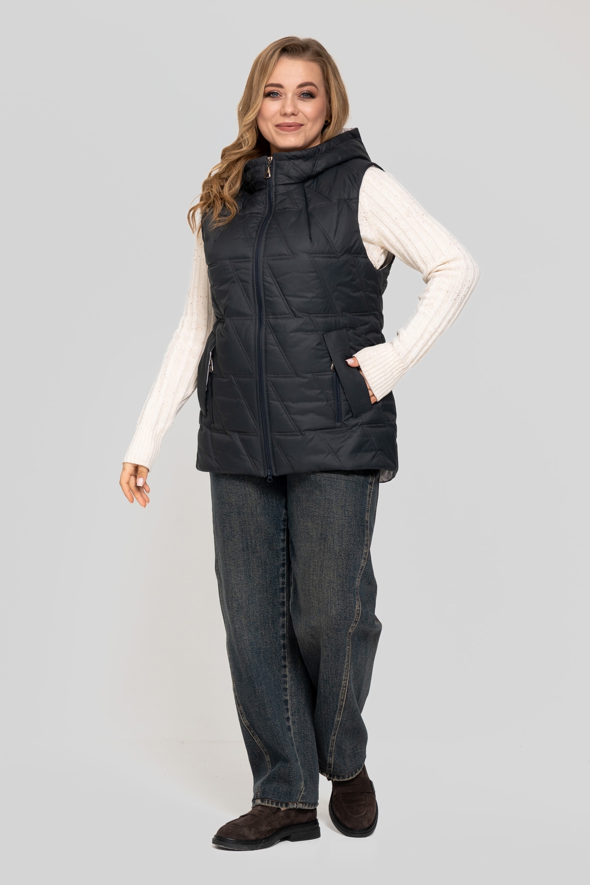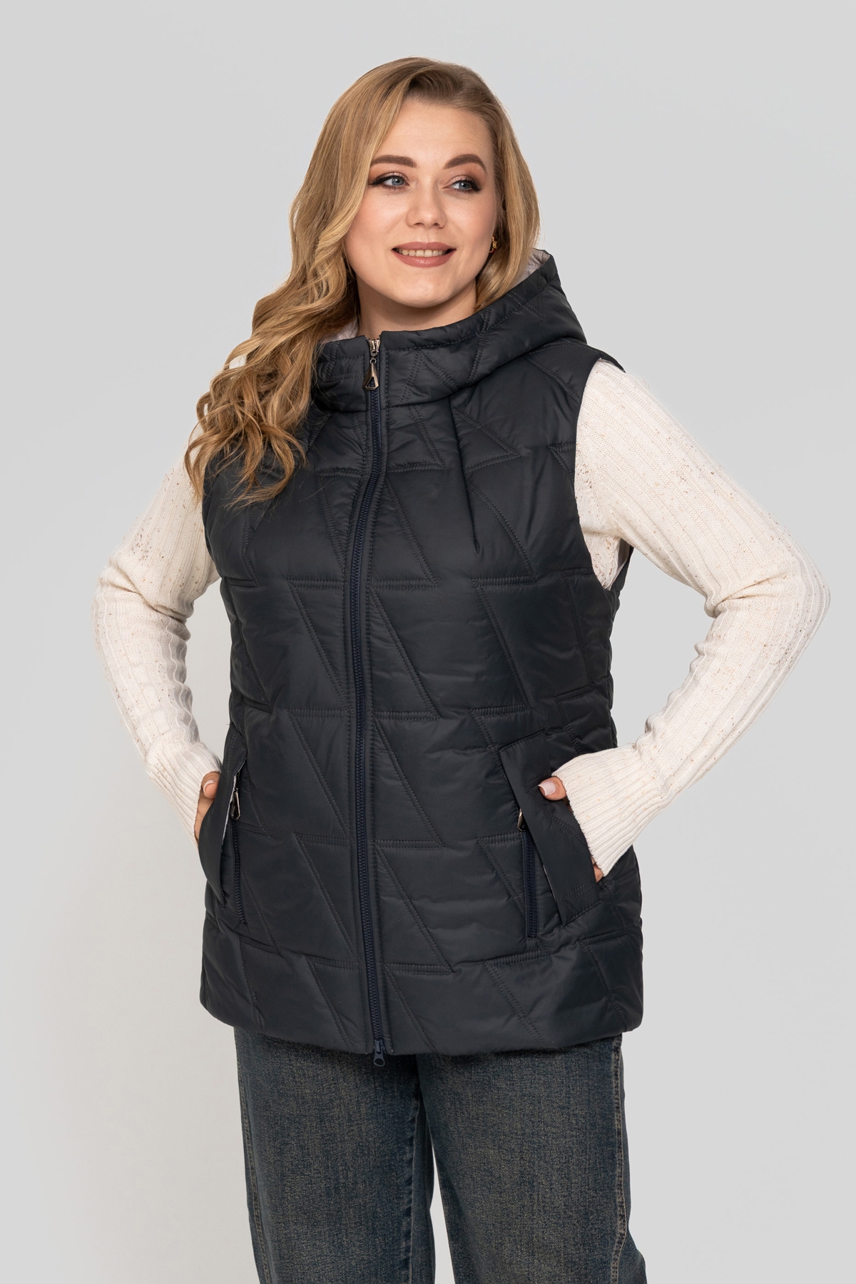 Жилет прямого силуэта, выполнен из плащевой ткани. Наполнитель: тинсулейт 150 г/м². Застёжка на молнию. Карман с фигурной листочкой на потайной кнопке, декорирован молнией. Капюшон втачной.