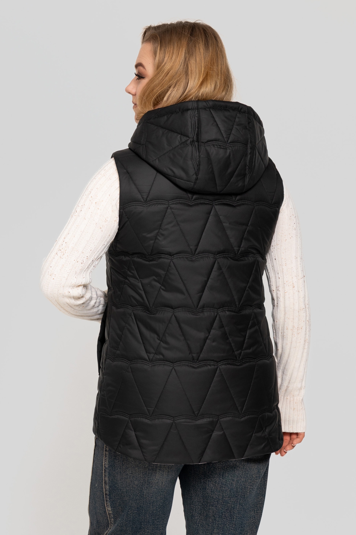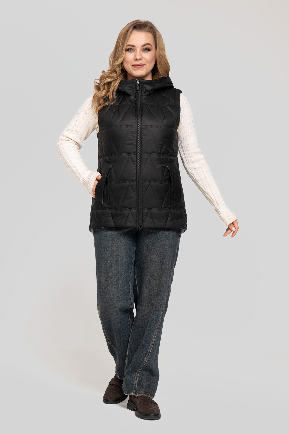 Жилет прямого силуэта, выполнен из плащевой ткани. Наполнитель: тинсулейт 150 г/м². Застёжка на молнию. Карман с фигурной листочкой на потайной кнопке, декорирован молнией. Капюшон втачной.