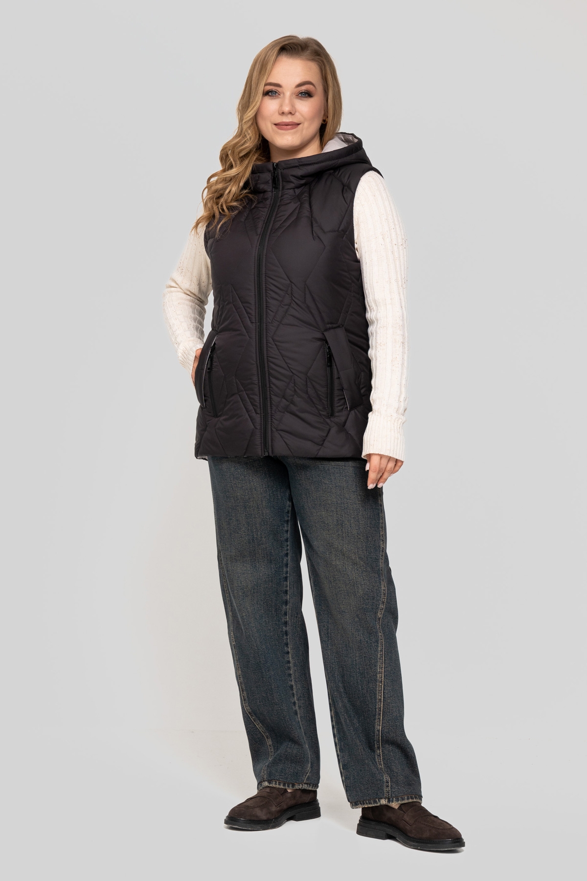 Жилет прямого силуэта, выполнен из плащевой ткани. Наполнитель: тинсулейт 150 г/м². Застёжка на молнию. Карман с фигурной листочкой на потайной кнопке, декорирован молнией. Капюшон втачной.