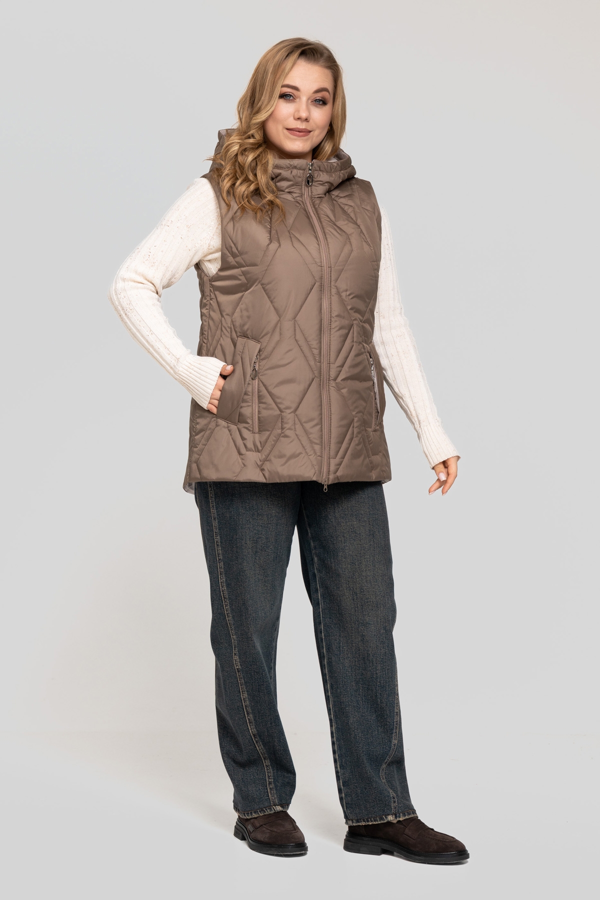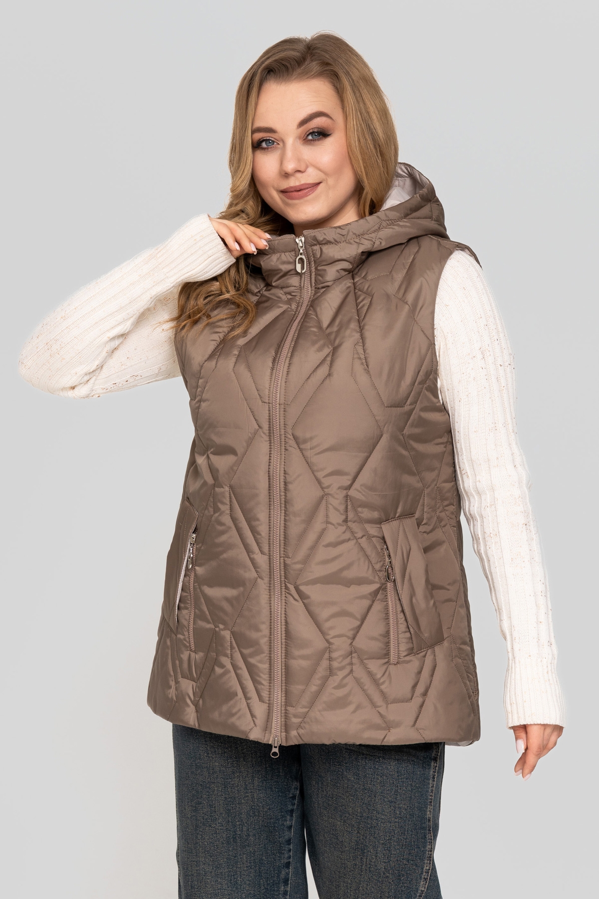 Жилет прямого силуэта, выполнен из плащевой ткани. Наполнитель: тинсулейт 150 г/м². Застёжка на молнию. Карман с фигурной листочкой на потайной кнопке, декорирован молнией. Капюшон втачной.