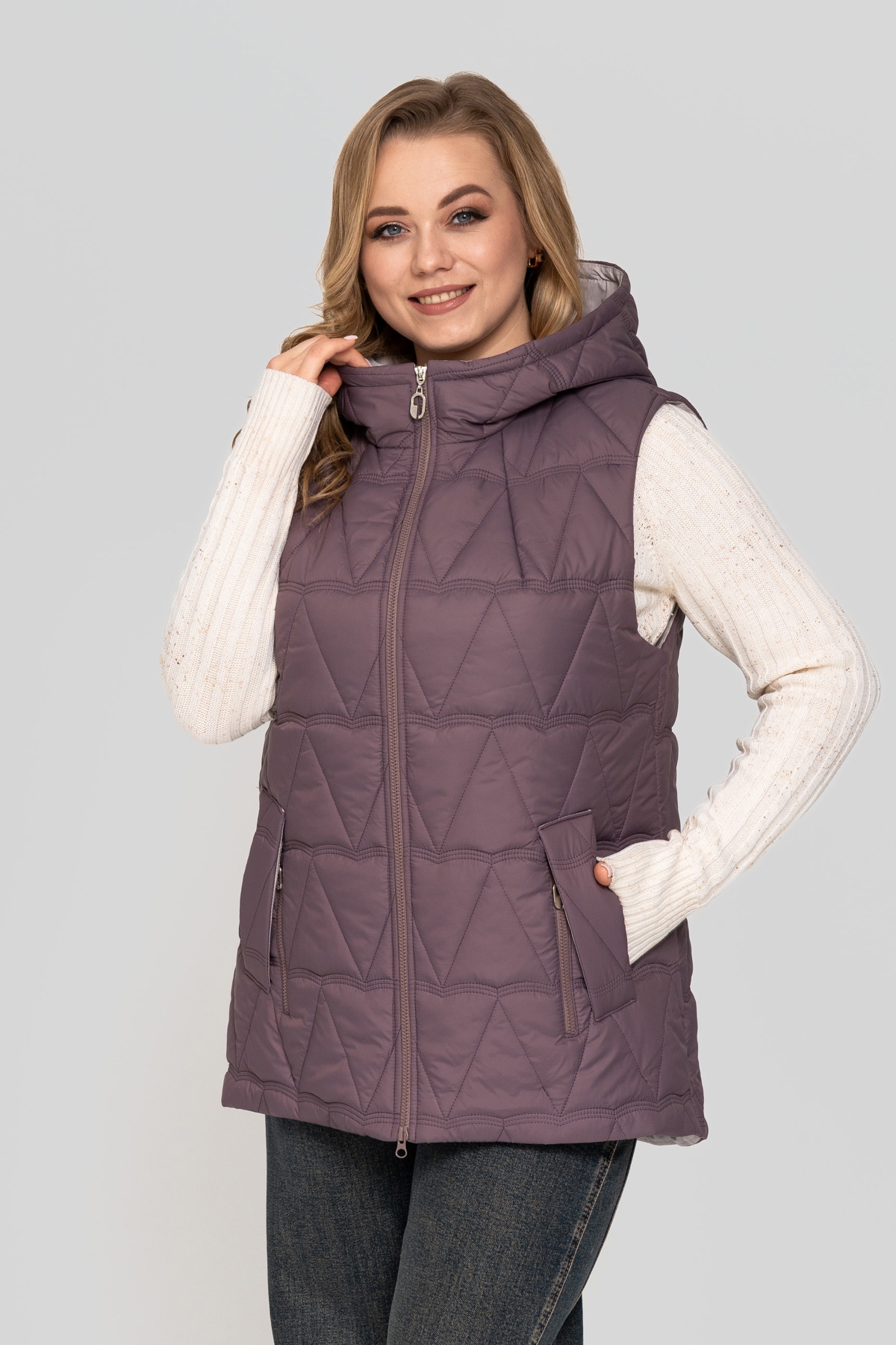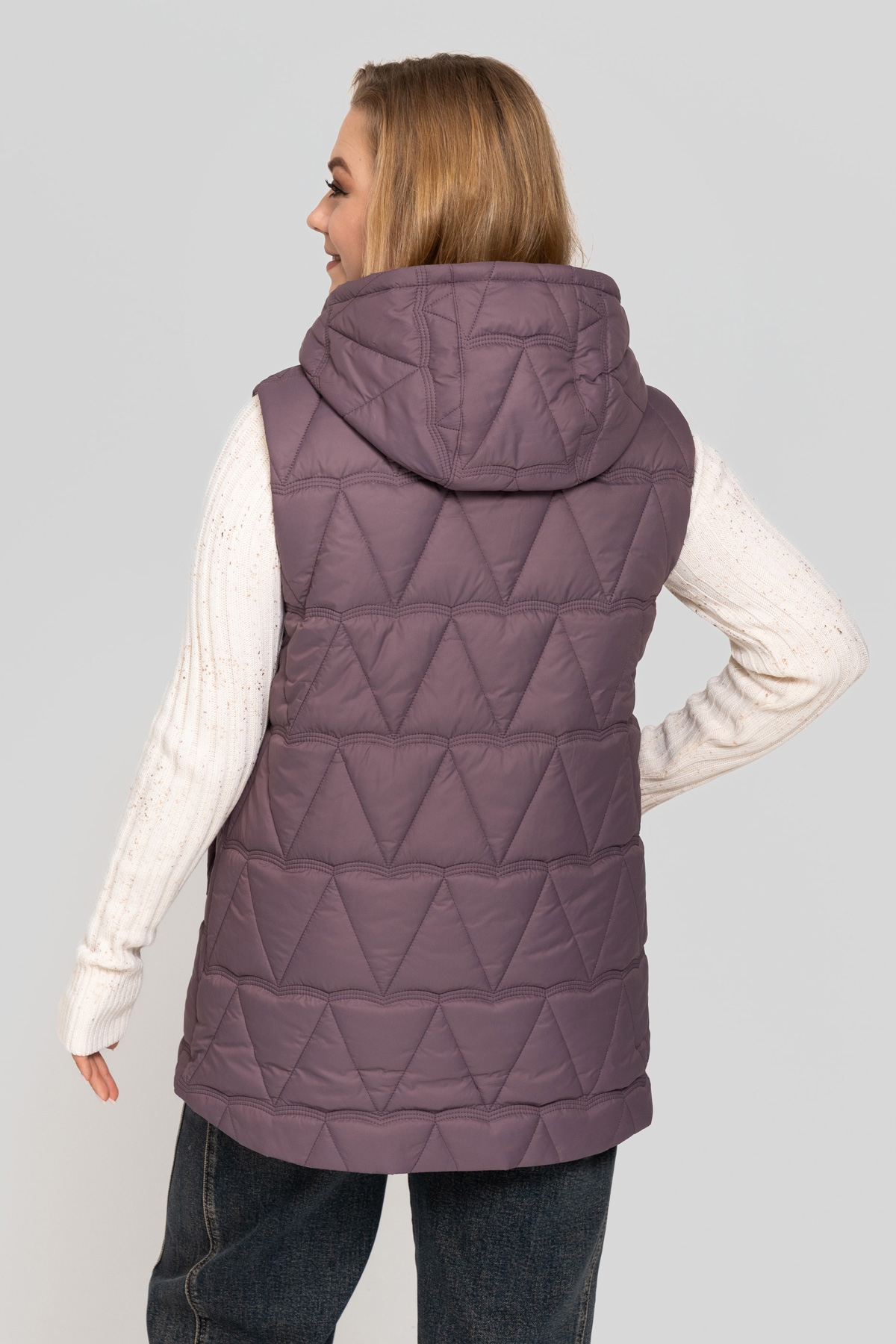 Жилет прямого силуэта, выполнен из плащевой ткани. Наполнитель: тинсулейт 150 г/м². Застёжка на молнию. Карман с фигурной листочкой на потайной кнопке, декорирован молнией. Капюшон втачной.