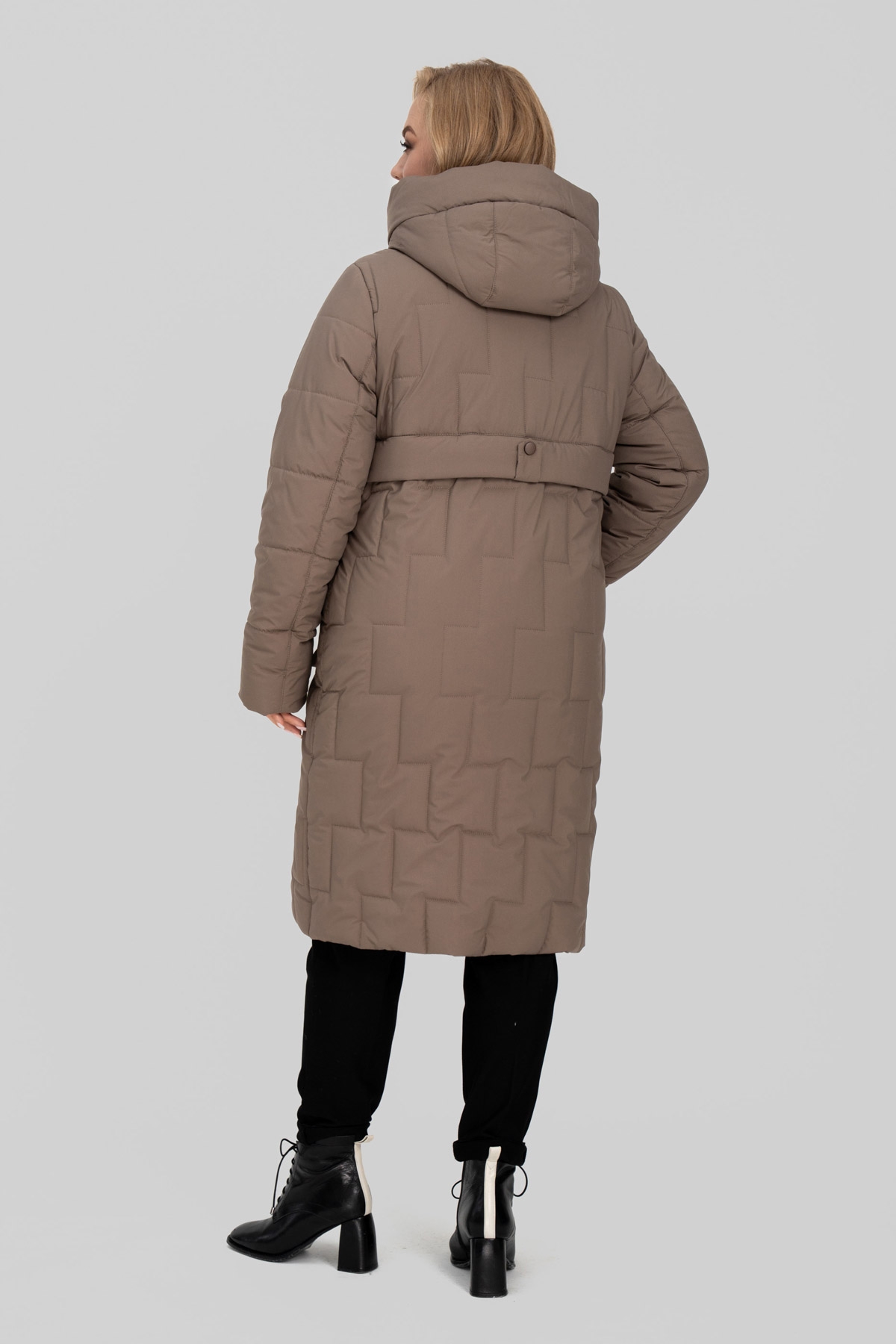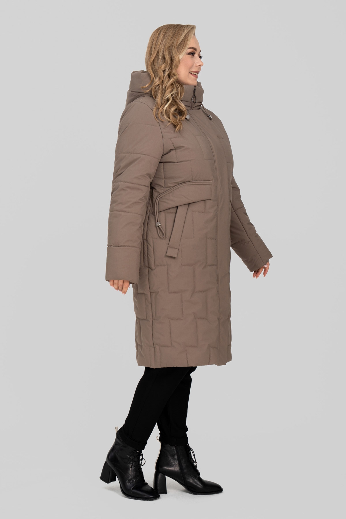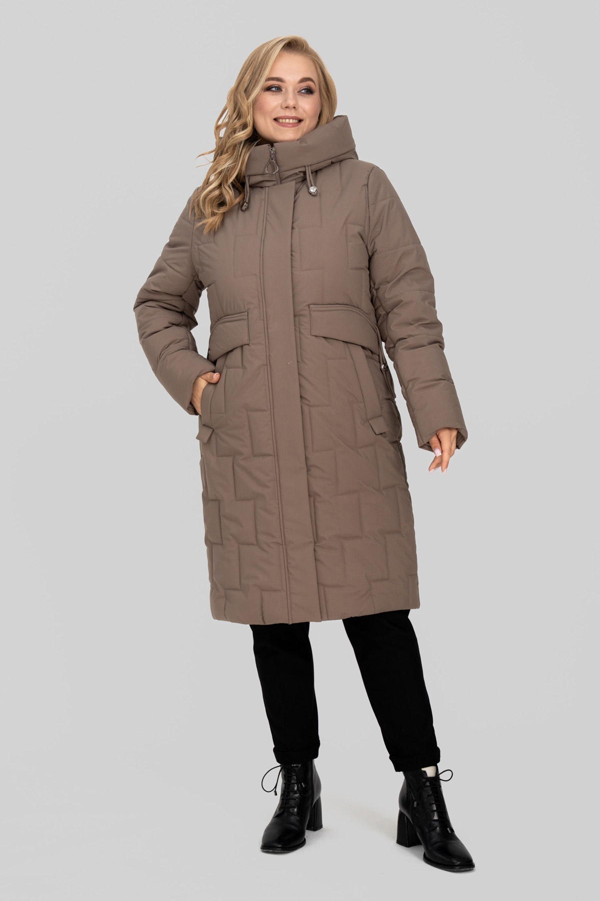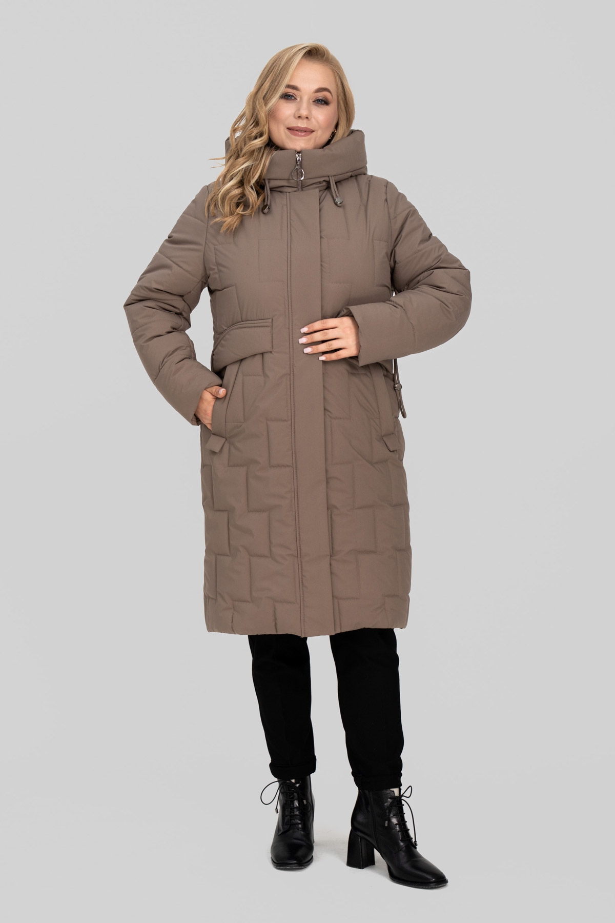 Зимове пальто прямого силуету, виконане з матової плащової тканини на мембранній основі з додатковим вологовідштовхувальним просоченням. Наповнювач: тінсулейт 150 + 80 г/м² (до -19 °C). Рукав втачний, двошовний, всередині трикотажні манжети. Кишеня з листочкою і застібкою на потайну кнопку. Капюшон втачний, висота регулюється за допомогою шнура з фіксаторами. Застібка на блискавку і планку на кнопках, що додатково захистить від вітру. Над кишенями виконані фігурні клапани, декоровані шнуром з фіксатором. Підкладка: нейлон.