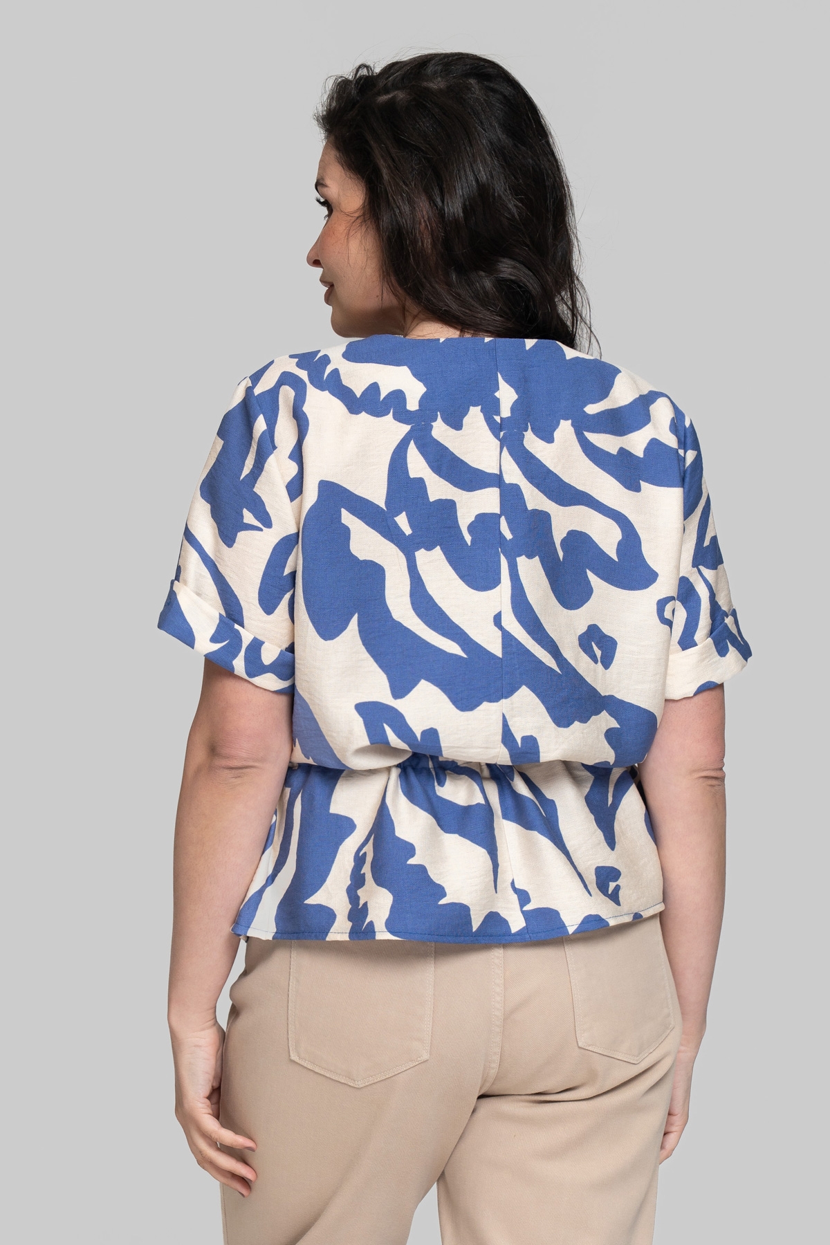 Блуза прямого крою без підкладки з V-подібним вирізом. Виготовлена зі штапельної тканини. Тканина легка та приємна на дотик, але водночас відрізняється підвищеною міцністю та практичністю, що чудово підходить для літніх моделей, призначених для повсякденного використання. Рукав вшитий, одношовний. По лінії талії виконана куліса зі шнурком.