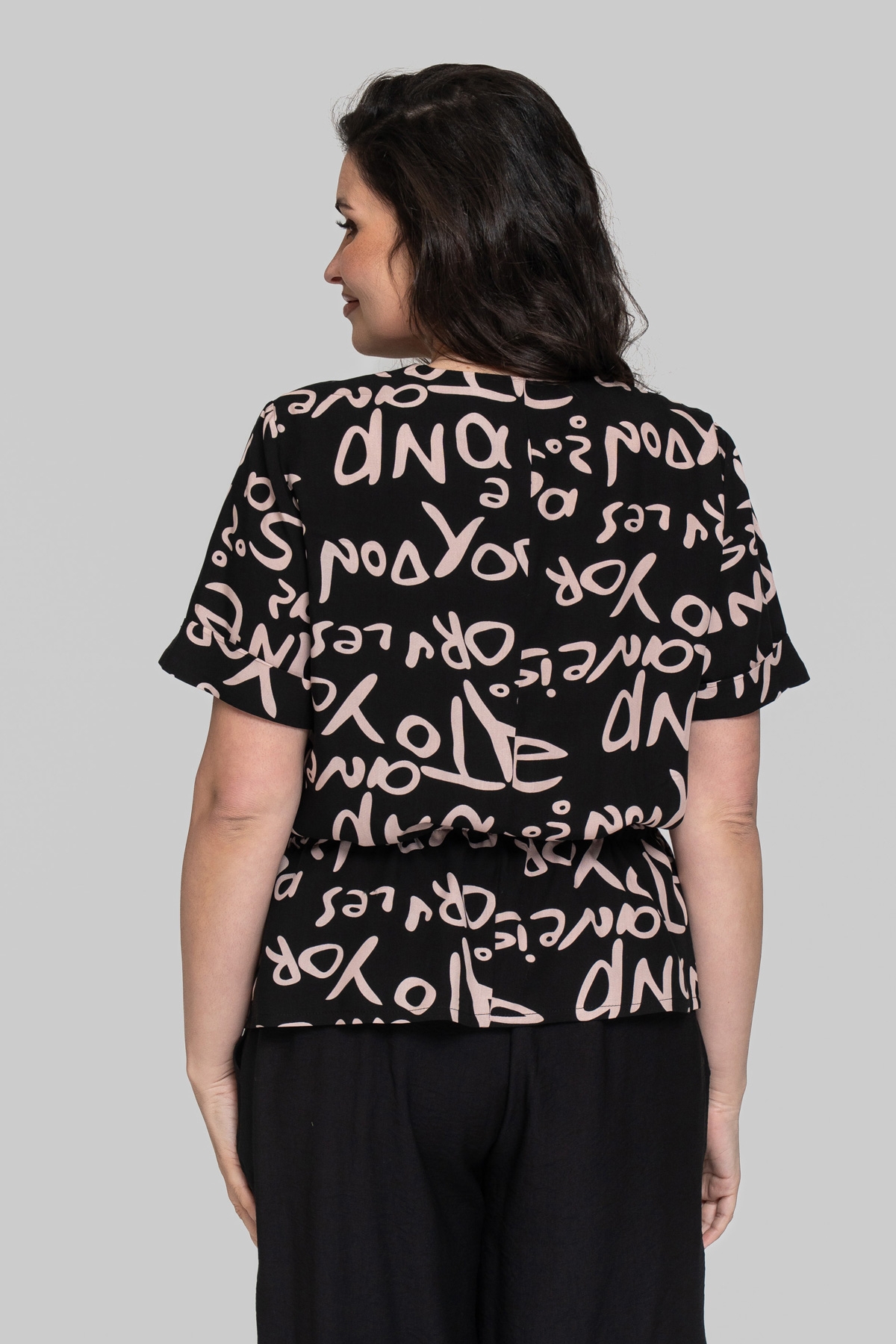 Блуза прямого крою без підкладки з V-подібним вирізом. Виготовлена зі штапельної тканини. Тканина легка та приємна на дотик, але водночас відрізняється підвищеною міцністю та практичністю, що чудово підходить для літніх моделей, призначених для повсякденного використання. Рукав вшитий, одношовний. По лінії талії виконана куліса зі шнурком.