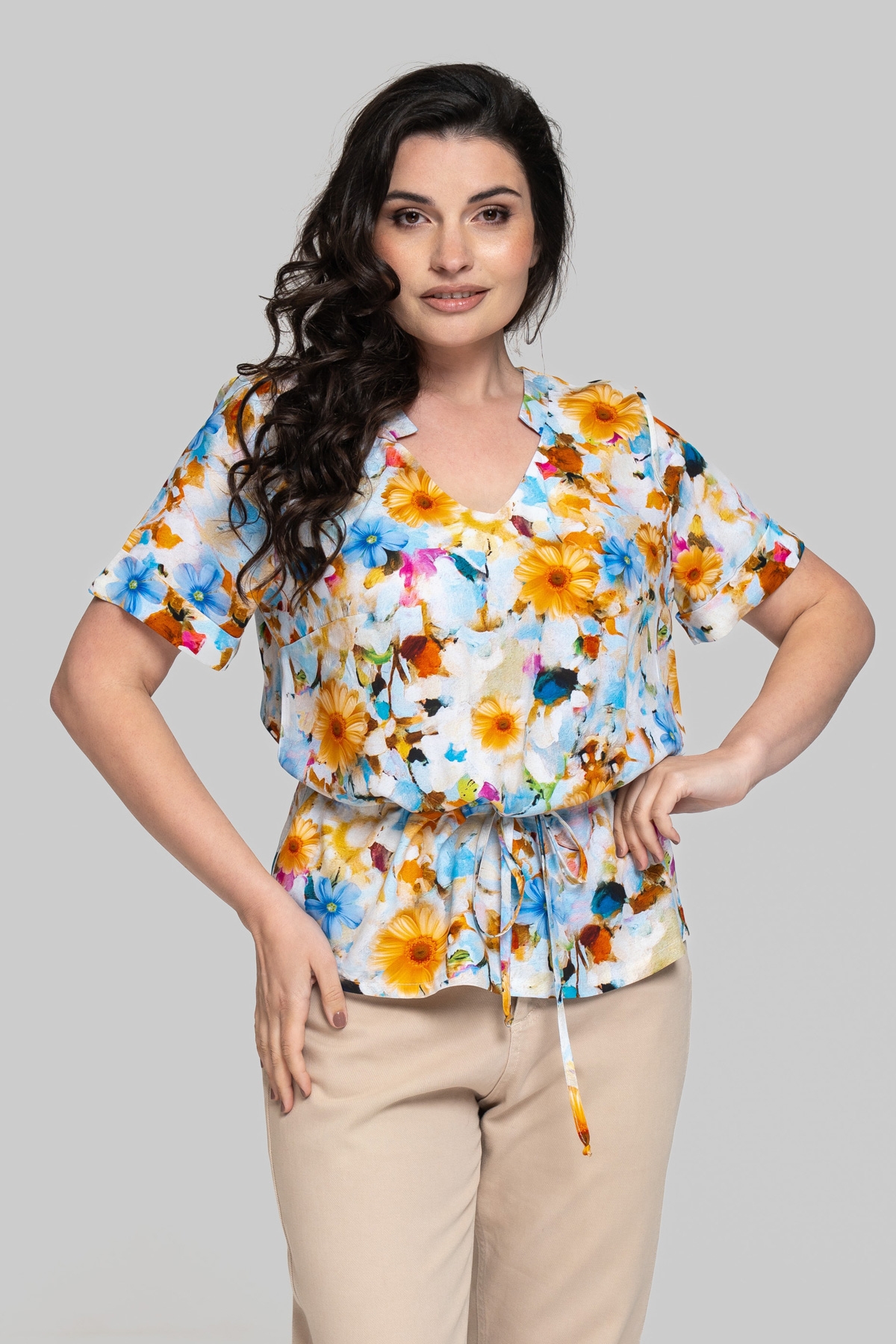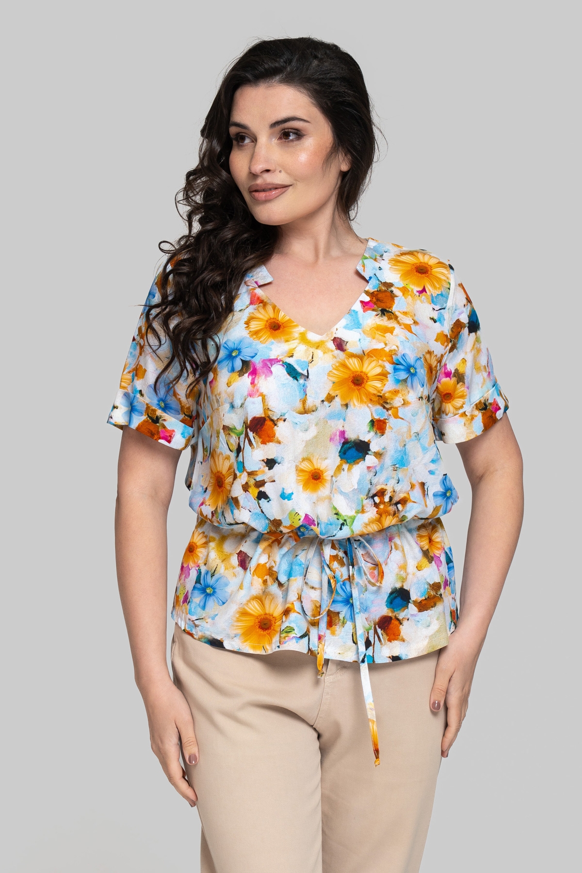 Блуза прямого крою без підкладки з V-подібним вирізом. Виготовлена зі штапельної тканини. Тканина легка та приємна на дотик, але водночас відрізняється підвищеною міцністю та практичністю, що чудово підходить для літніх моделей, призначених для повсякденного використання. Рукав вшитий, одношовний. По лінії талії виконана куліса зі шнурком.