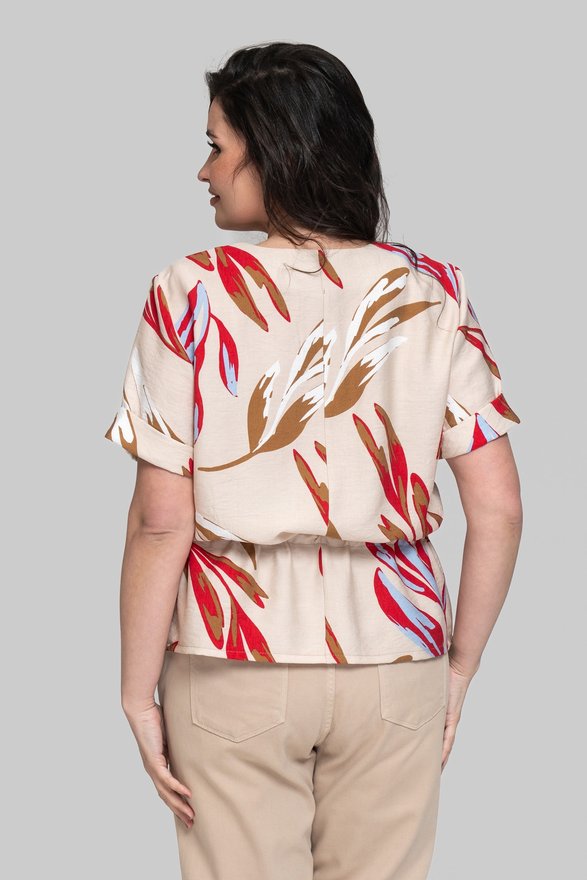 Блуза прямого крою без підкладки з V-подібним вирізом. Виготовлена зі штапельної тканини. Тканина легка та приємна на дотик, але водночас відрізняється підвищеною міцністю та практичністю, що чудово підходить для літніх моделей, призначених для повсякденного використання. Рукав вшитий, одношовний. По лінії талії виконана куліса зі шнурком.