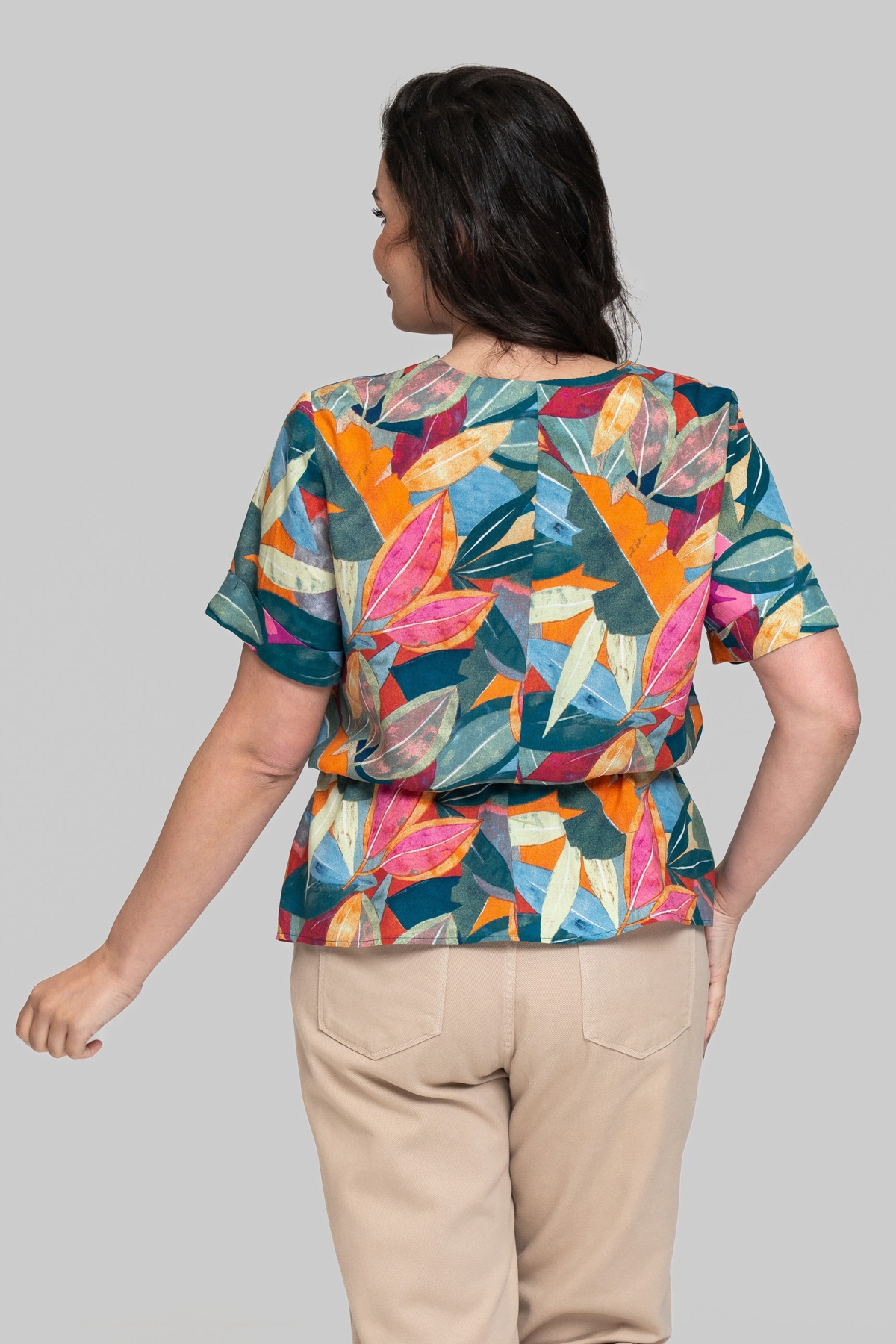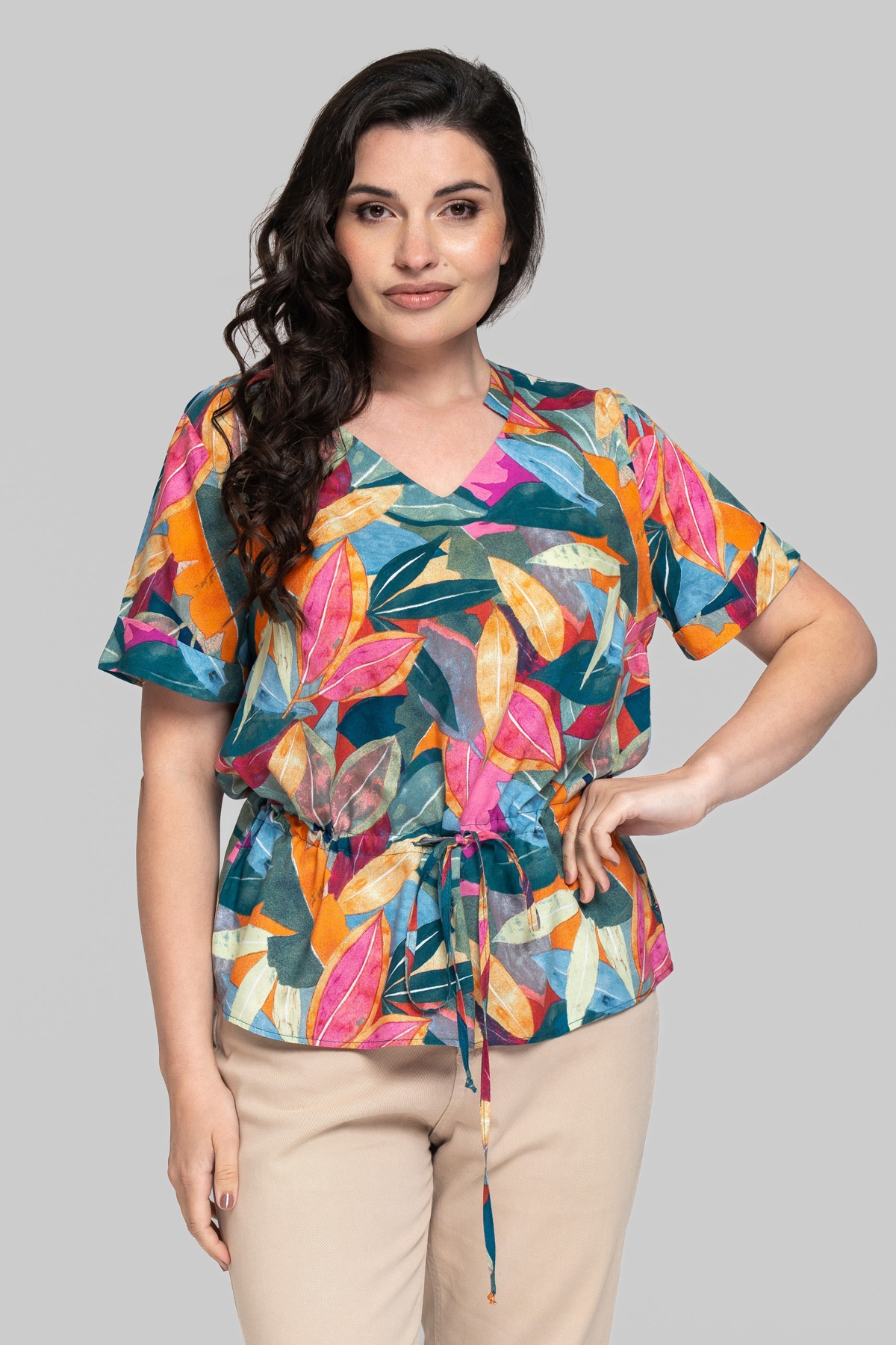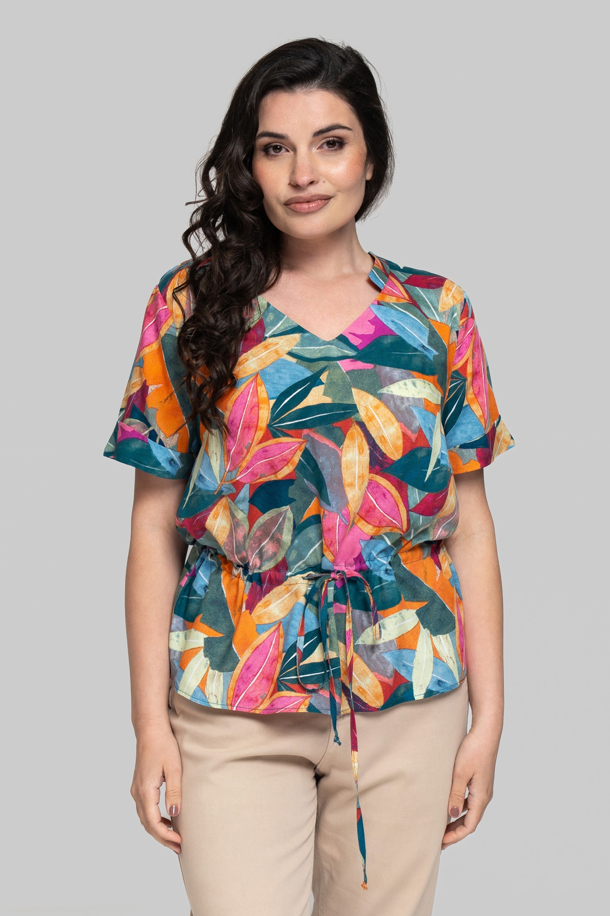 Блуза прямого крою без підкладки з V-подібним вирізом. Виготовлена зі штапельної тканини. Тканина легка та приємна на дотик, але водночас відрізняється підвищеною міцністю та практичністю, що чудово підходить для літніх моделей, призначених для повсякденного використання. Рукав вшитий, одношовний. По лінії талії виконана куліса зі шнурком.