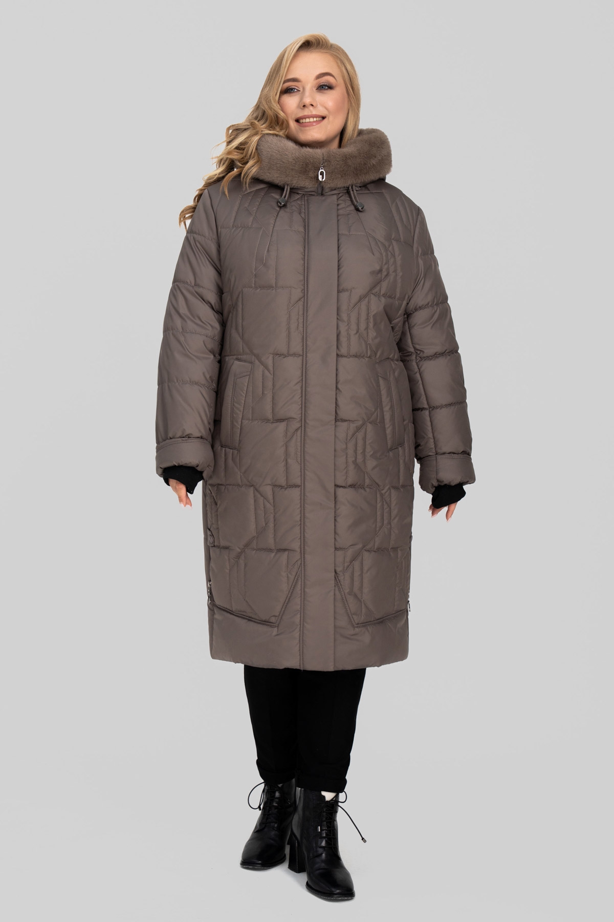 Зимове пальто прямого силуету, виготовлене з плащової тканини, наповнювач тинсулейт 150+60 г/м² (до -17 °C). Рукав втачний, двошовний, всередині трикотажні манжети. Капюшон втачний з опушкою зі штучного хутра, висота регулюється за допомогою шнура з наконечниками. У рельєфних швах полиці виконані кишені на блискавці. У бічних швах підрізи декоровані люверсами зі шнурівкою. Застібка на блискавку. Підкладка: нейлон.