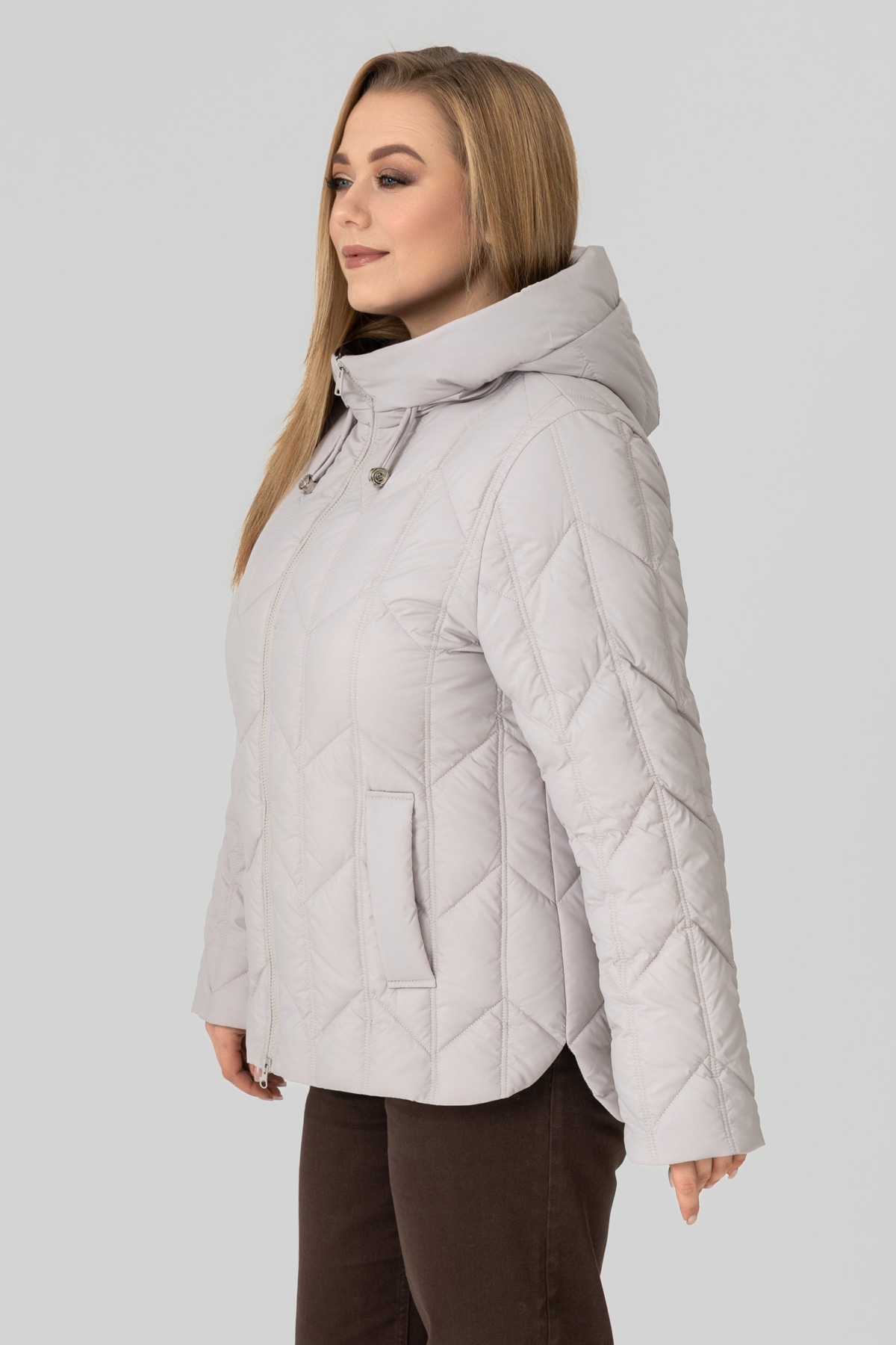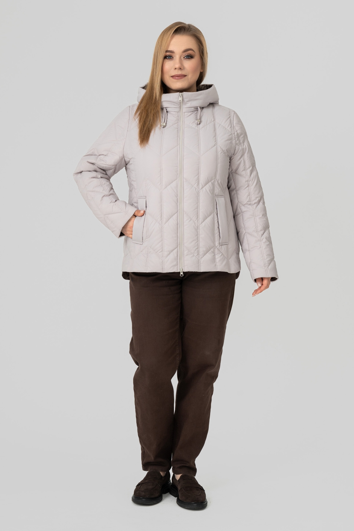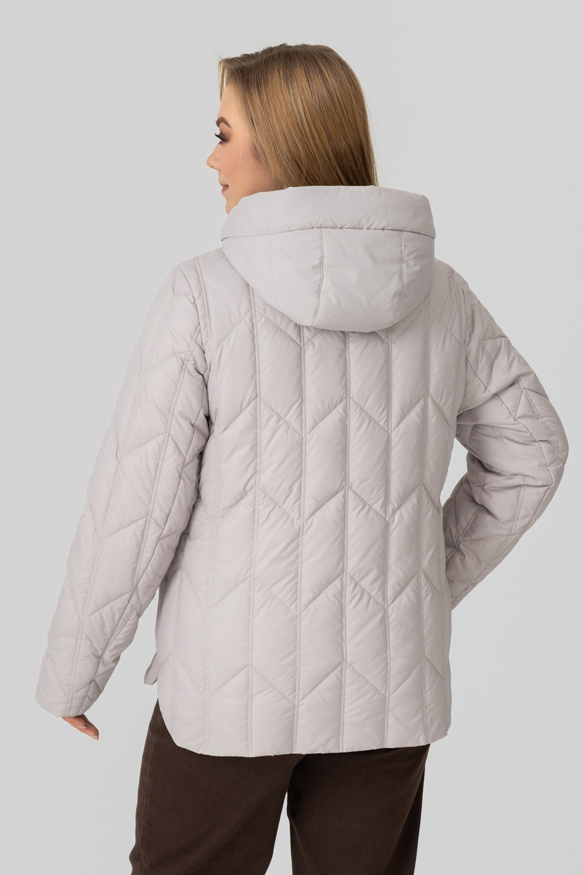 Куртка - пуховик прямого силуету, виконана з плащової тканини. Наповнювач: біопух 100 (г/м²). Рукав втачний, двошовний. Кишеня з листочкою, застібається на потайну кнопку. Капюшон втачний, висота регулюється за допомогою шнура з фіксаторами. Застібка на блискавку. Температурний режим: до -1 °C. Підкладка: нейлон.