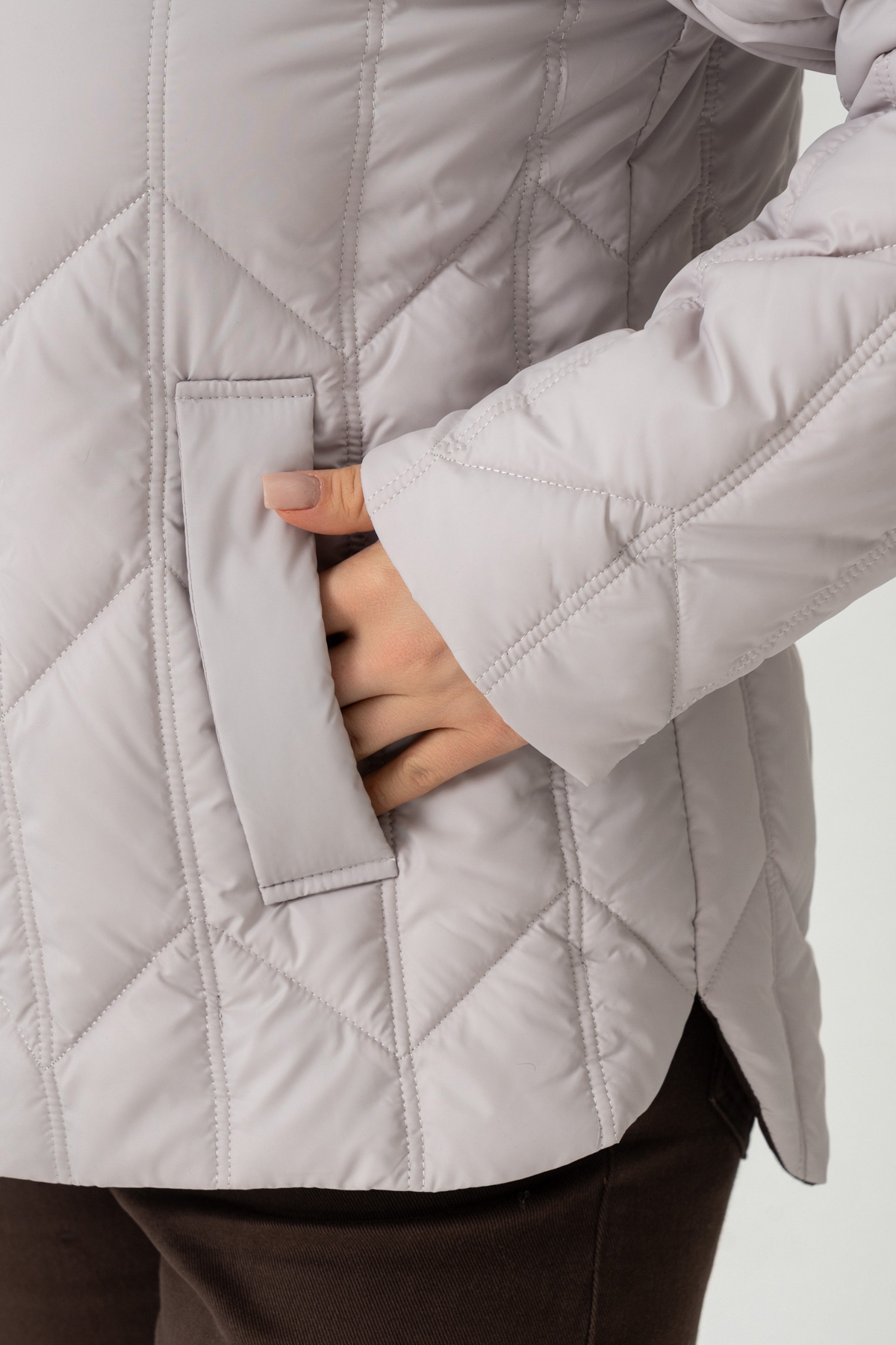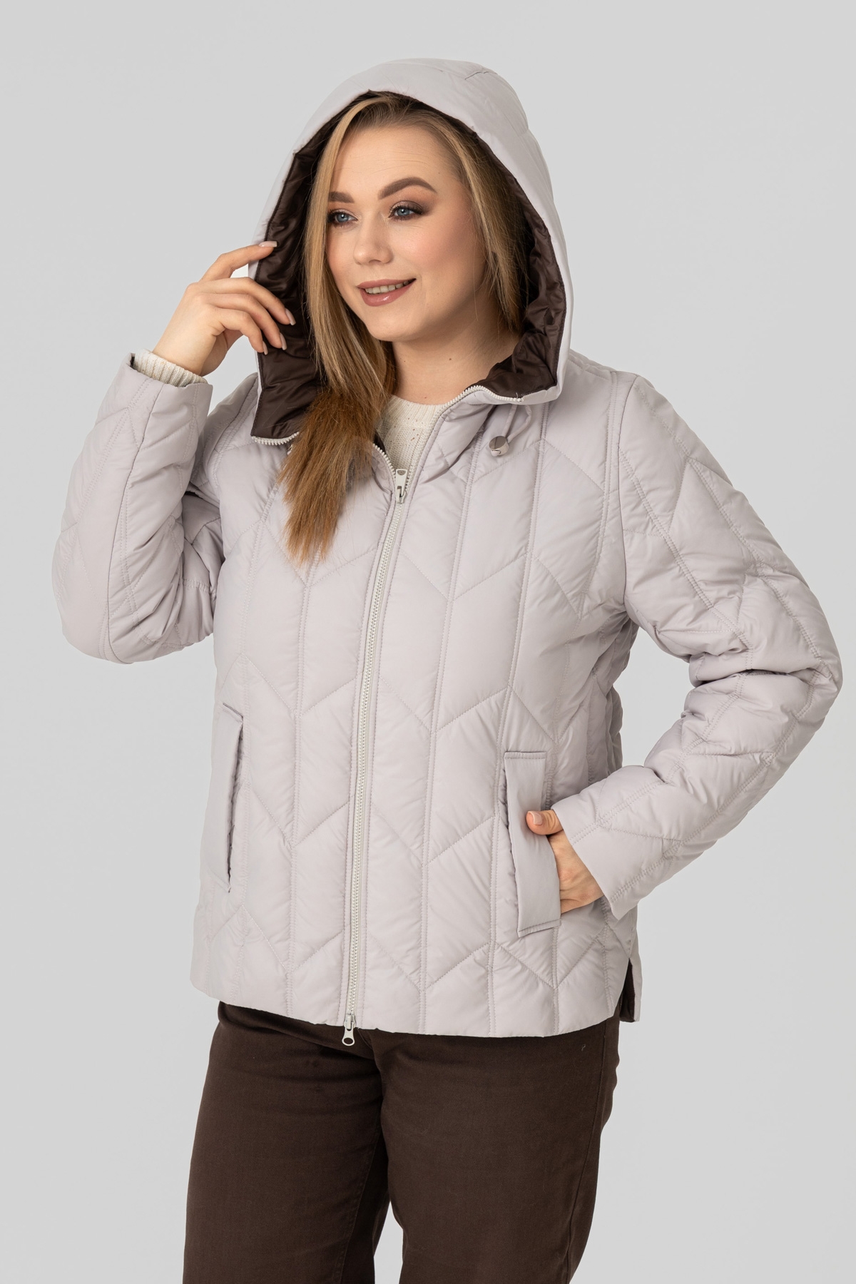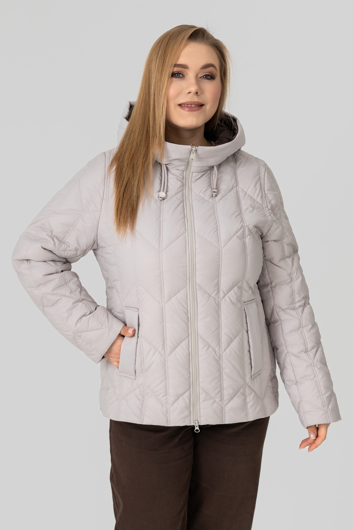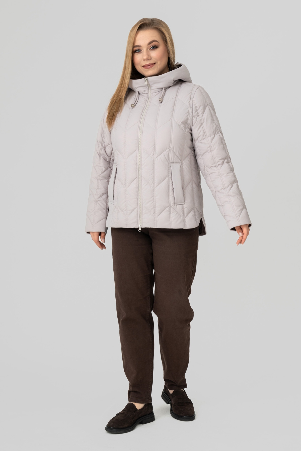 Куртка - пуховик прямого силуету, виконана з плащової тканини. Наповнювач: біопух 100 (г/м²). Рукав втачний, двошовний. Кишеня з листочкою, застібається на потайну кнопку. Капюшон втачний, висота регулюється за допомогою шнура з фіксаторами. Застібка на блискавку. Температурний режим: до -1 °C. Підкладка: нейлон.