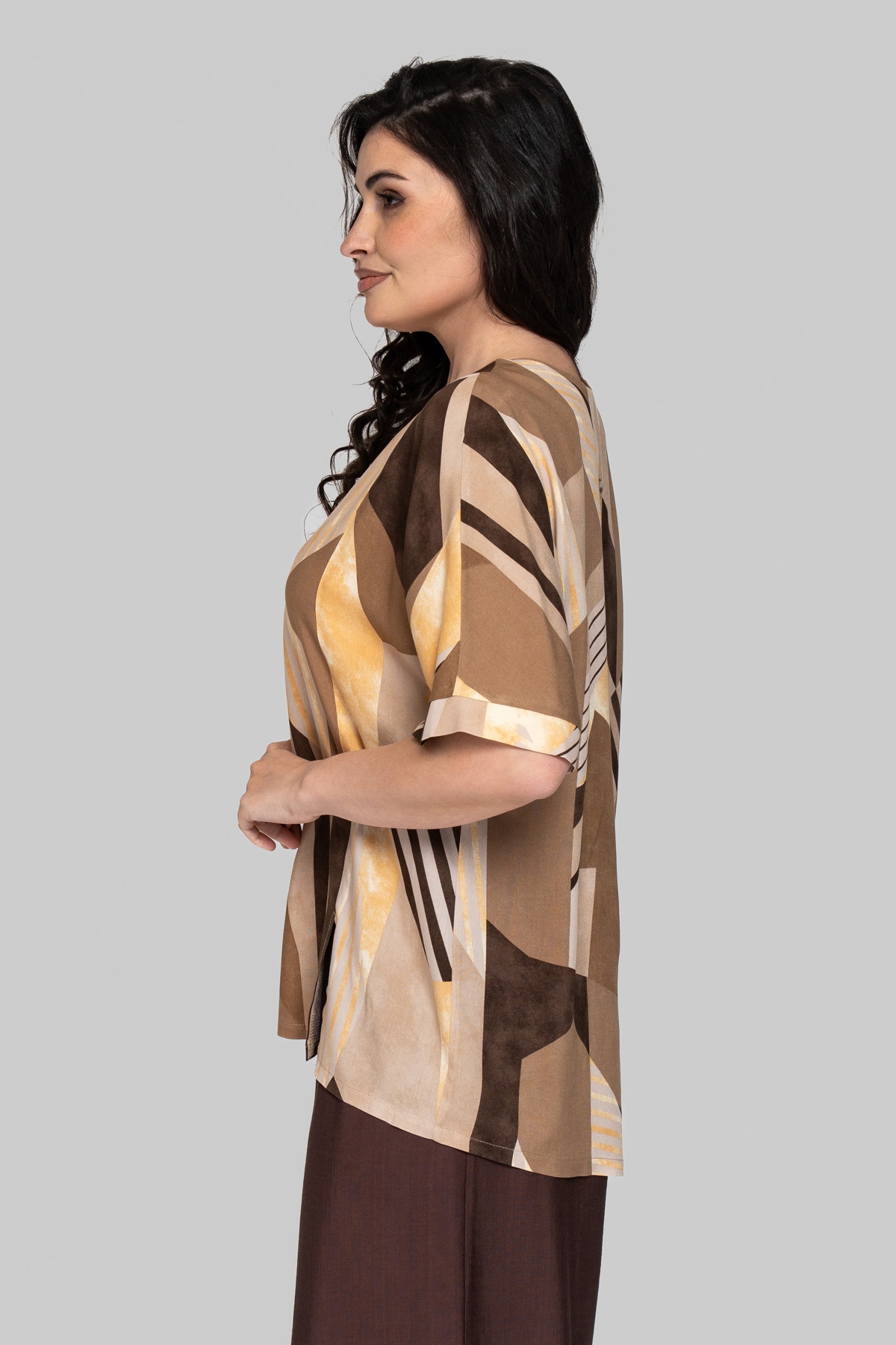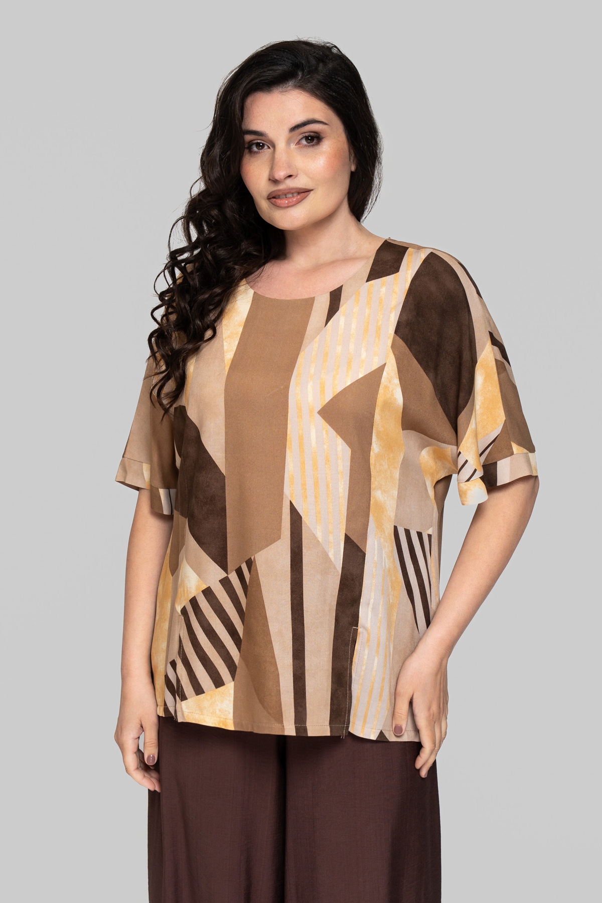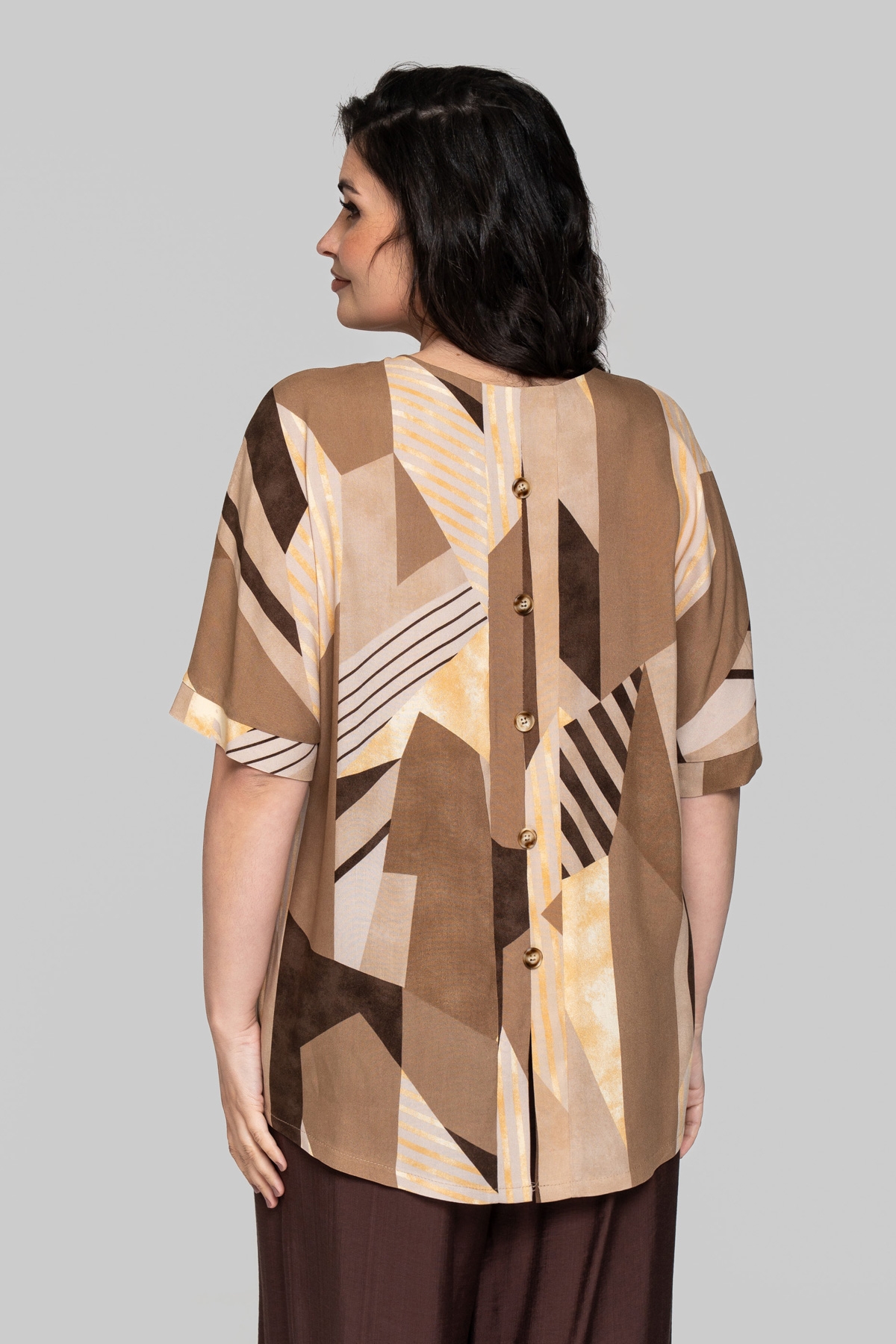 Блуза прямого силуету без підкладки. Виконана зі штапеля. Тканина легка і тактильно приємна, але також має підвищену міцність і практичність, що відмінно підходить літнім моделям для повсякденного використання. Рукав цільнокроєний, на манжеті. По рельєфних швах унизу виконані розрізи. На спинці імітація планки із ґудзиками.