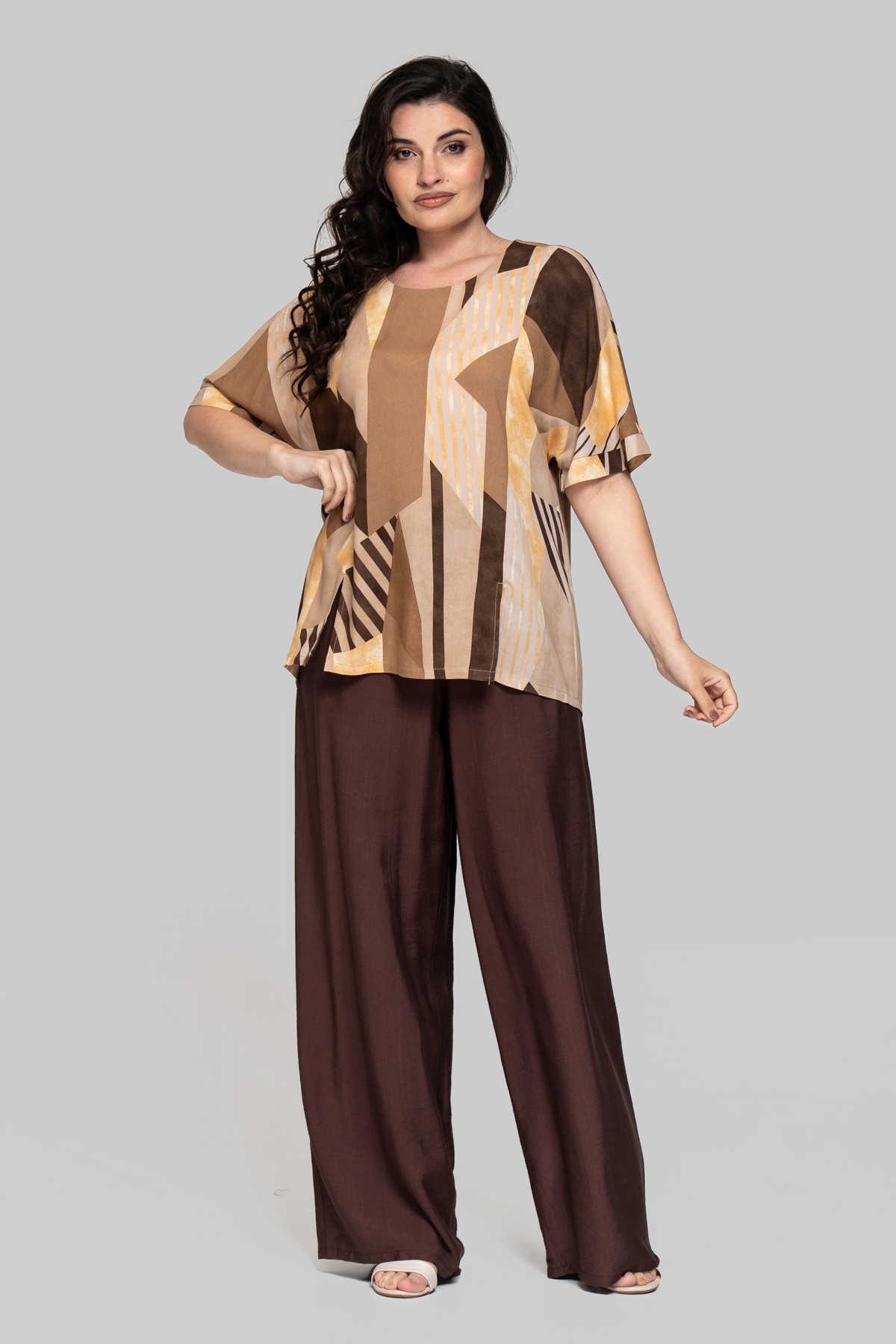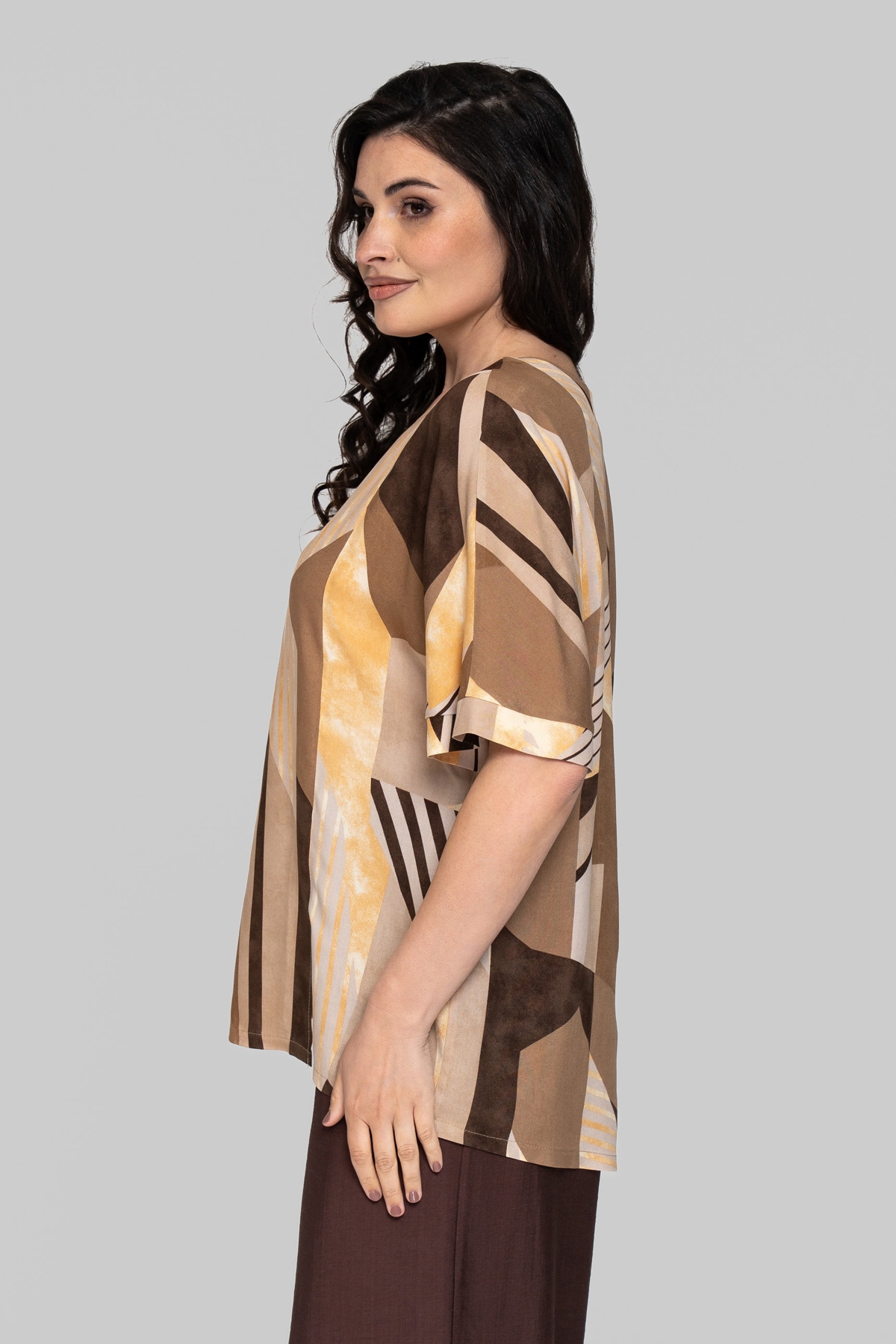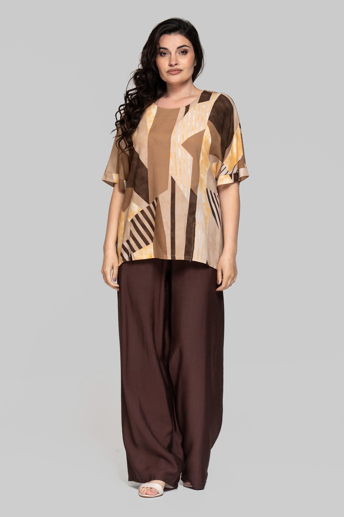 Блуза прямого силуету без підкладки. Виконана зі штапеля. Тканина легка і тактильно приємна, але також має підвищену міцність і практичність, що відмінно підходить літнім моделям для повсякденного використання. Рукав цільнокроєний, на манжеті. По рельєфних швах унизу виконані розрізи. На спинці імітація планки із ґудзиками.