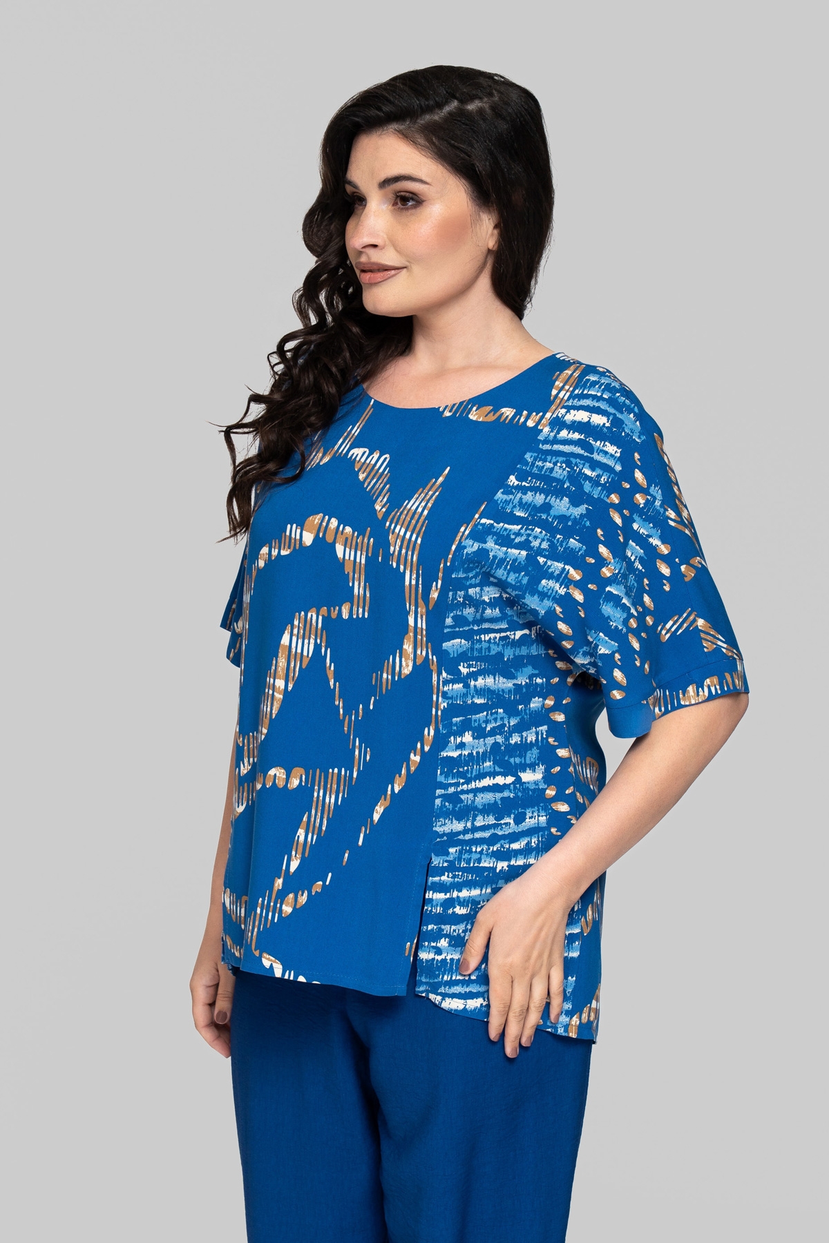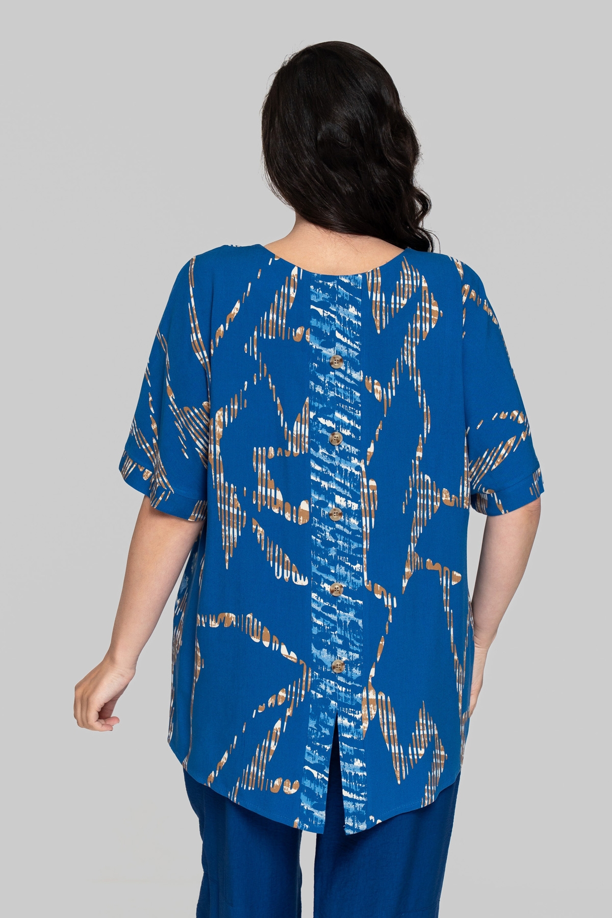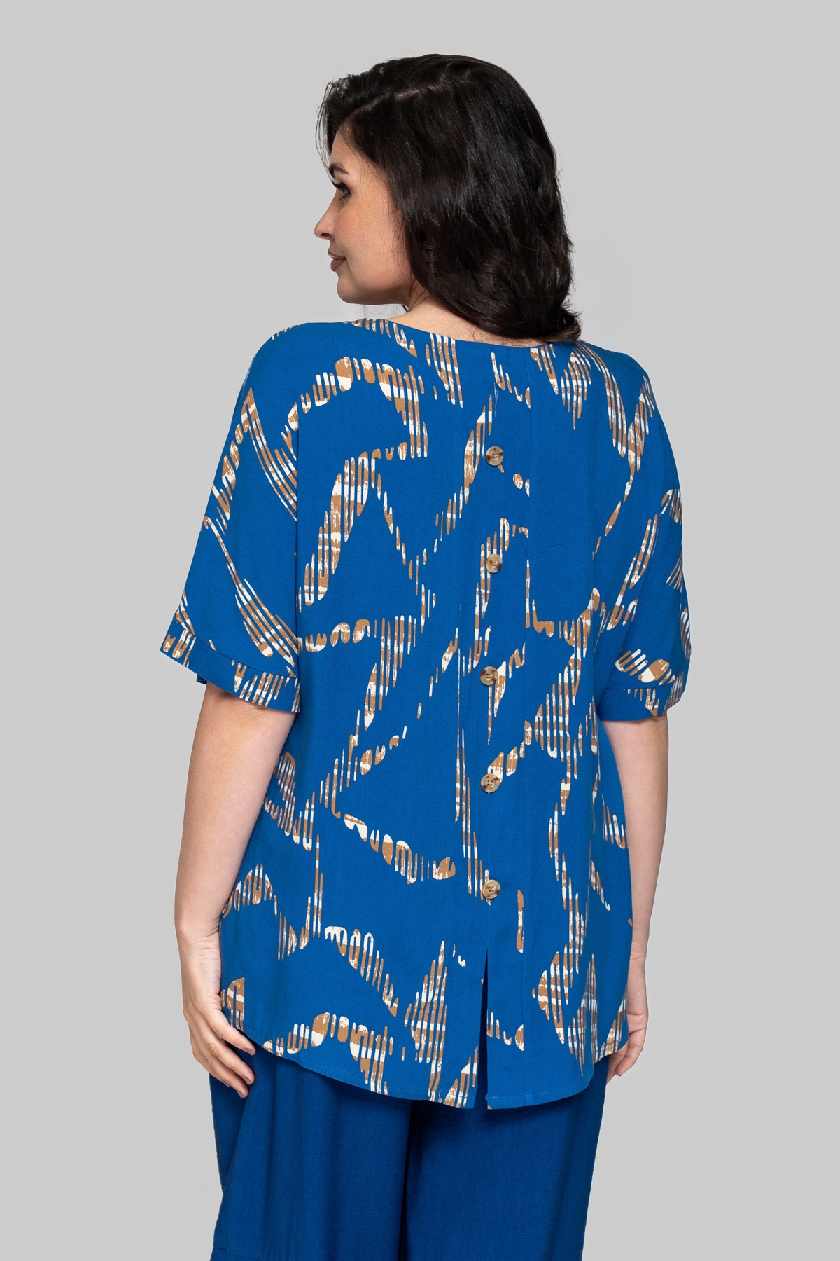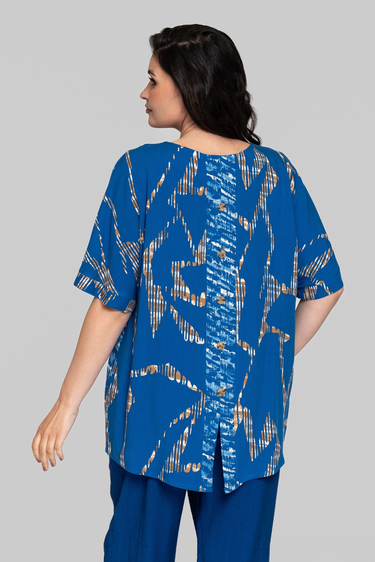 Блуза прямого силуету без підкладки. Виконана зі штапеля. Тканина легка і тактильно приємна, але також має підвищену міцність і практичність, що відмінно підходить літнім моделям для повсякденного використання. Рукав цільнокроєний, на манжеті. По рельєфних швах унизу виконані розрізи. На спинці імітація планки із ґудзиками.