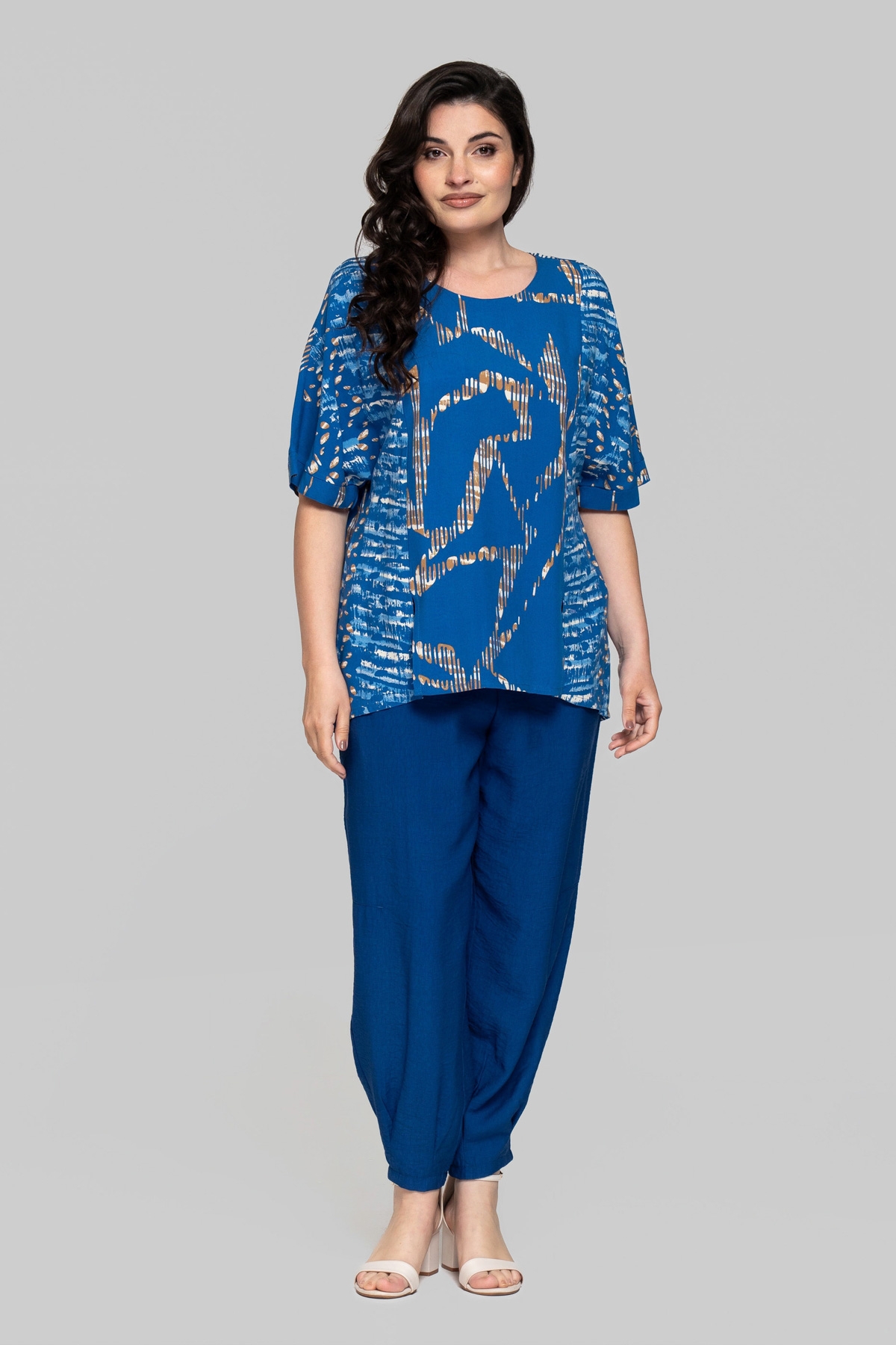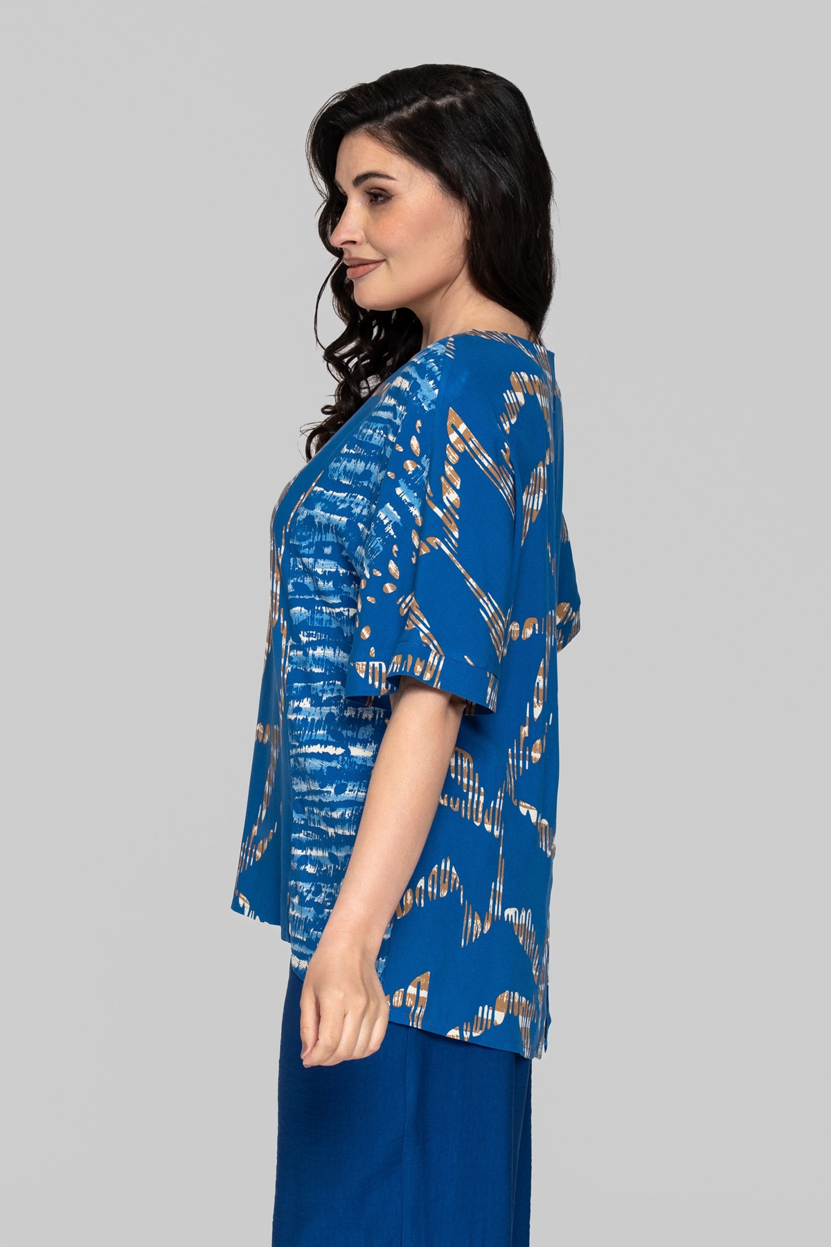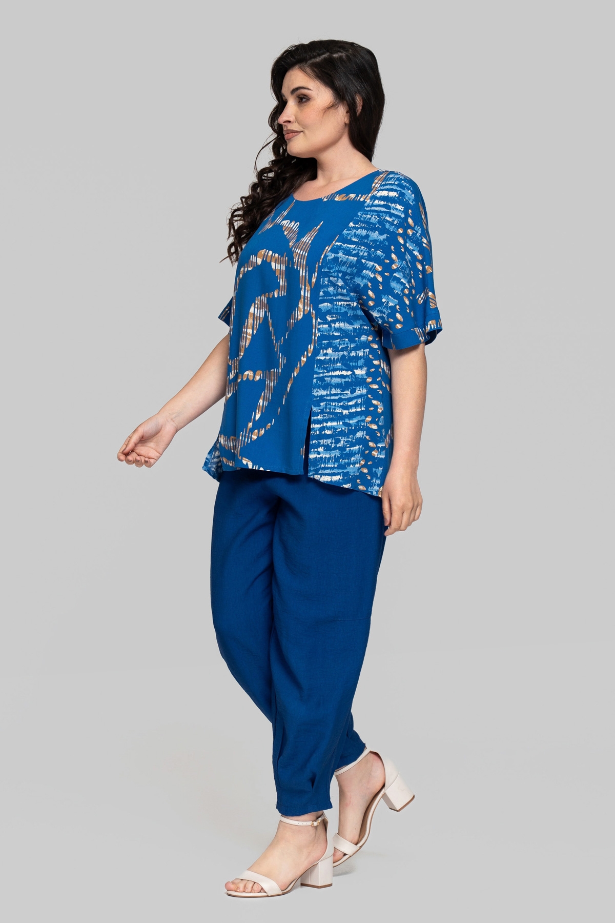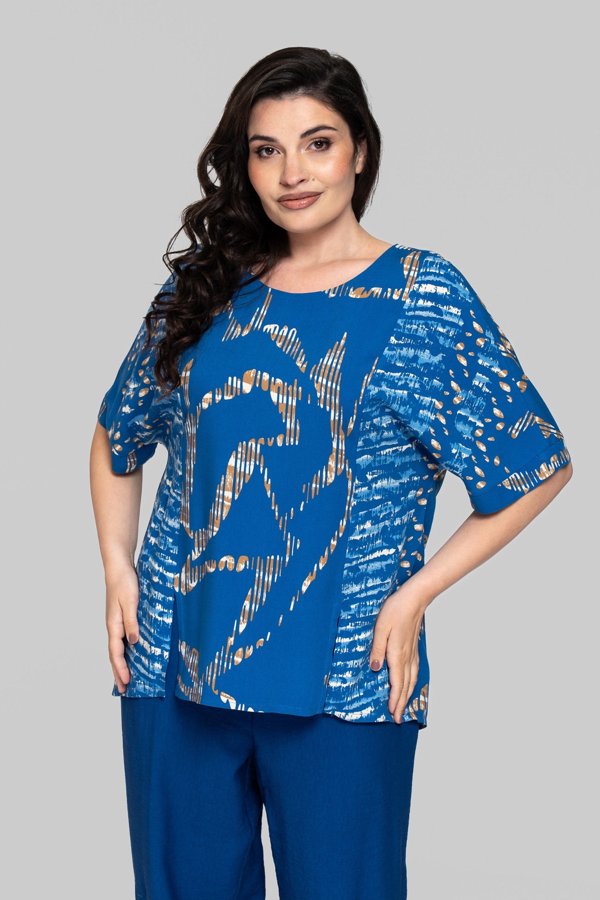 Блуза прямого силуету без підкладки. Виконана зі штапеля. Тканина легка і тактильно приємна, але також має підвищену міцність і практичність, що відмінно підходить літнім моделям для повсякденного використання. Рукав цільнокроєний, на манжеті. По рельєфних швах унизу виконані розрізи. На спинці імітація планки із ґудзиками.