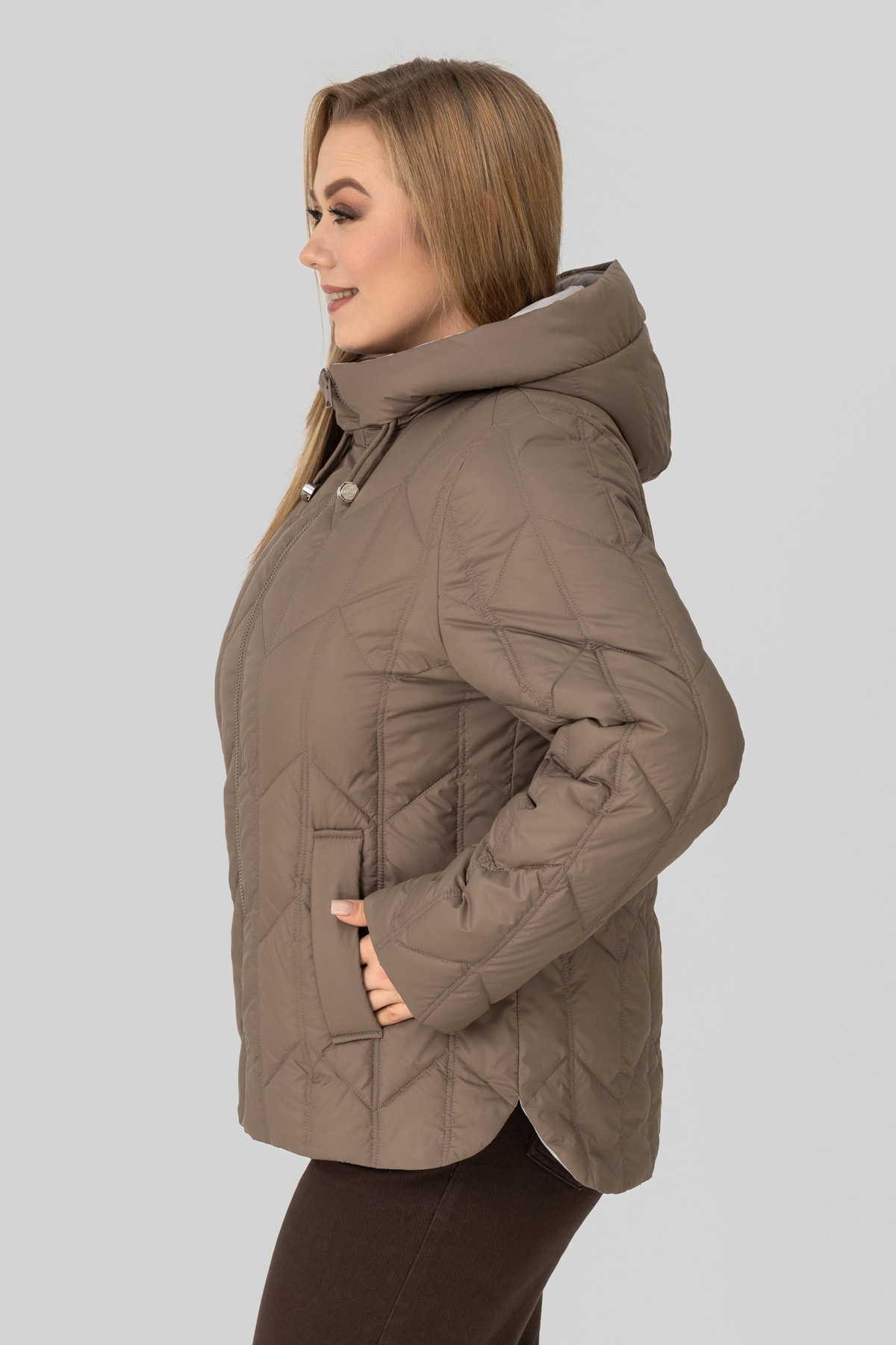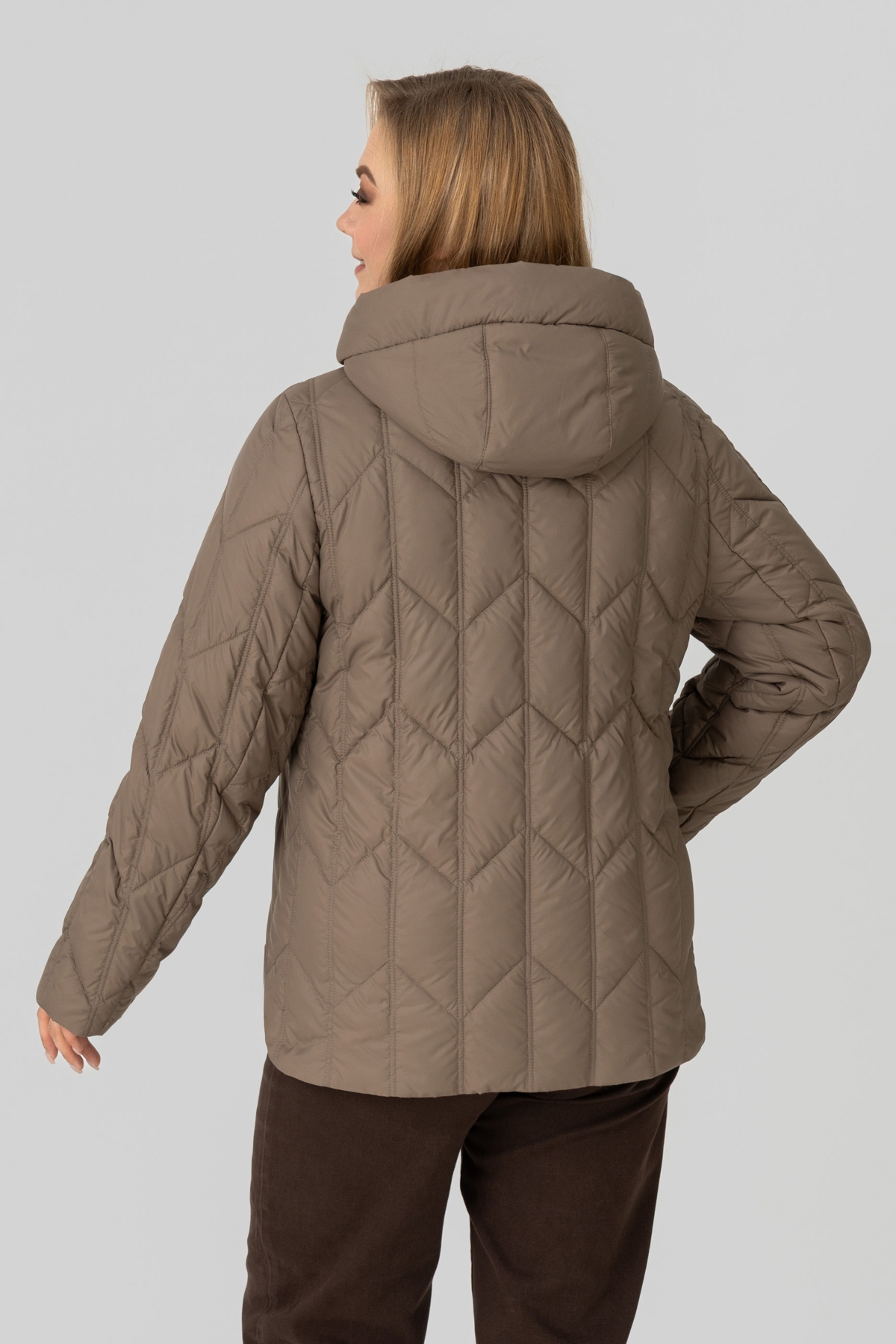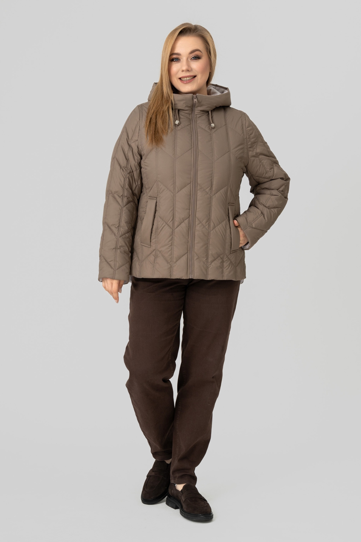 Куртка - пуховик прямого силуету, виконана з плащової тканини. Наповнювач: біопух 100 (г/м²). Рукав втачний, двошовний. Кишеня з листочкою, застібається на потайну кнопку. Капюшон втачний, висота регулюється за допомогою шнура з фіксаторами. Застібка на блискавку. Температурний режим: до -1 °C. Підкладка: нейлон.