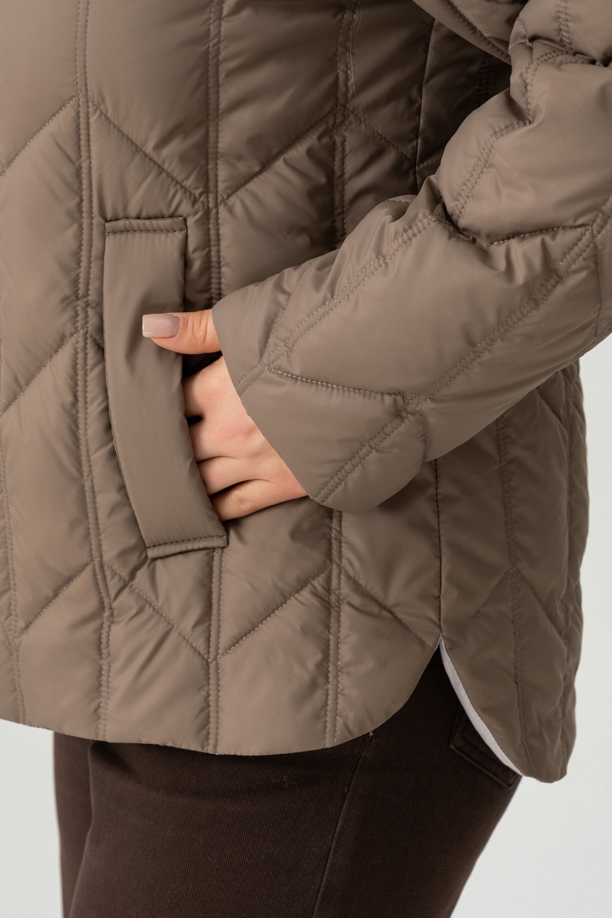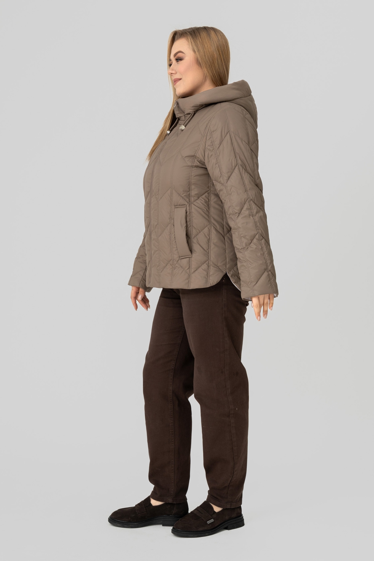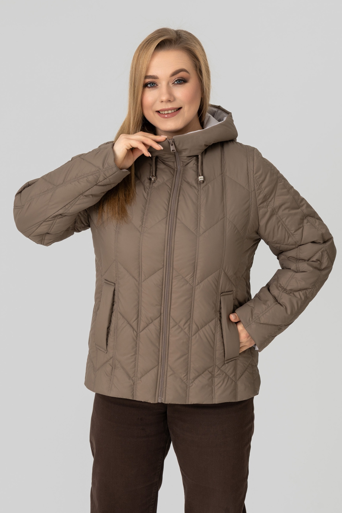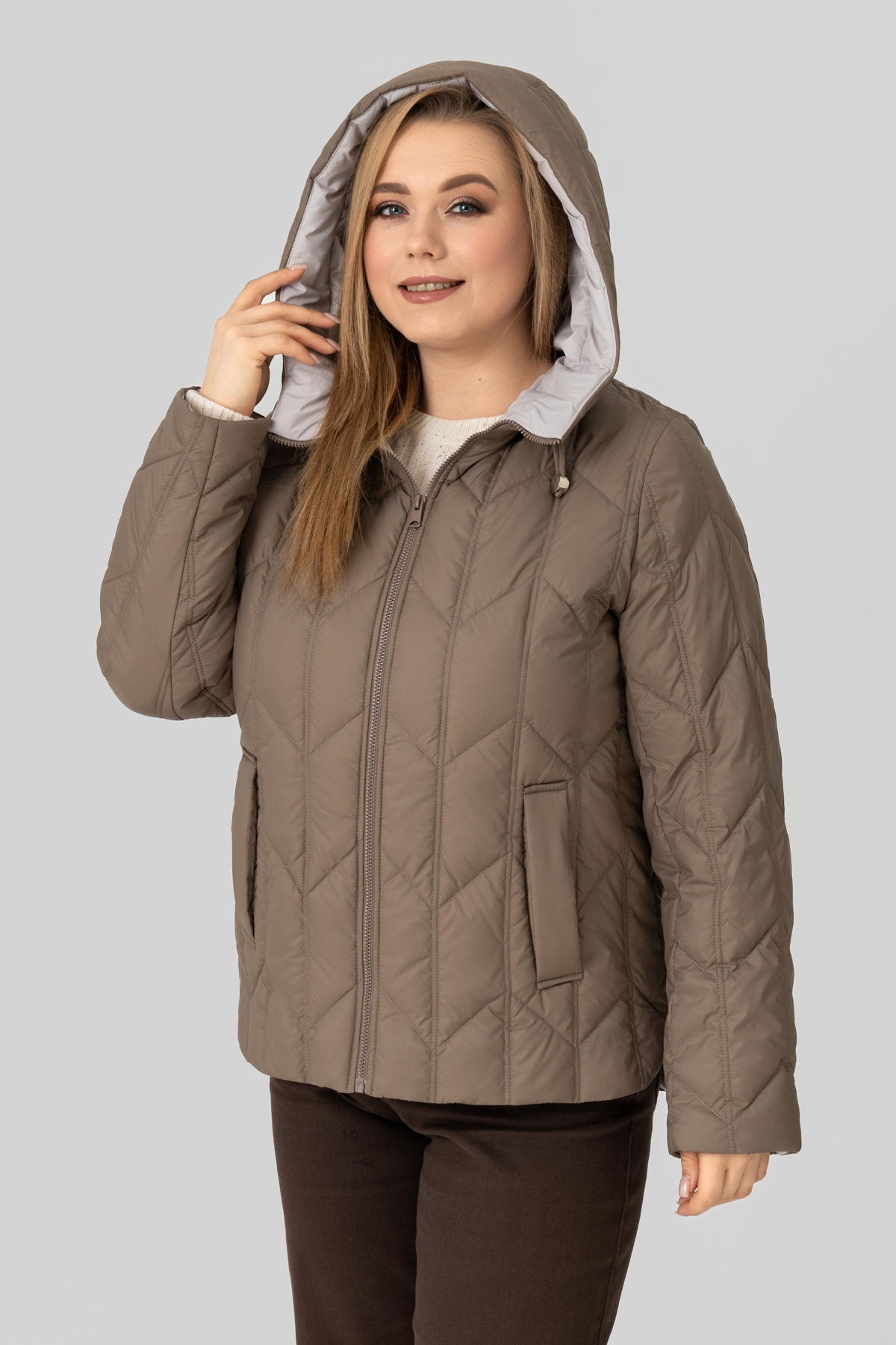 Куртка - пуховик прямого силуету, виконана з плащової тканини. Наповнювач: біопух 100 (г/м²). Рукав втачний, двошовний. Кишеня з листочкою, застібається на потайну кнопку. Капюшон втачний, висота регулюється за допомогою шнура з фіксаторами. Застібка на блискавку. Температурний режим: до -1 °C. Підкладка: нейлон.