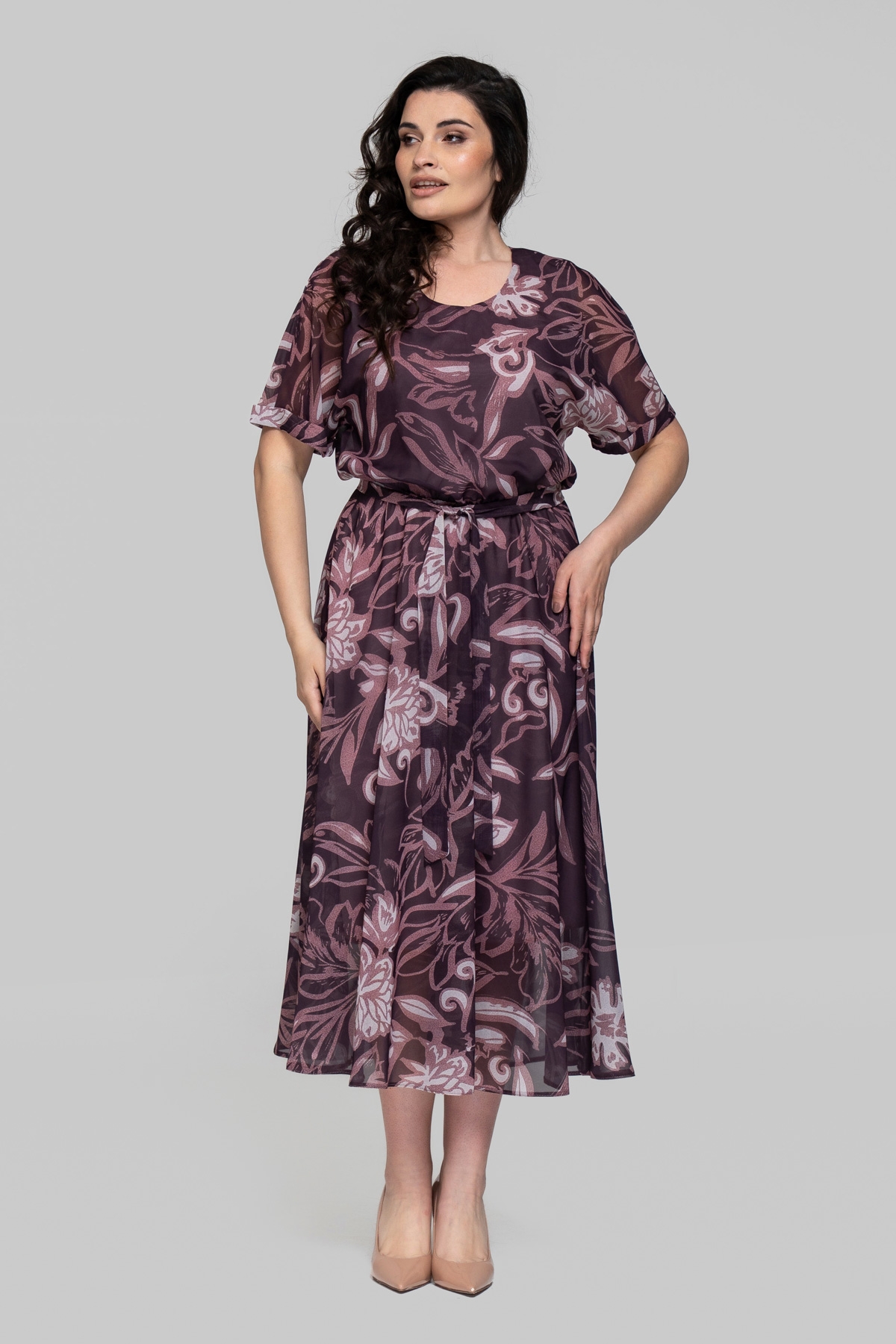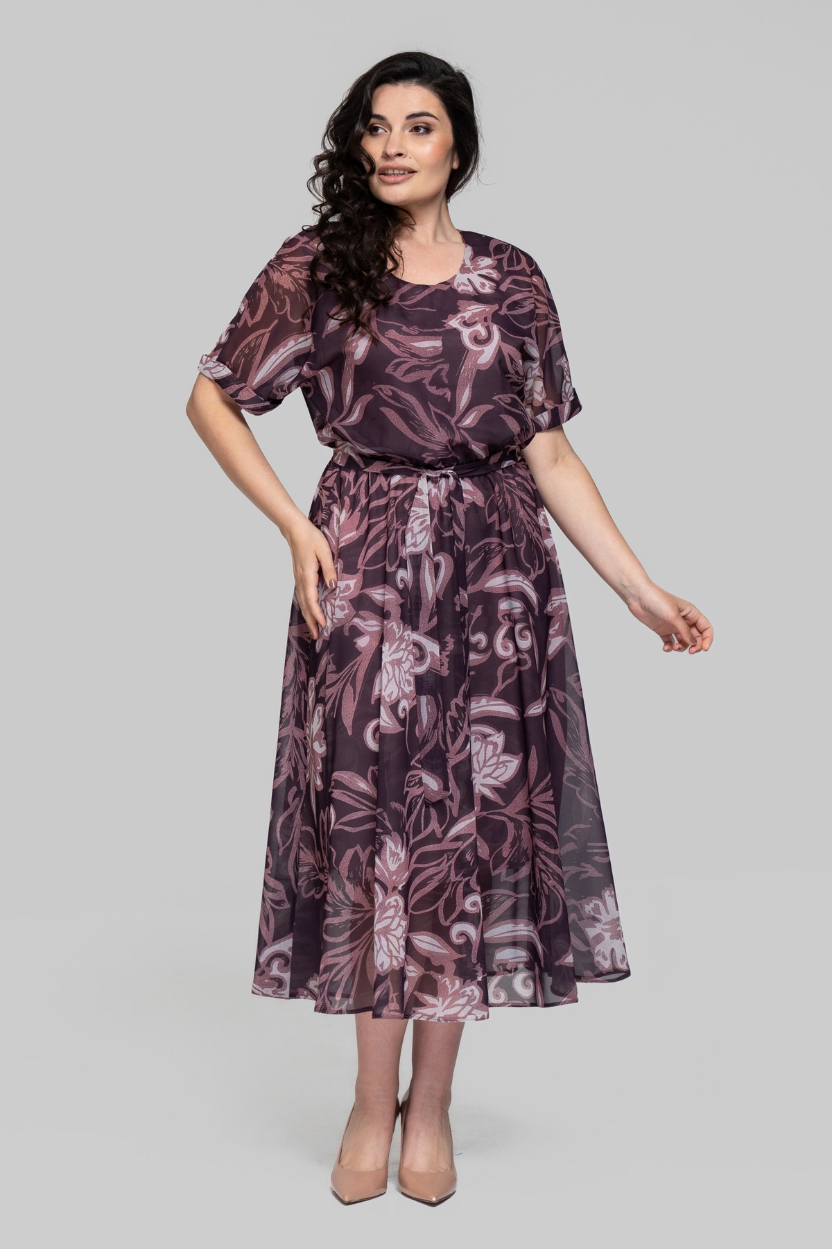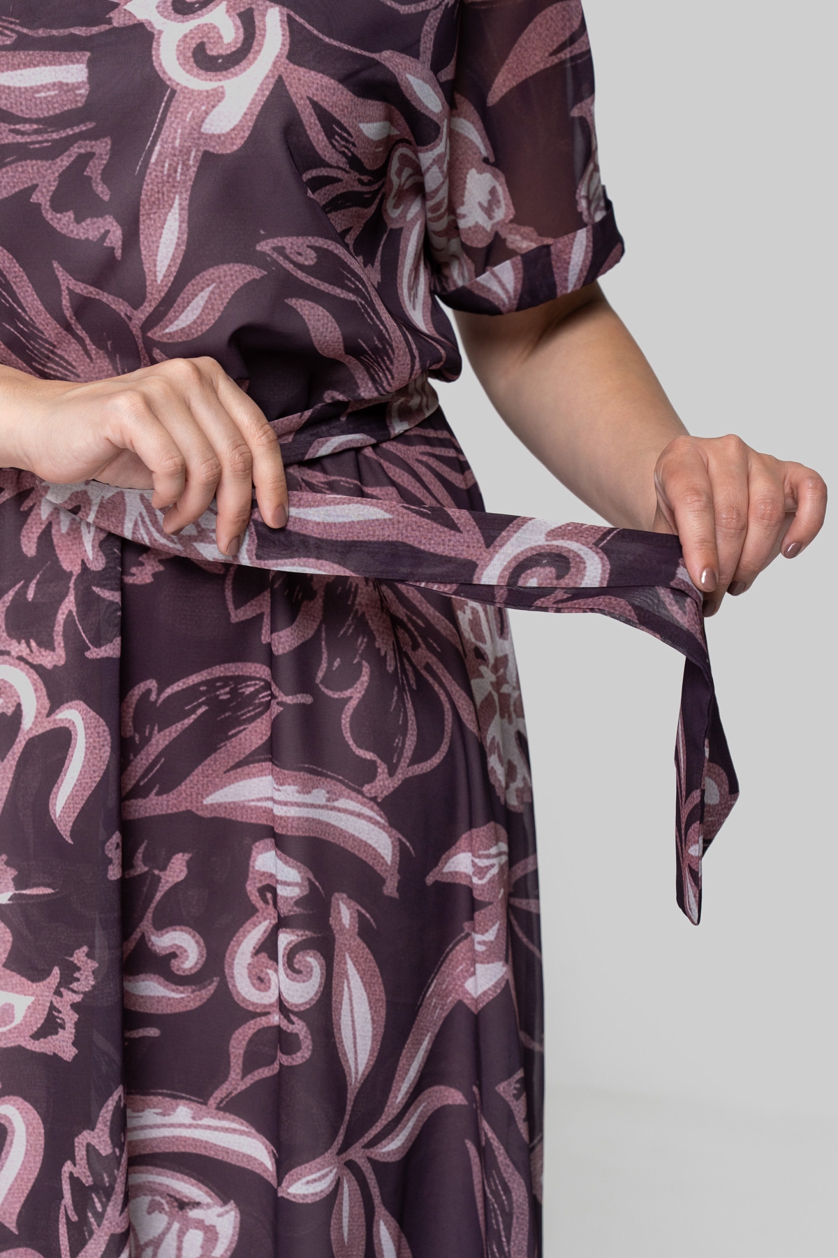 Сукня вільного крою. Виконано з шифона з еластичною трикотажною підкладкою. По лінії талії проходить еластична стрічка (розтяжність 8–10 см). Рукав цільного крою, на відкладній манжеті. У комплекті: пояс із тієї ж тканини.
