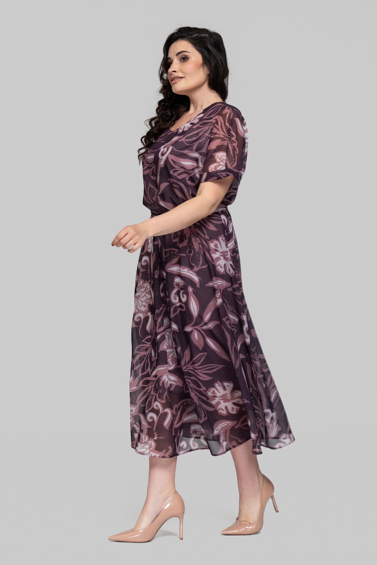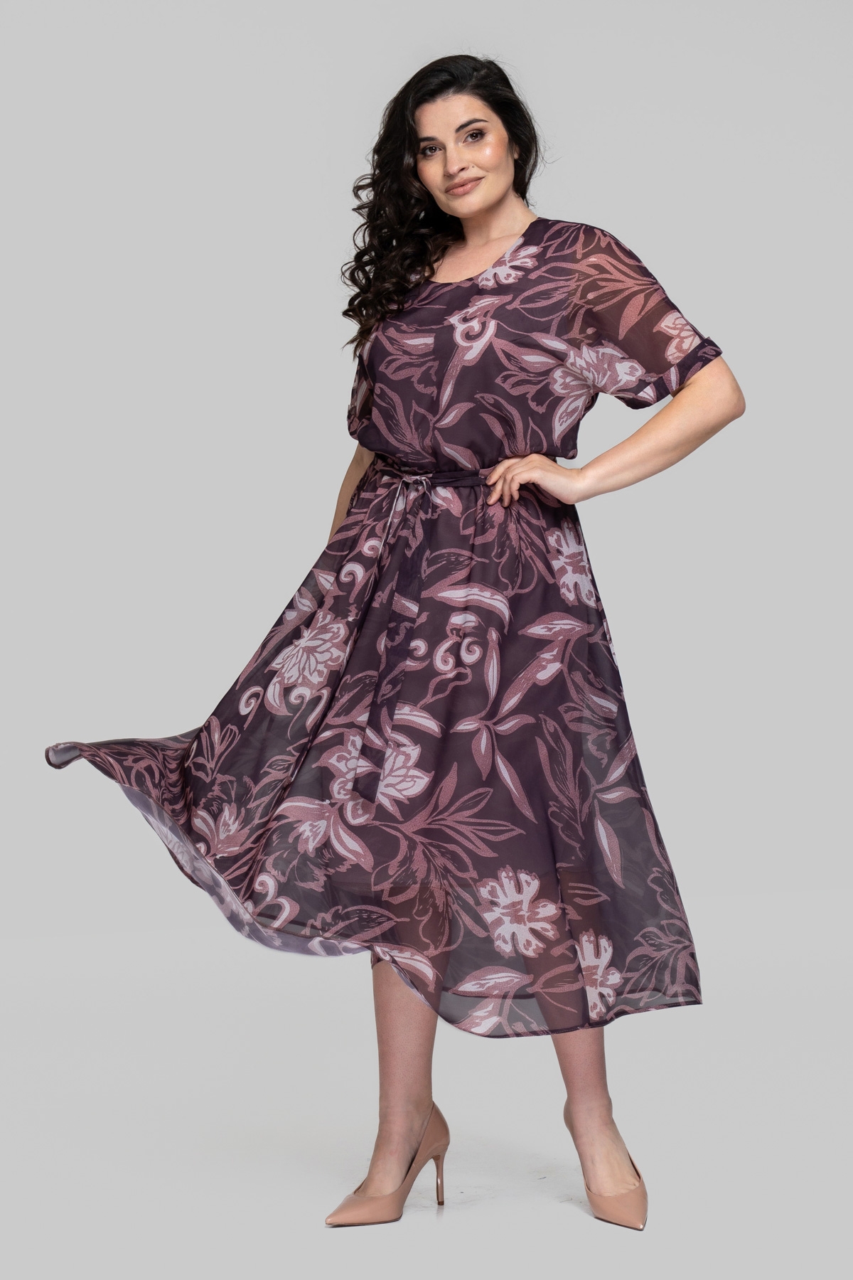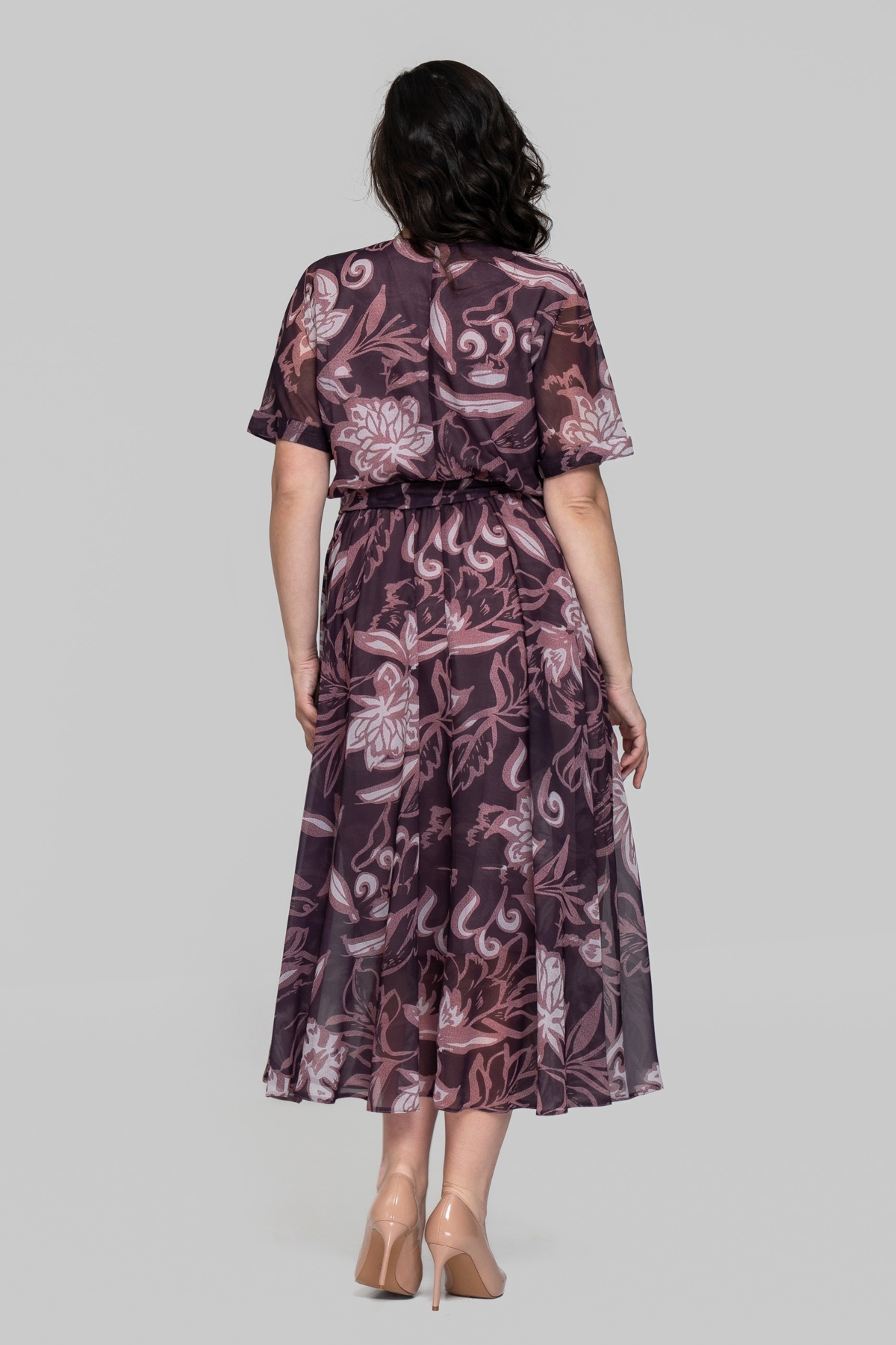 Сукня вільного крою. Виконано з шифона з еластичною трикотажною підкладкою. По лінії талії проходить еластична стрічка (розтяжність 8–10 см). Рукав цільного крою, на відкладній манжеті. У комплекті: пояс із тієї ж тканини.