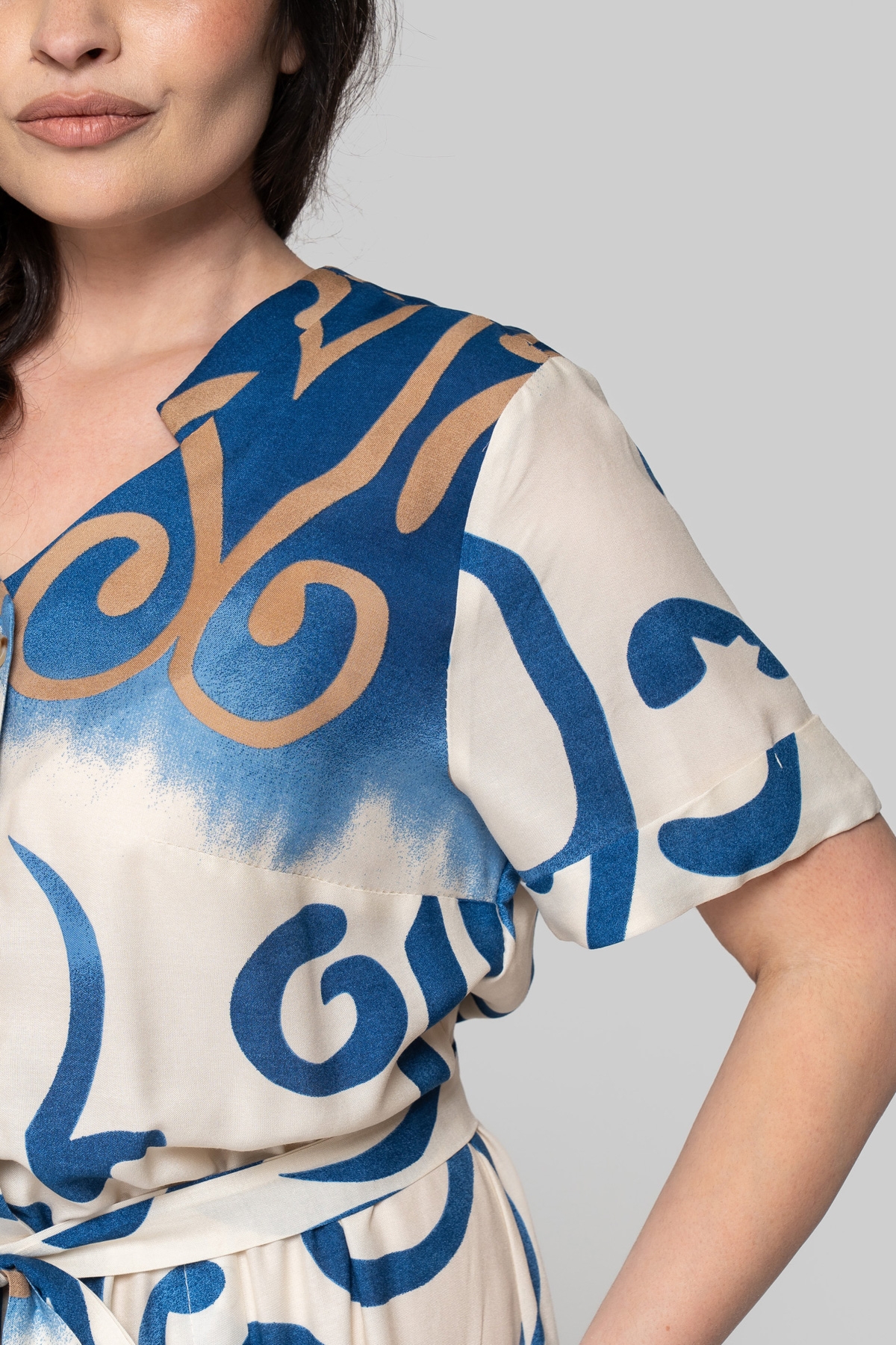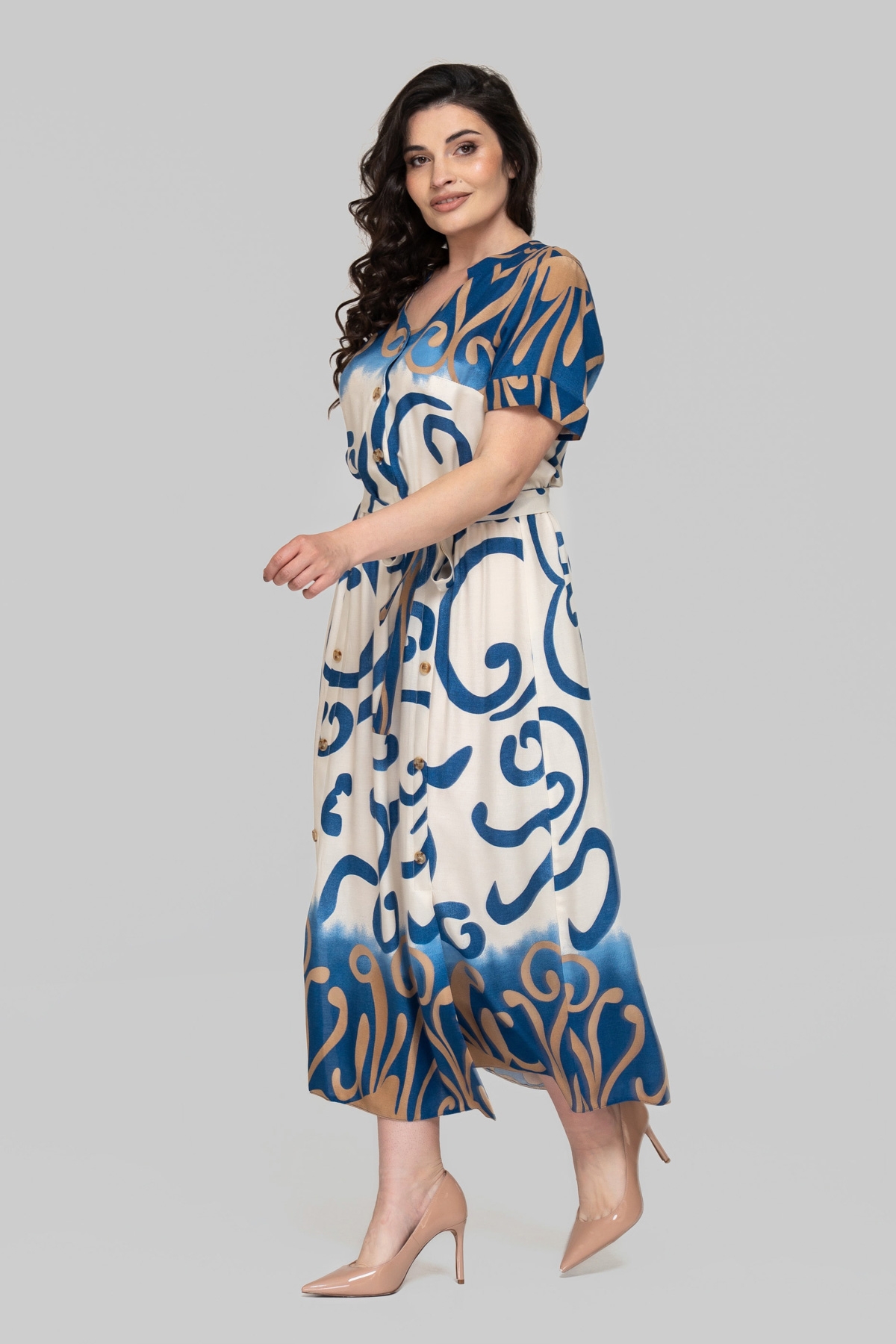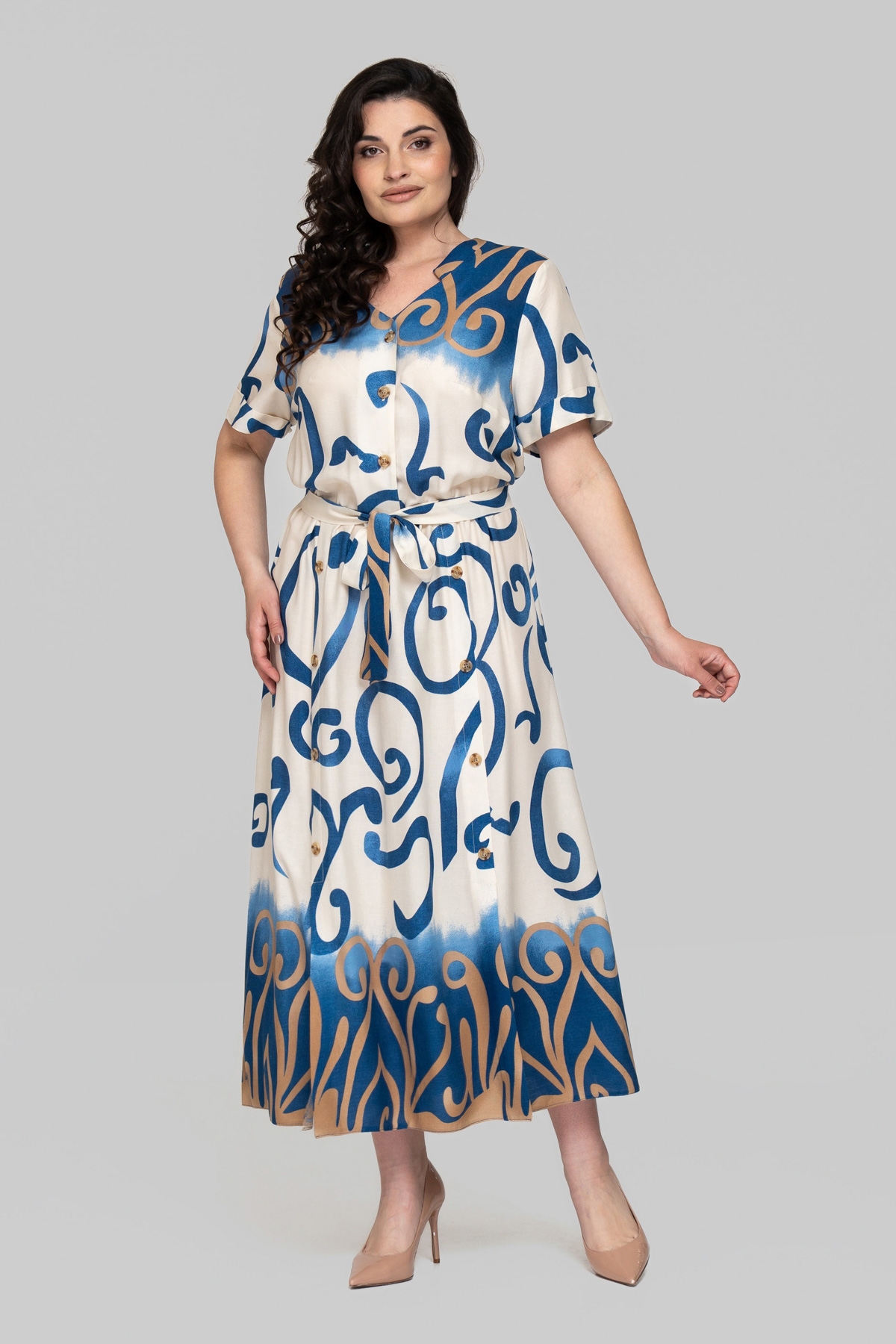 Сукня приталеного силуету з V-подібним вирізом. Виконана зі штапелю, тканина легка та приємна на дотик, але також має підвищену міцність і практичність, еластичність низька. По лінії талії проходить еластична стрічка (розтяжність 8–10 см). Рукав вшитий, одношовний на манжеті. На грудях виконана застібка на ґудзики, також спереду виконано 2 декоративні планки на ґудзиках. У комплекті: пояс з тієї ж тканини.