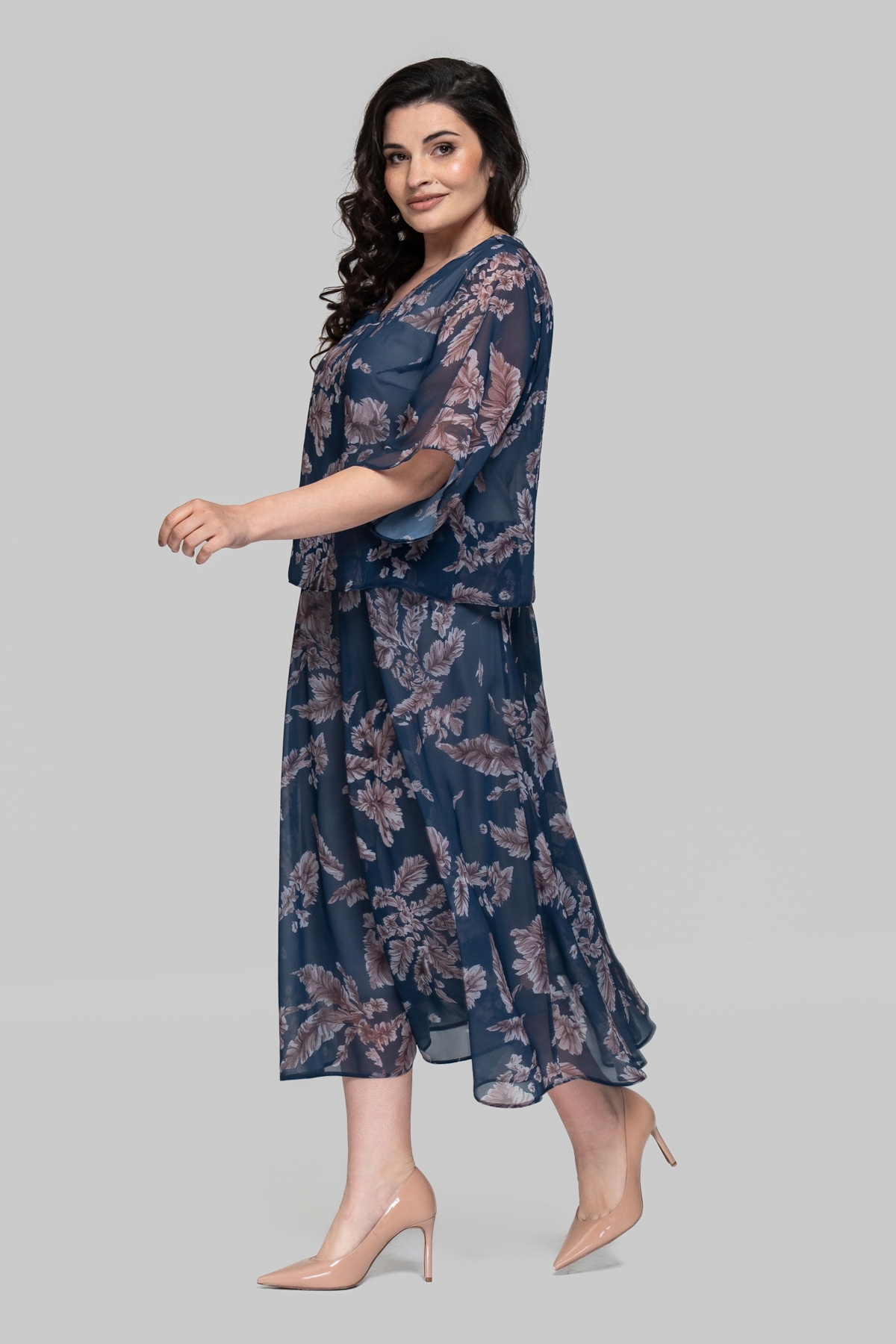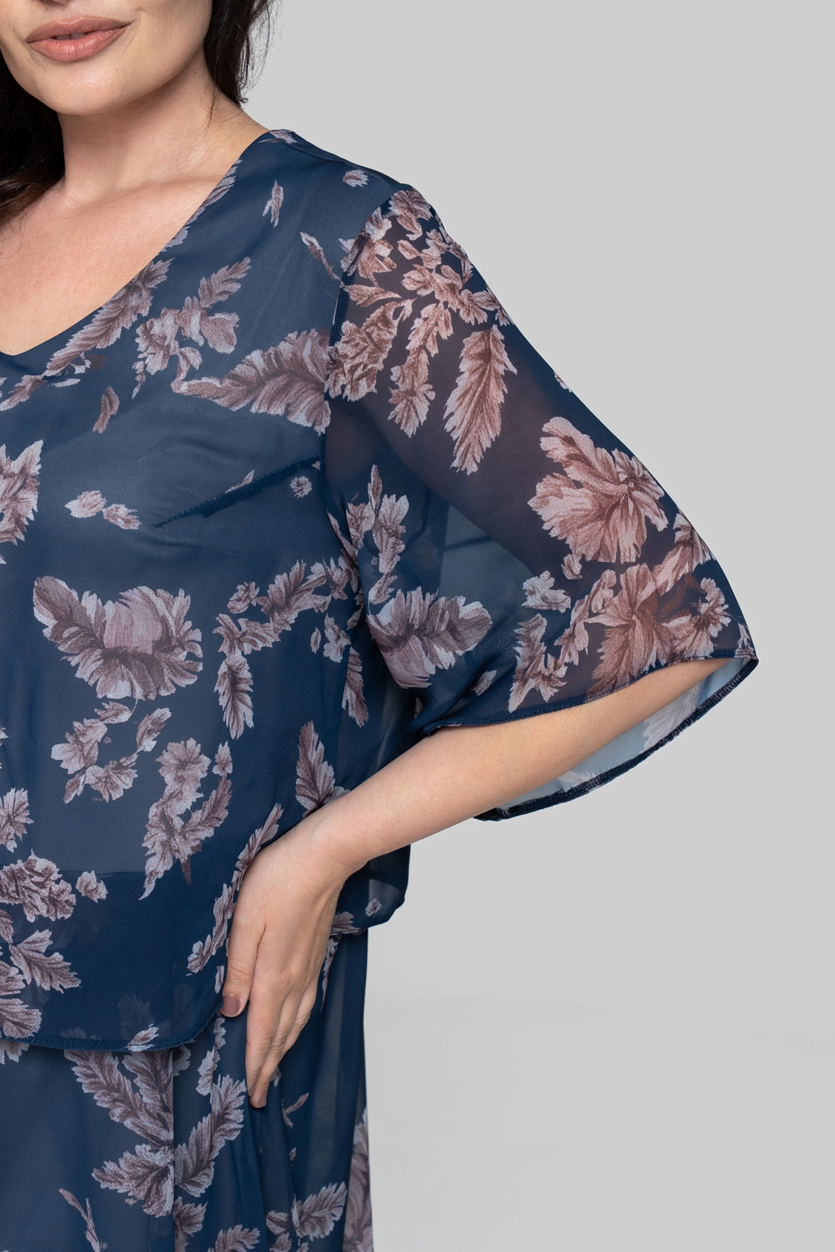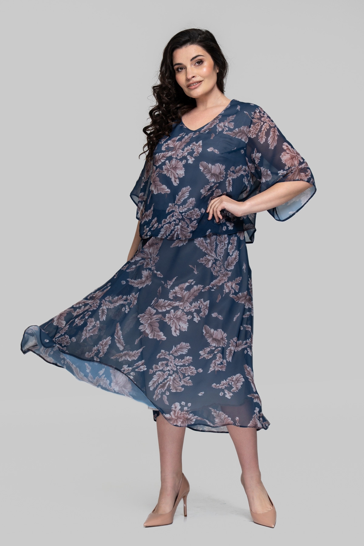 Легке літнє плаття вільного силуету. Виконано із шифону(Туреччина) з еластичною трикотажною підкладкою, розкльошене донизу. Рукав втачний, одношовний. Верх відлітний, спідниця відрізна.