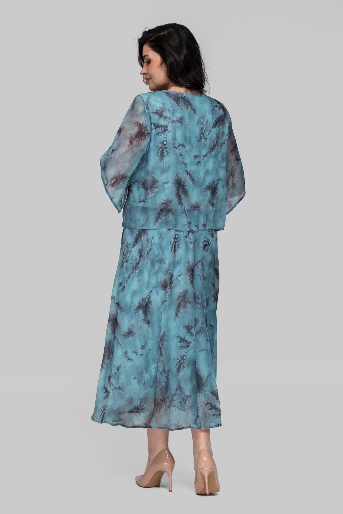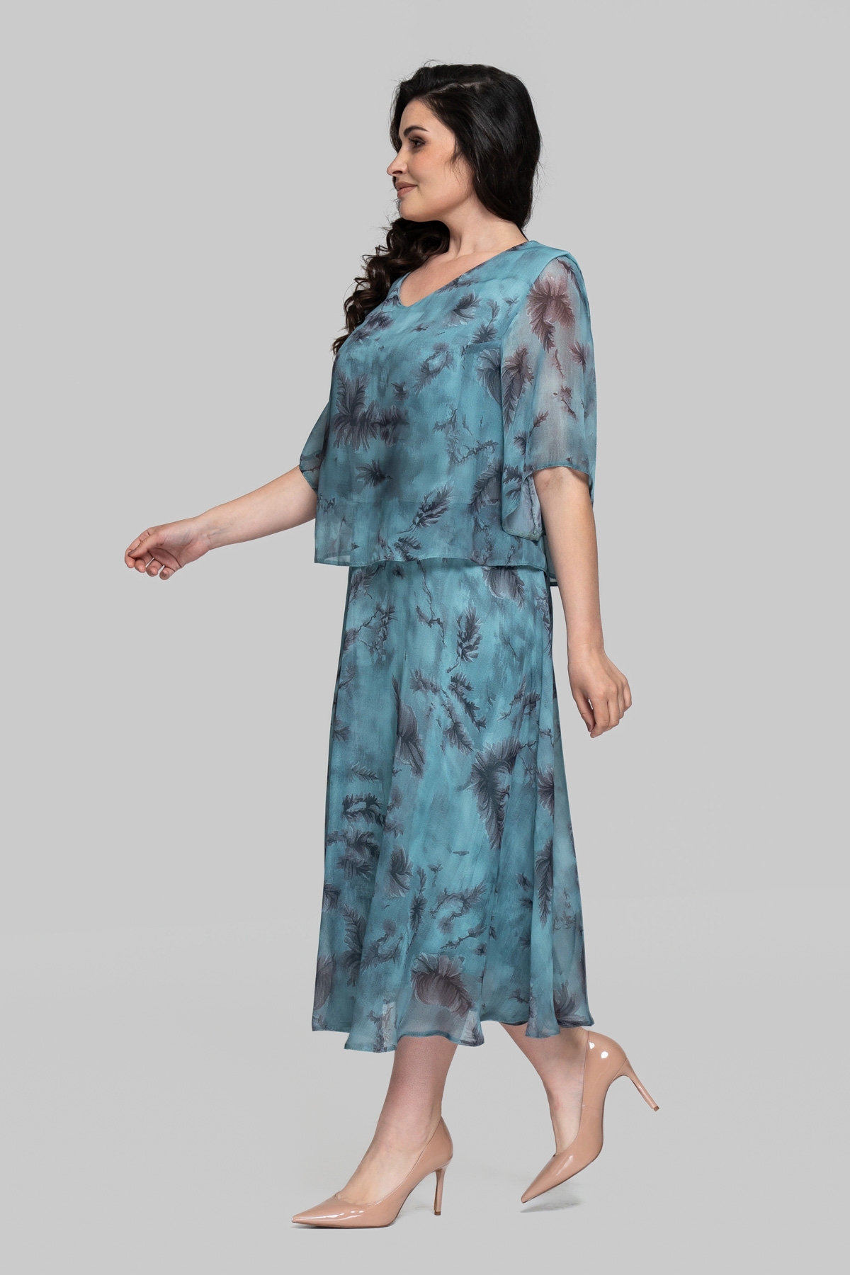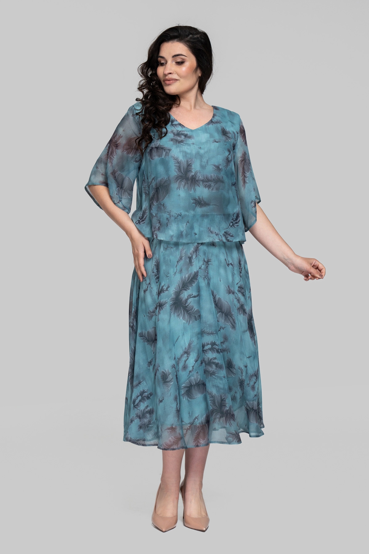 Легке літнє плаття вільного силуету. Виконано із шифону(Туреччина) з еластичною трикотажною підкладкою, розкльошене донизу. Рукав втачний, одношовний. Верх відлітний, спідниця відрізна.