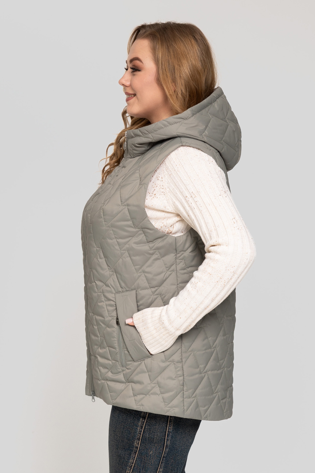 Жилет прямого силуету, виконаний з плащової тканини. Наповнювач: тінсулейт 150 г/м². Застібка на блискавку. Кишеня з фігурним листочком, декорована блискавкою. Капюшон вшитий. Підкладка: нейлон.