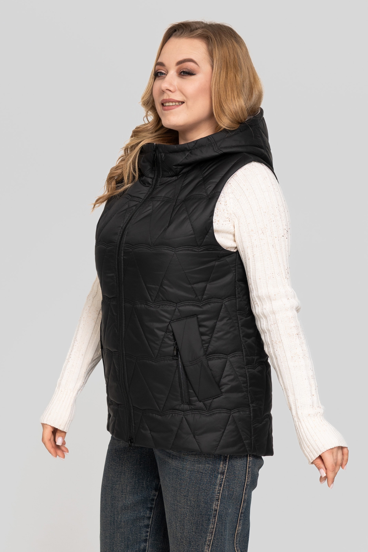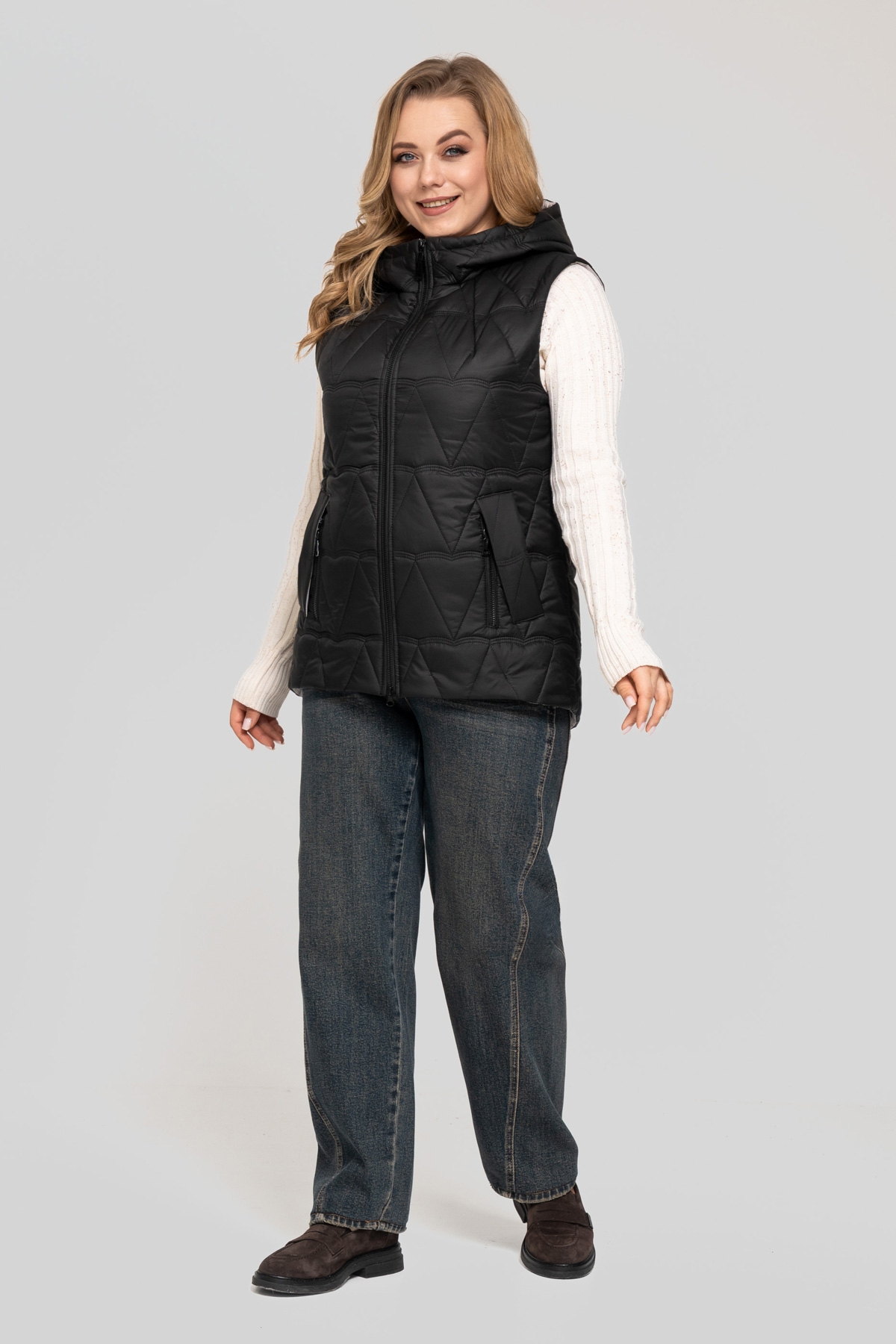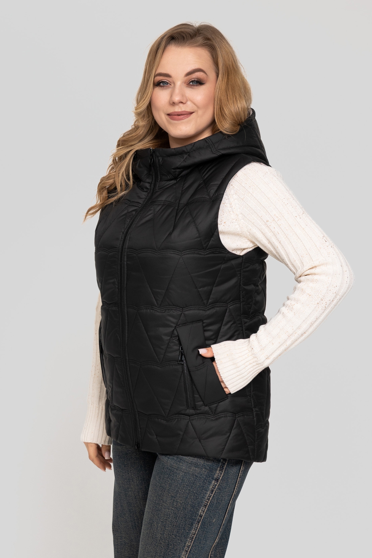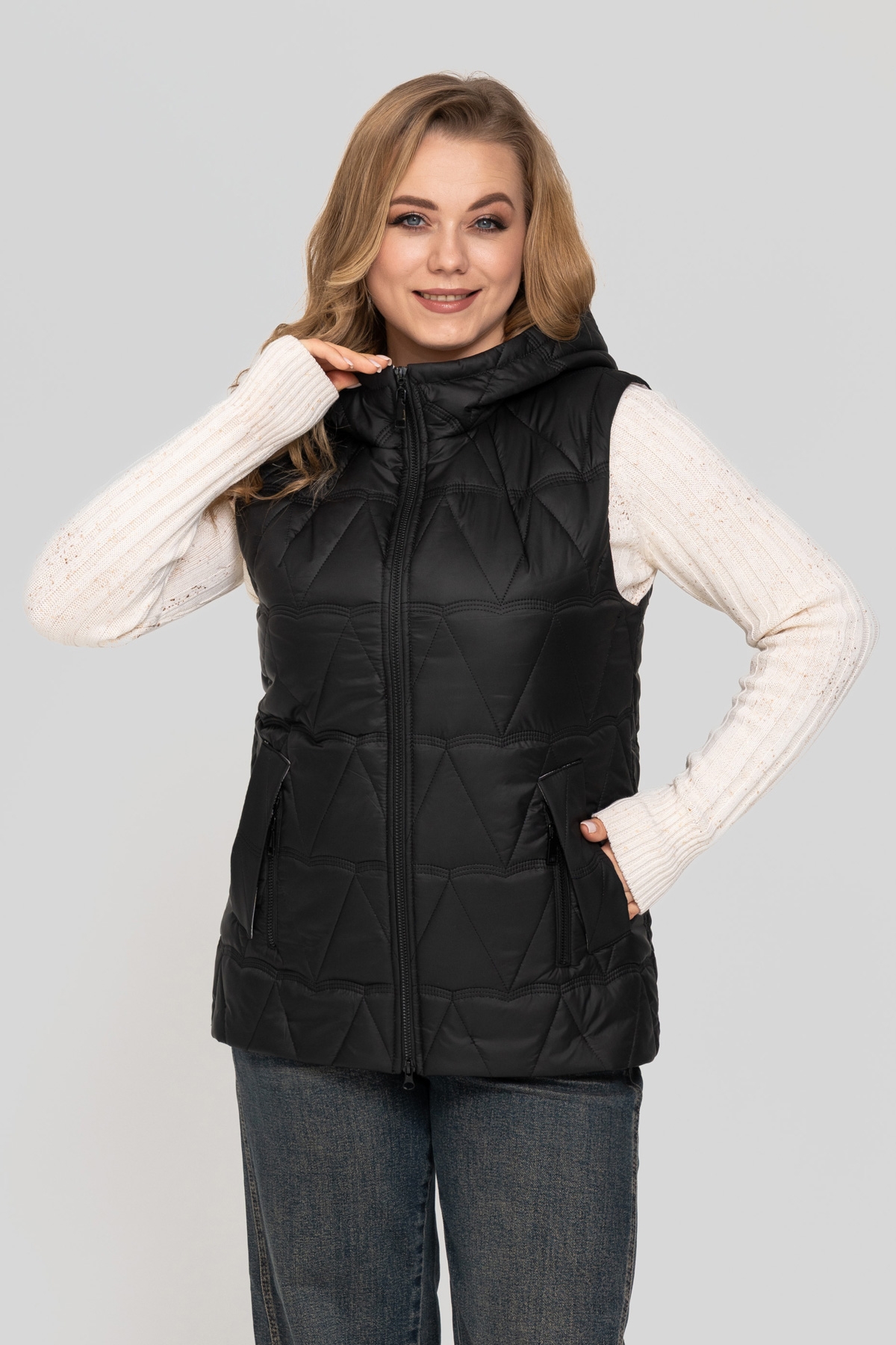 Жилет прямого силуету, виконаний з плащової тканини. Наповнювач: тінсулейт 150 г/м². Застібка на блискавку. Кишеня з фігурним листочком, декорована блискавкою. Капюшон вшитий. Підкладка: нейлон.