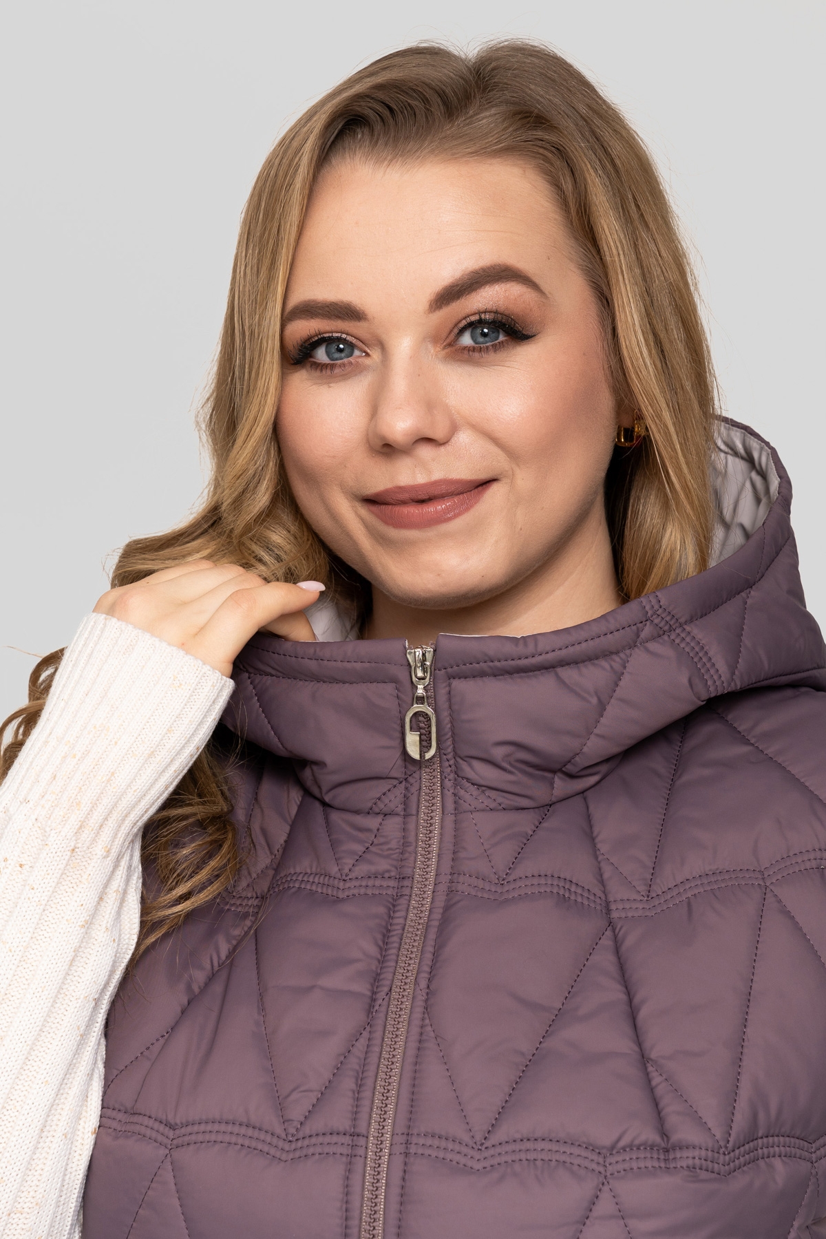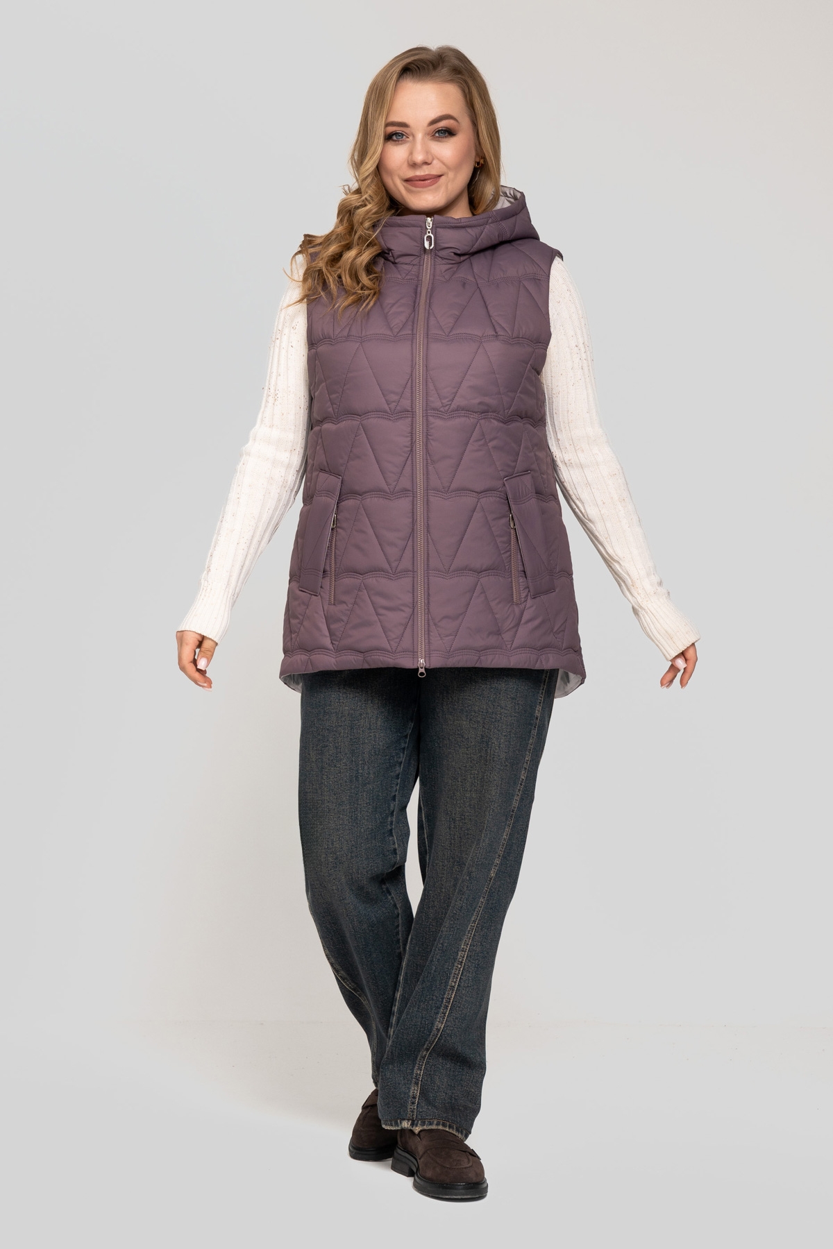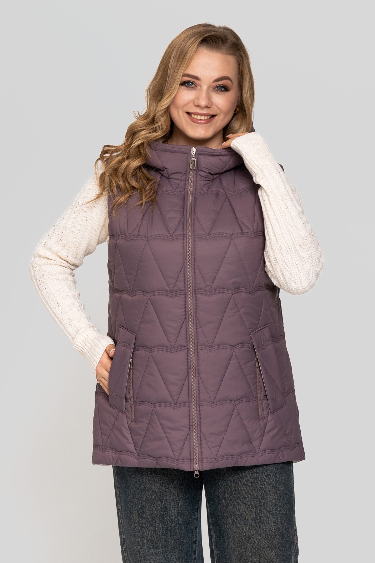 Жилет прямого силуету, виконаний з плащової тканини. Наповнювач: тінсулейт 150 г/м². Застібка на блискавку. Кишеня з фігурним листочком, декорована блискавкою. Капюшон вшитий. Підкладка: нейлон.
